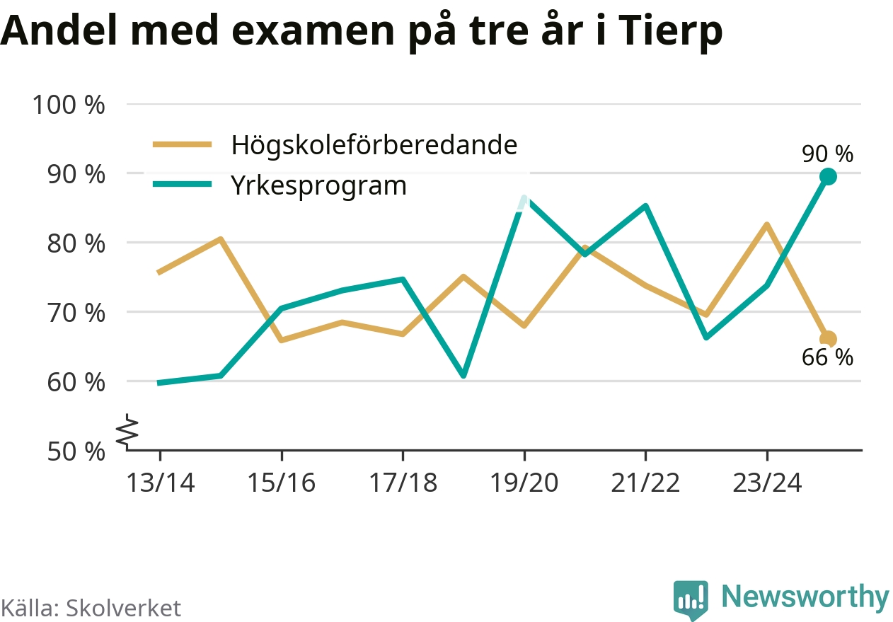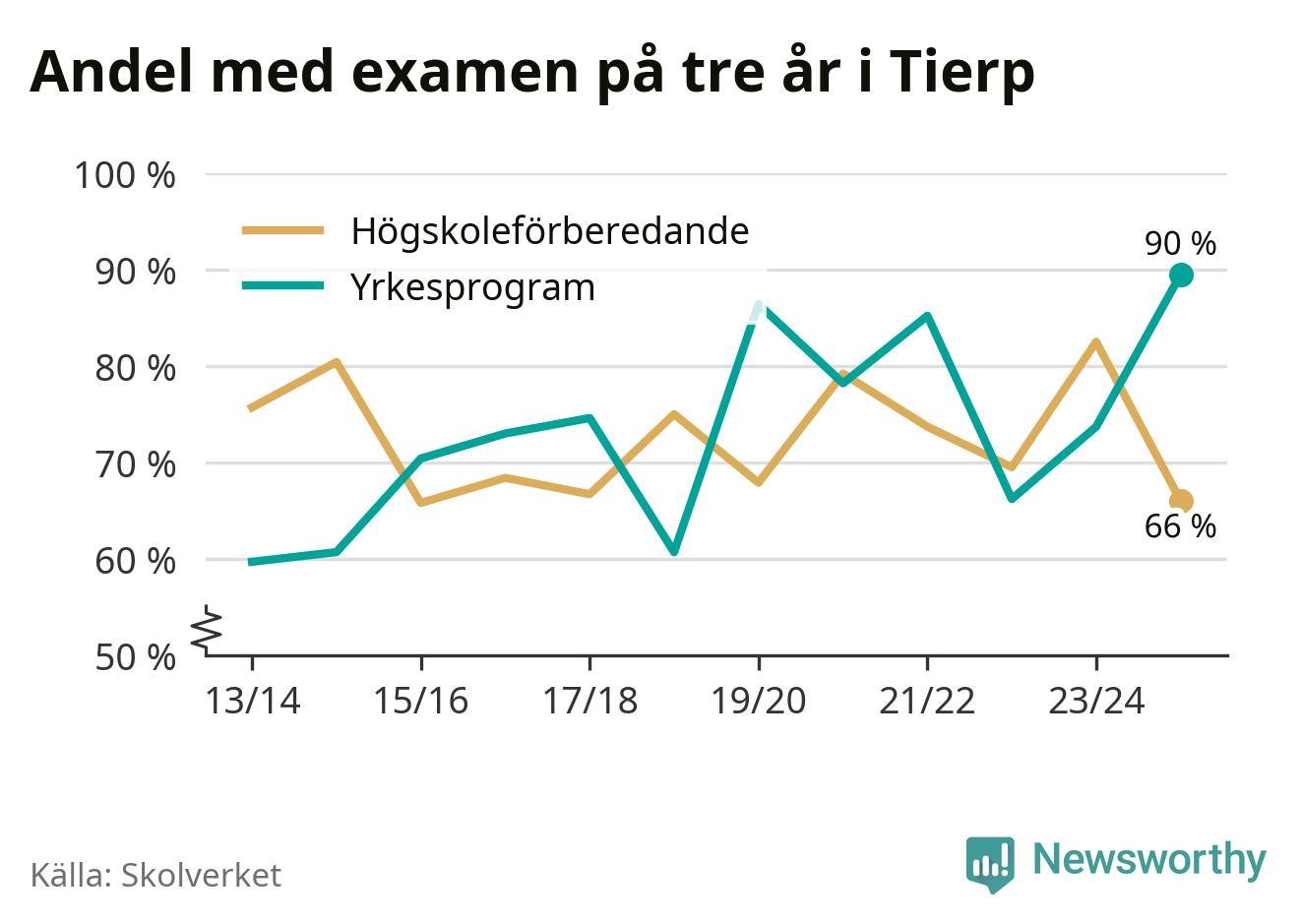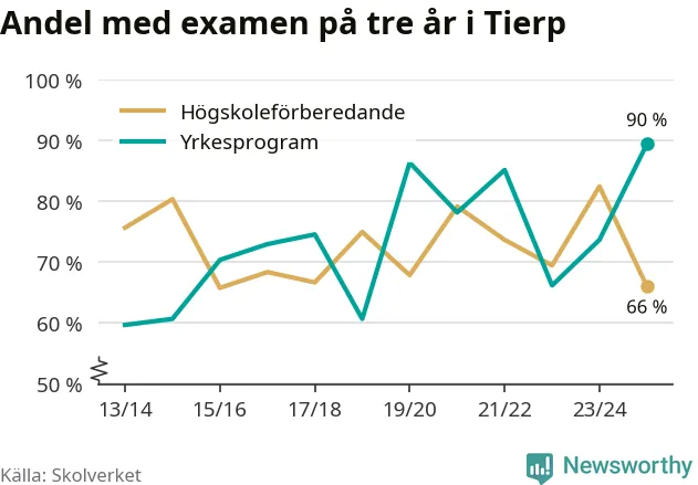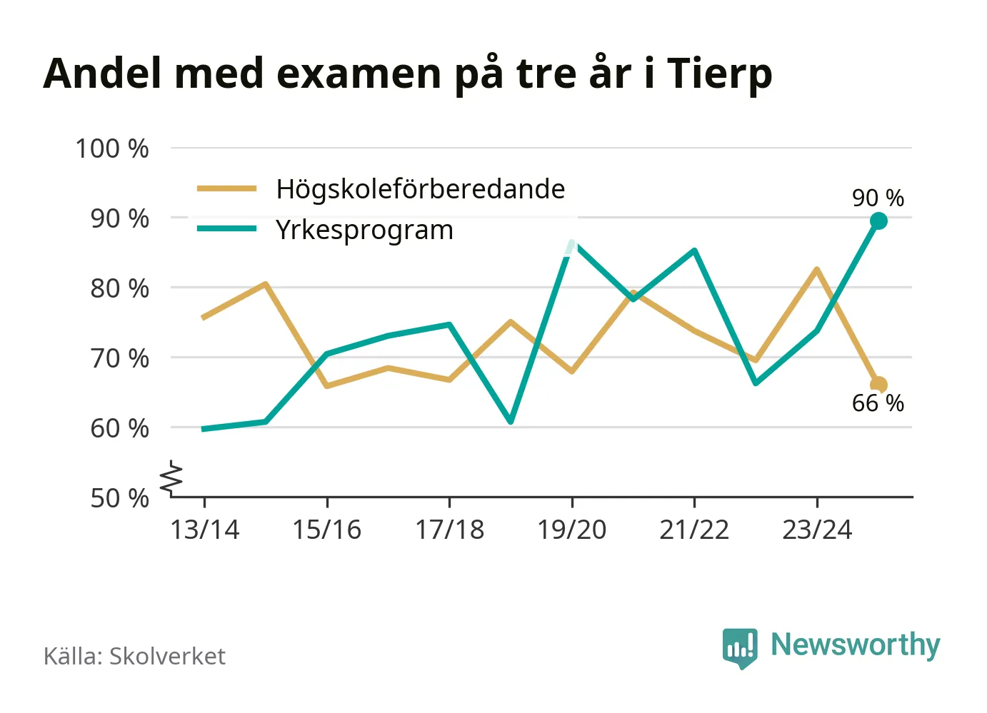 Inte sedan åtminstone läsåret 2013/14 har andelen elever som klarat gymnasieexamen på yrkesprogram varit högre i Tierp. Det visar Skolverkets senaste statistik.
