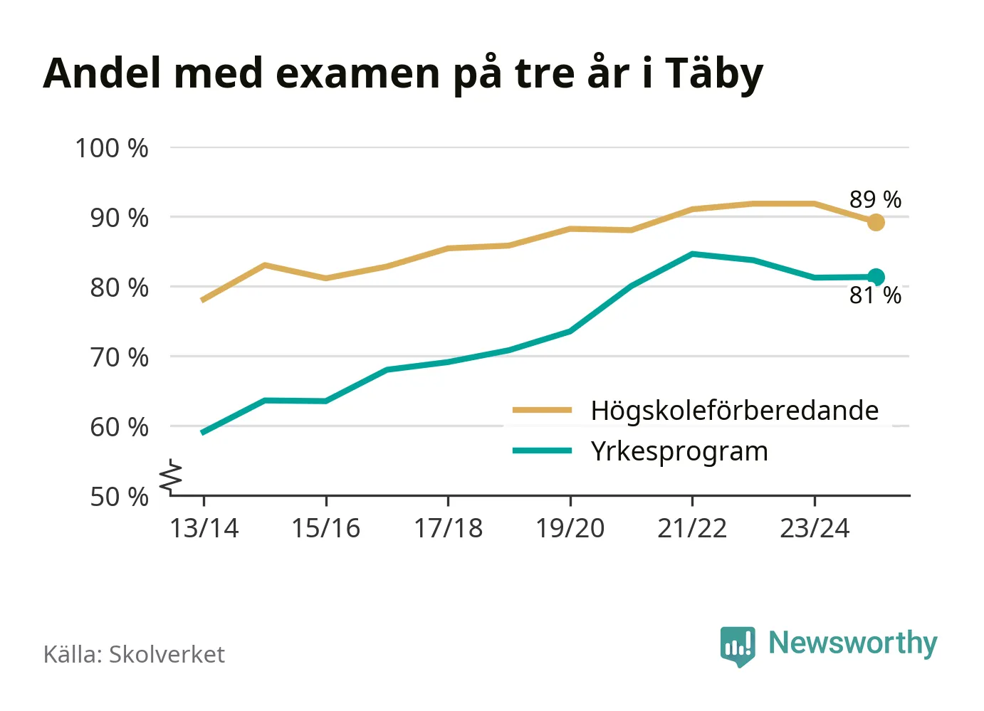 Enligt Skolverket är den främsta anledningen att andelen elever som har avbrutit eller förlängt sina gymnasiestudier minskat. Samtidigt har fler elever på högskoleförberedande program blivit godkända på gymnasiearbetet.