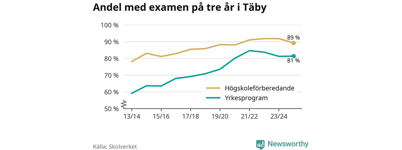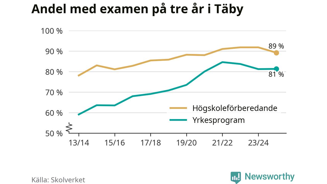 Högst andel som klarade examen i Täby kommun, de nationella programmen sammantaget, fanns på Tibble Gymnasium Campus Täby, där eleverna läser på barn- och fritidsprogrammet. Där klarade 96 procent av de 600 elever som började gymnasiet 2022/23 examen i våras. Det är en högre siffra än i riket som helhet.