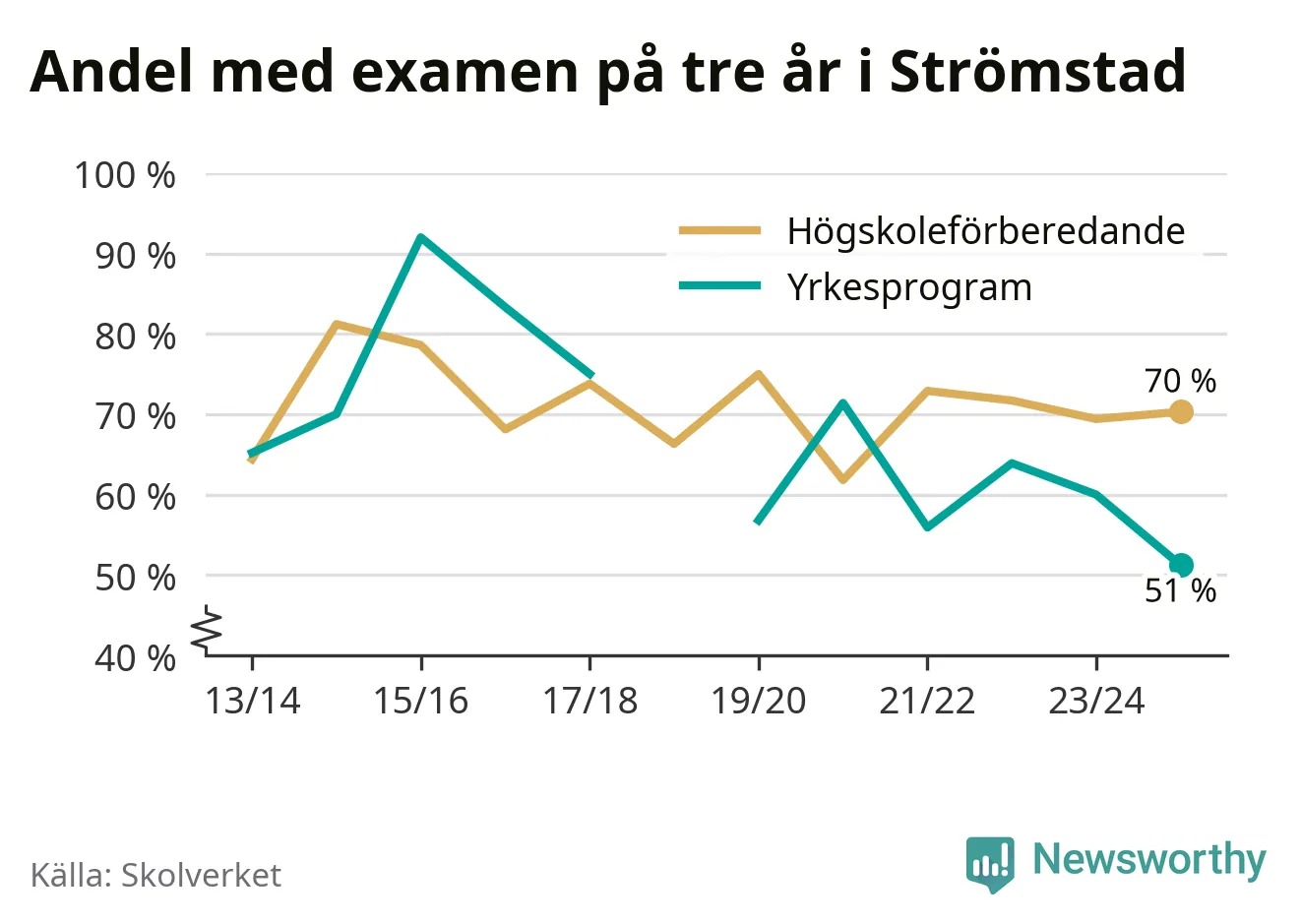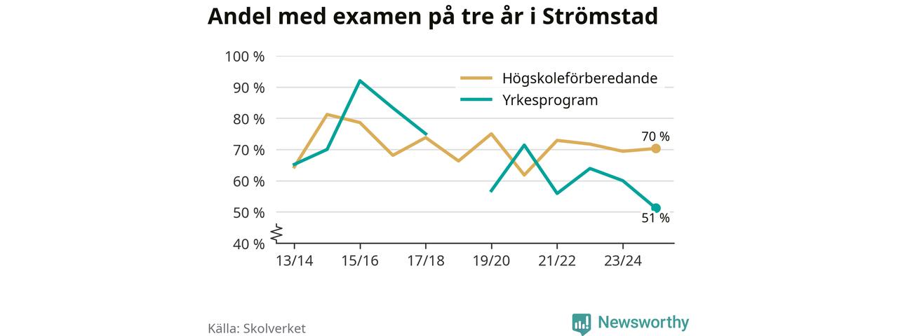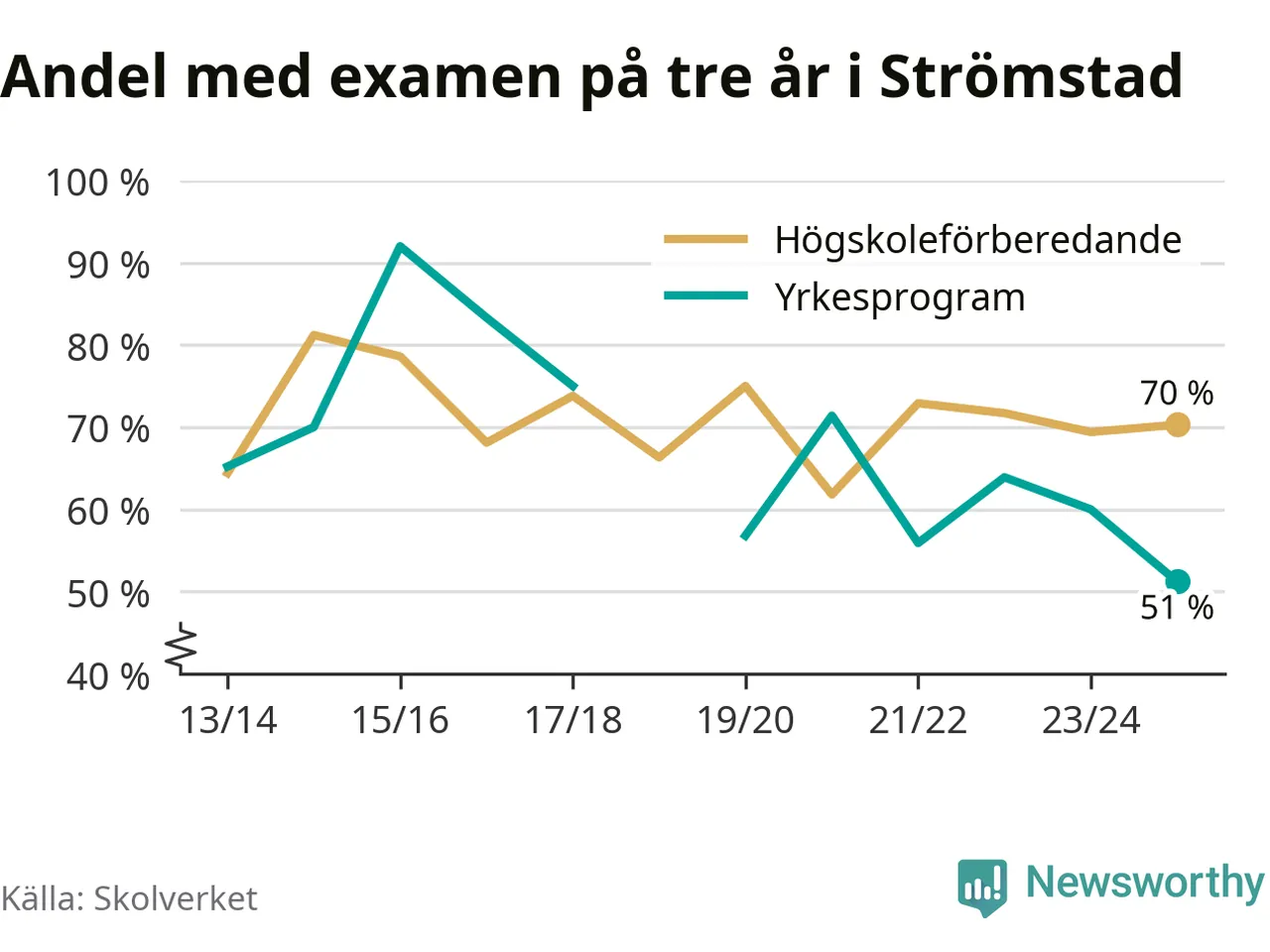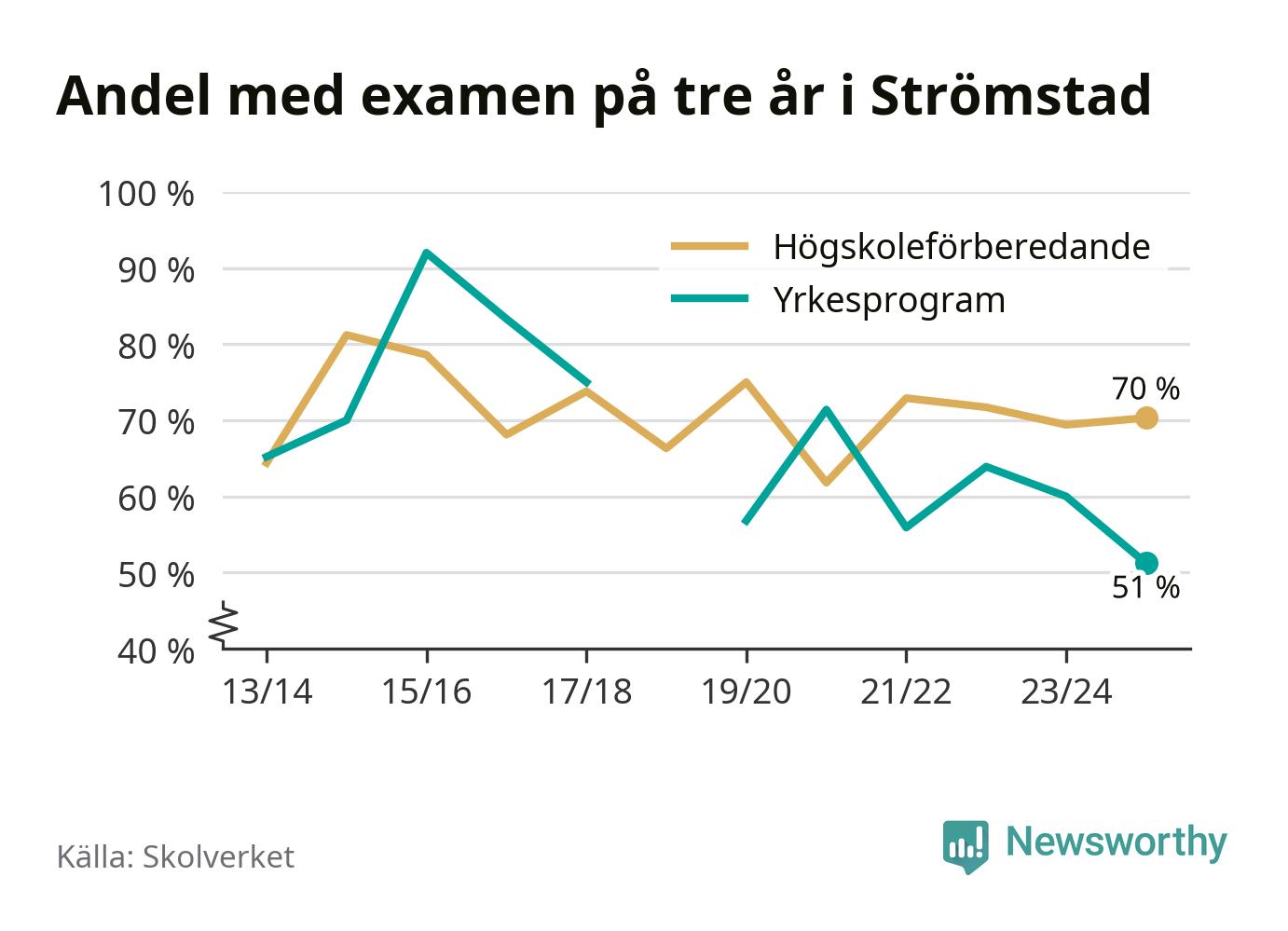 När eleverna på de yrkesförberedande programmen på Strömstad Gymnasium, SGY2 och Strömstad Gymnasium, SGY1 sprang ut i våras hade 51 procent klarat gymnasieexamen på tre år. Det är nio procentenheter färre än året innan.