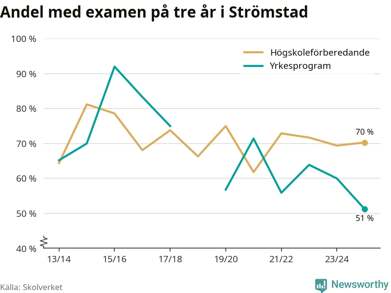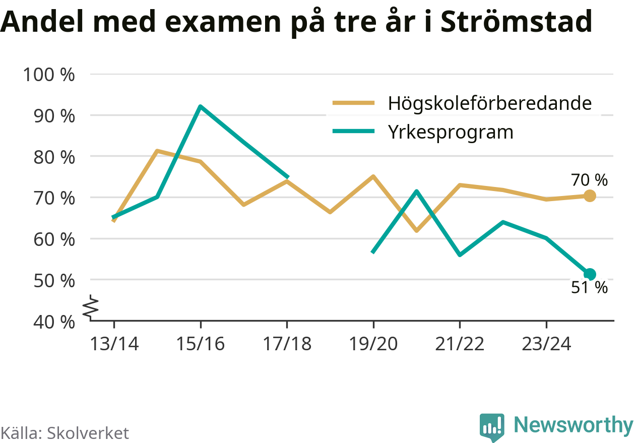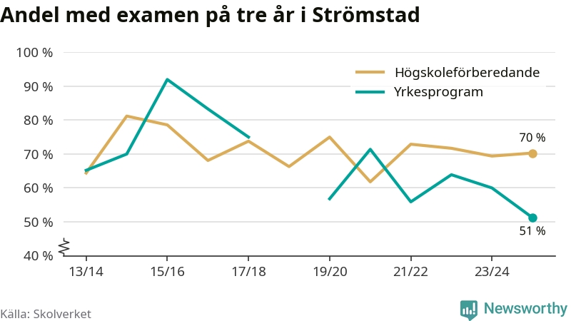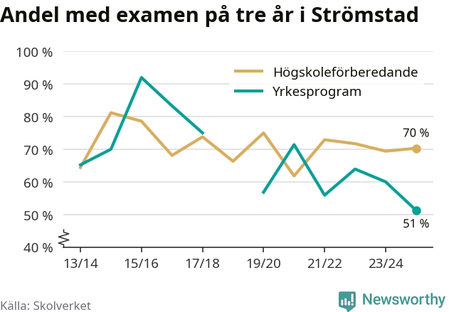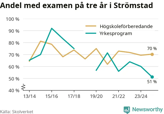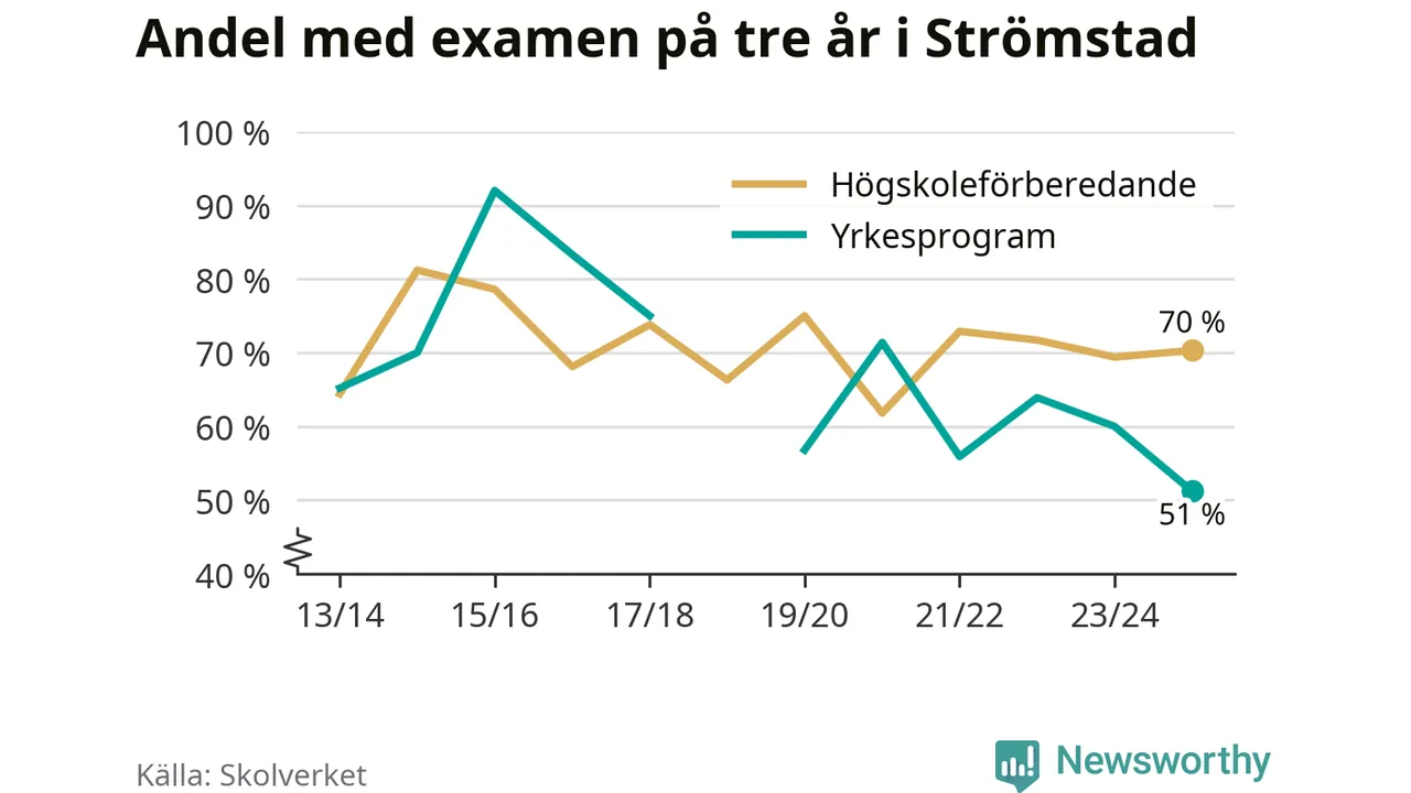 När eleverna på de yrkesförberedande programmen på Strömstad Gymnasium, SGY2 och Strömstad Gymnasium, SGY1 sprang ut i våras hade 51 procent klarat gymnasieexamen på tre år. Det är nio procentenheter färre än året innan.