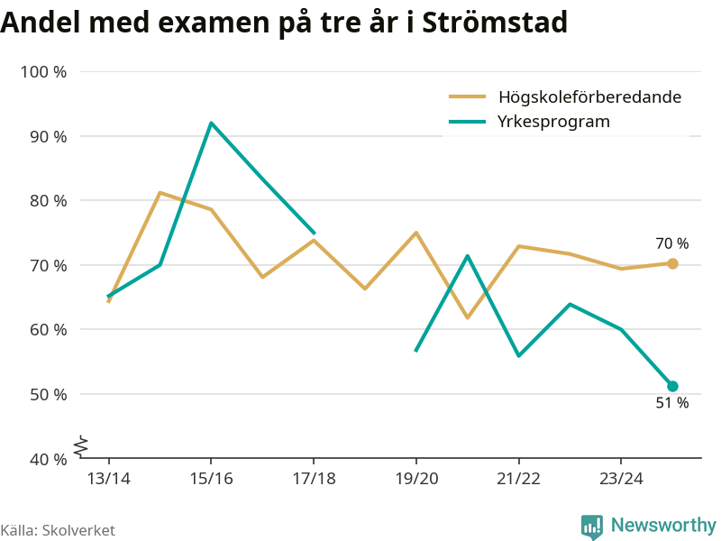 Enligt Skolverket är den främsta anledningen att andelen elever som har avbrutit eller förlängt sina gymnasiestudier minskat. Samtidigt har fler elever på högskoleförberedande program blivit godkända på gymnasiearbetet.