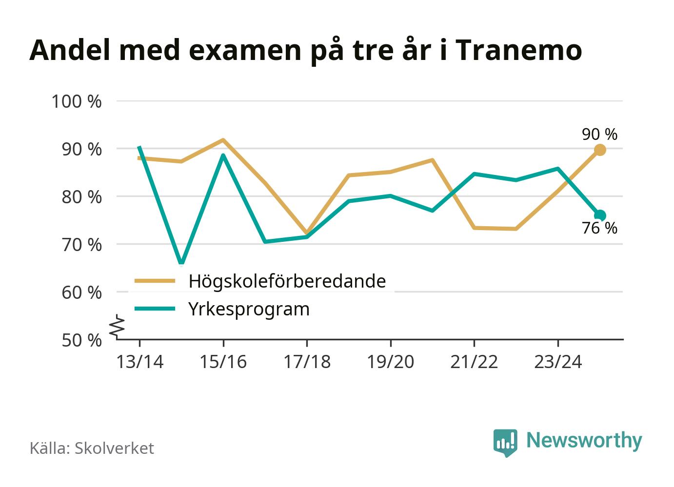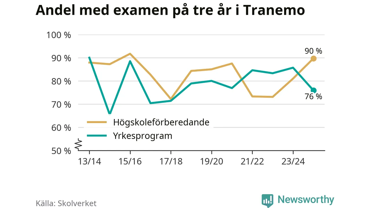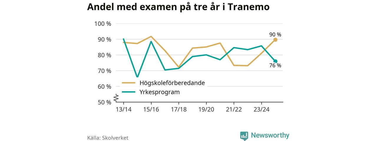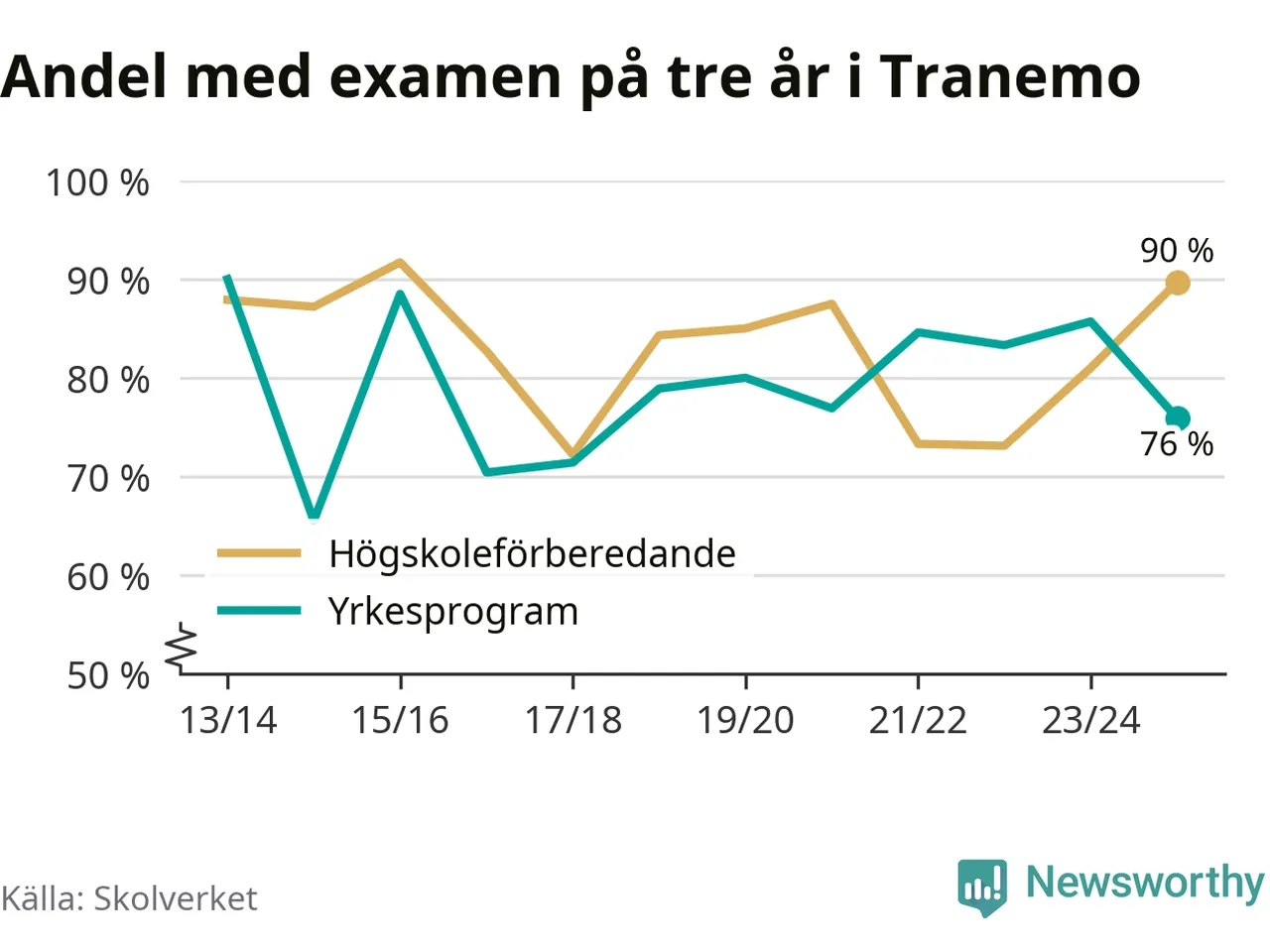 När eleverna på de yrkesförberedande programmen på Tranemo gymnasieskola sprang ut i våras hade 76 procent klarat gymnasieexamen på tre år. Det är tio procentenheter färre än året innan och inte sedan kullen som tog studenten läsåret 2017/18 har andelen varit lägre.