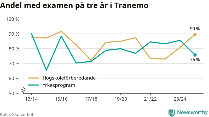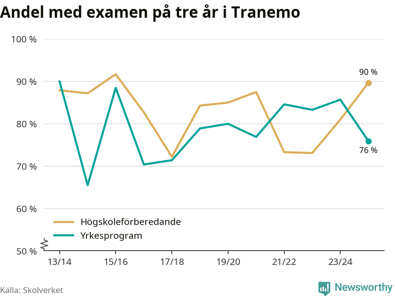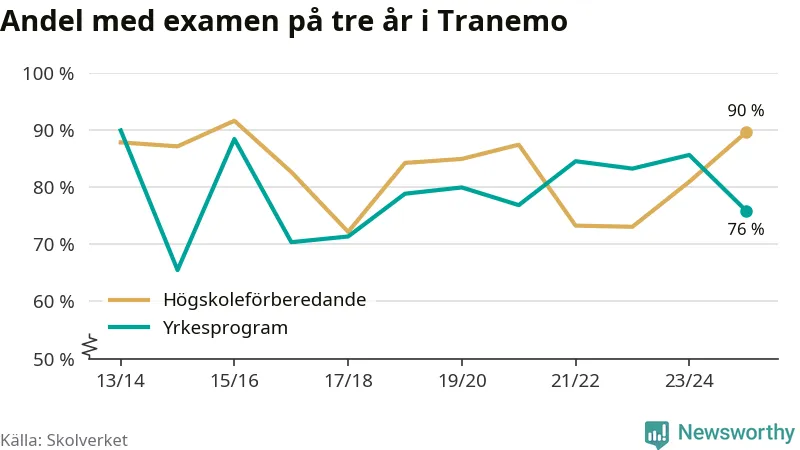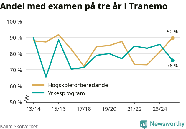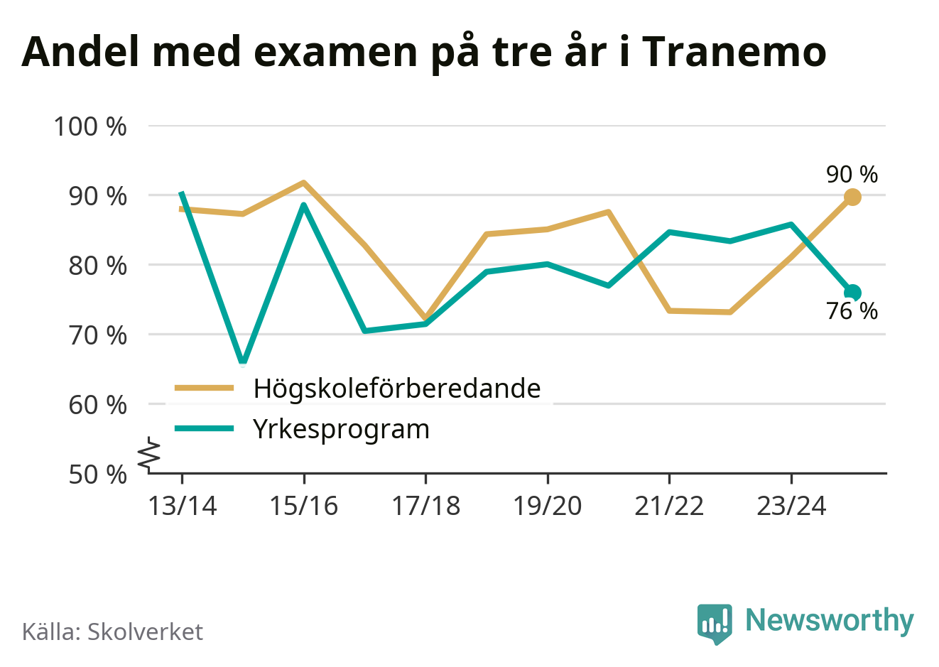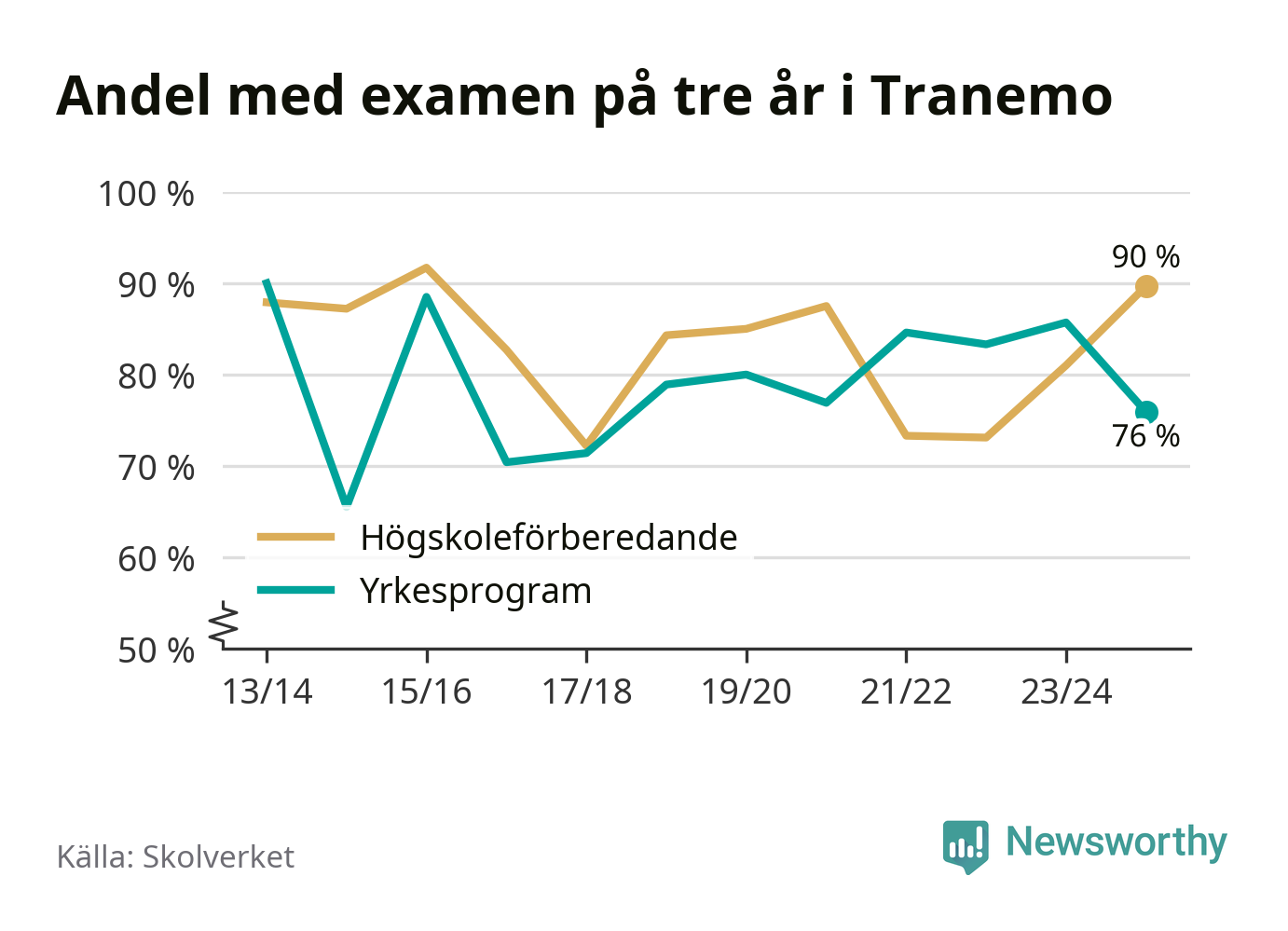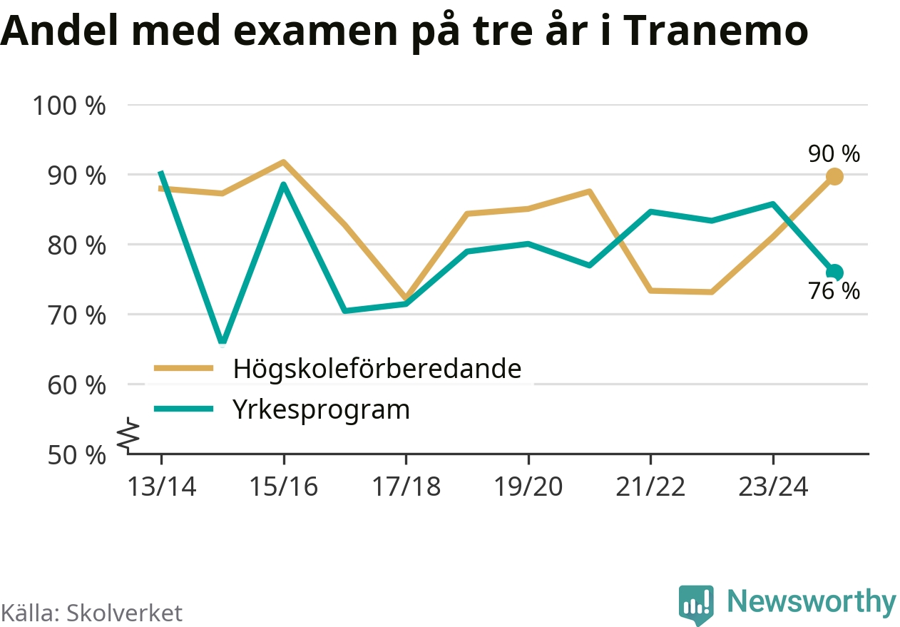 När eleverna på de yrkesförberedande programmen på Tranemo gymnasieskola sprang ut i våras hade 76 procent klarat gymnasieexamen på tre år. Det är tio procentenheter färre än året innan och inte sedan kullen som tog studenten läsåret 2017/18 har andelen varit lägre.