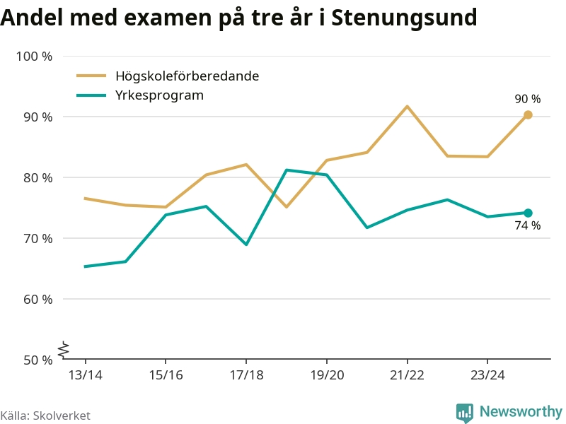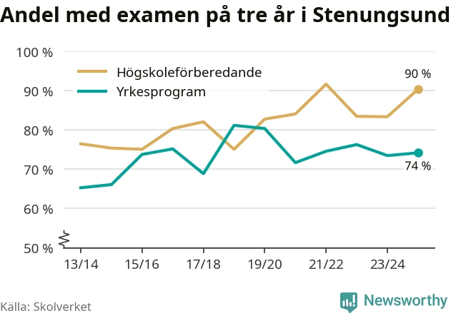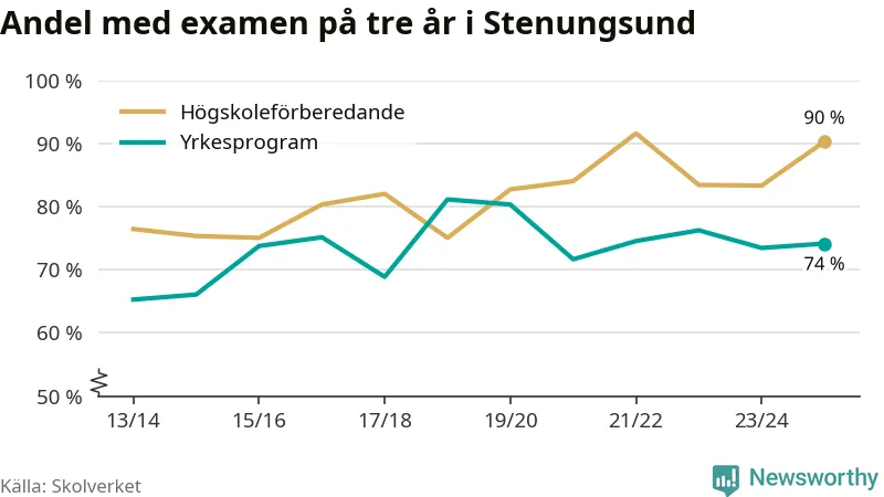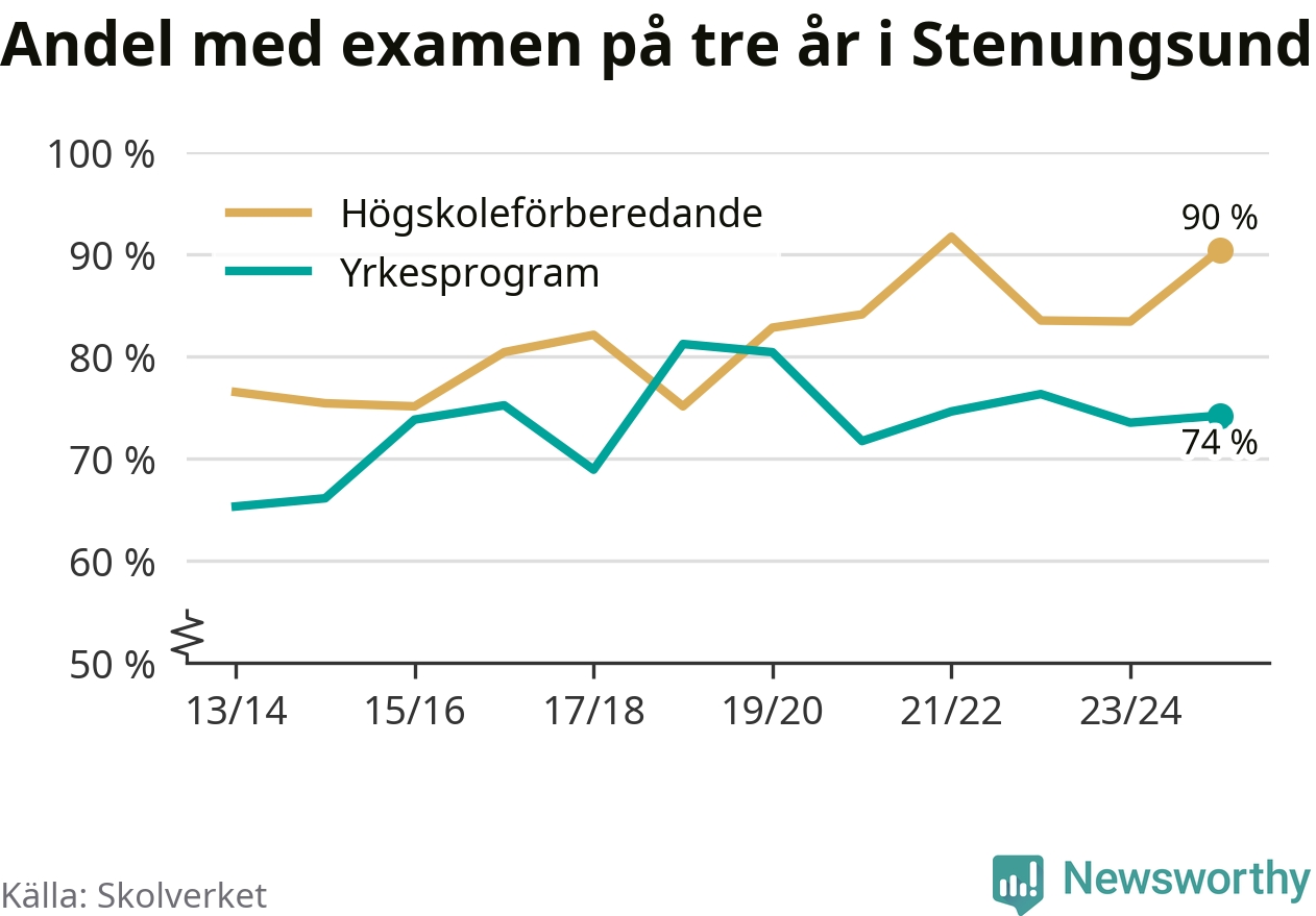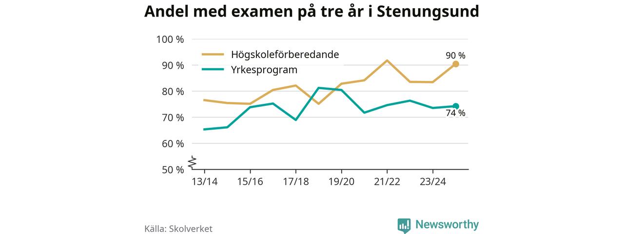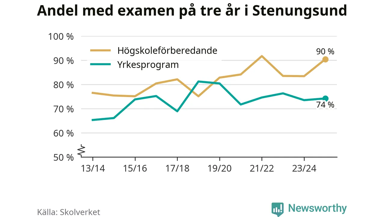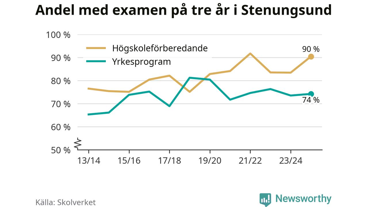 Högst andel som klarade examen i Stenungsunds kommun, de nationella programmen sammantaget, fanns på Nösnäsgymnasiet 4, där eleverna läser på teknikprogrammet. Där klarade 96 procent av de 121 elever som började gymnasiet 2022/23 examen i våras. Det är en högre siffra än i riket som helhet.