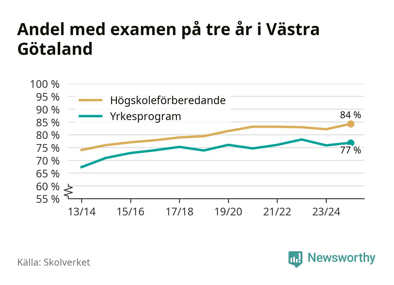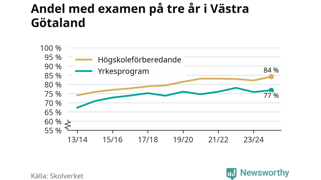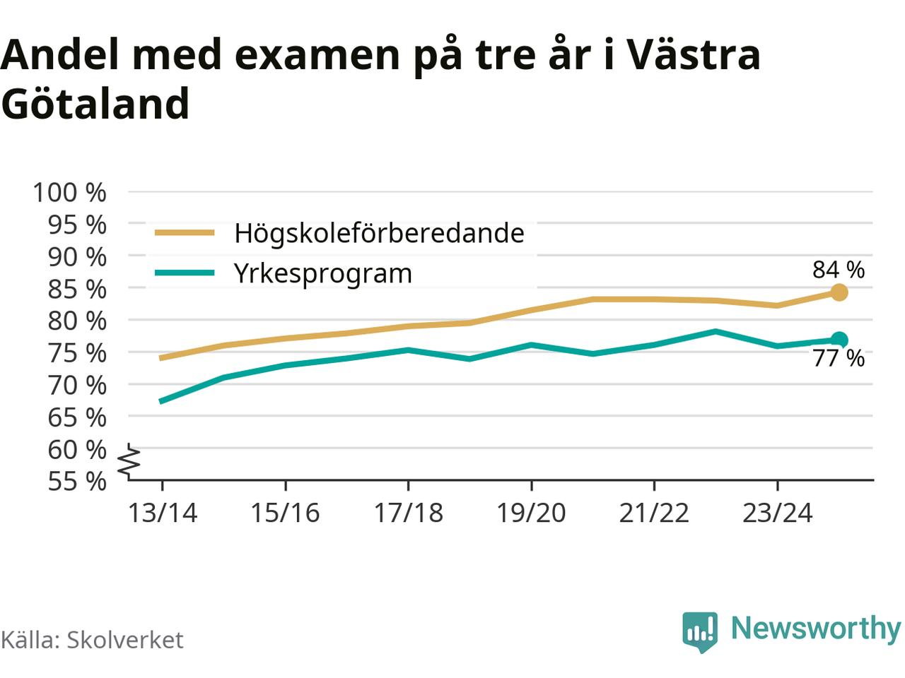 Inte sedan åtminstone läsåret 2013/14 har andelen elever som klarat gymnasieexamen på högskoleförberedande program varit högre i Västra Götaland. Det visar Skolverkets senaste statistik.