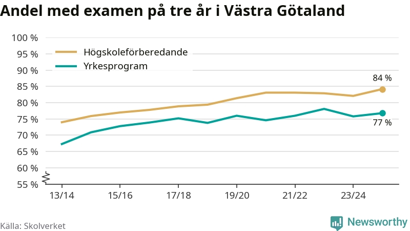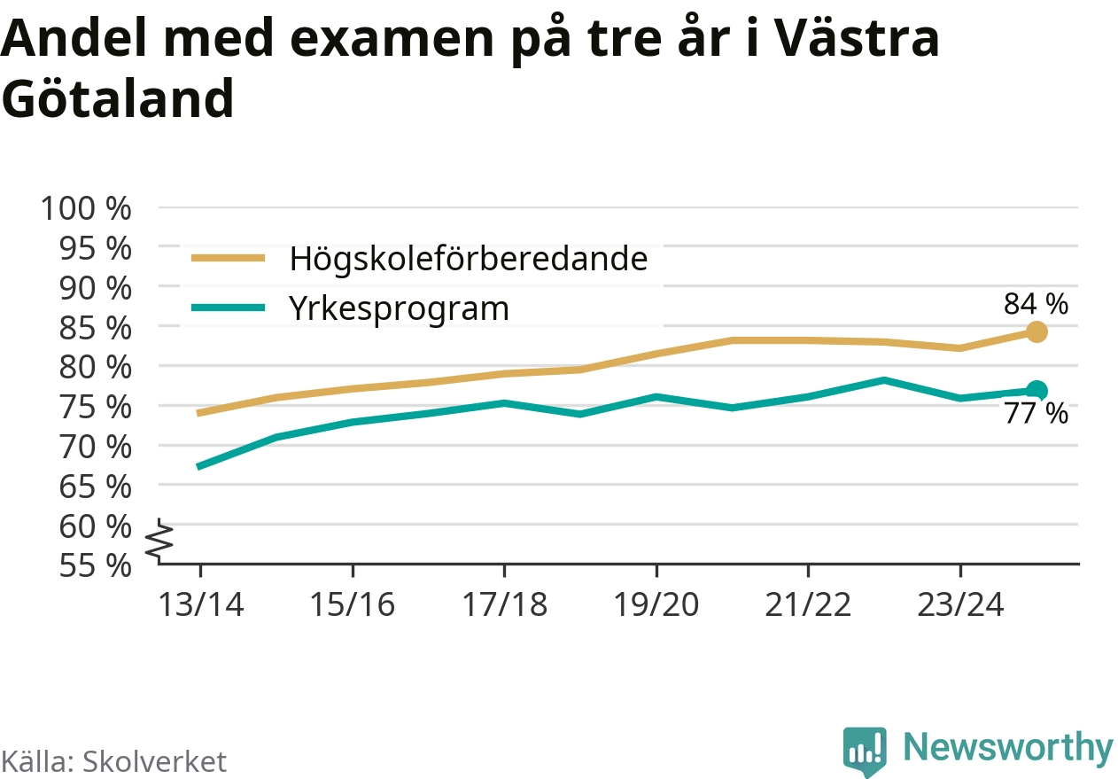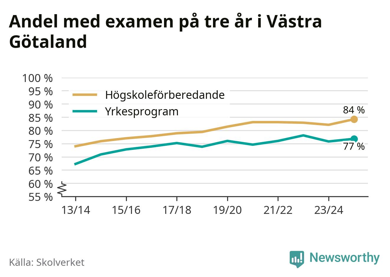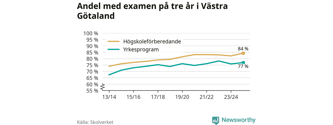Inte sedan åtminstone läsåret 2013/14 har andelen elever som klarat gymnasieexamen på högskoleförberedande program varit högre i Västra Götaland. Det visar Skolverkets senaste statistik.