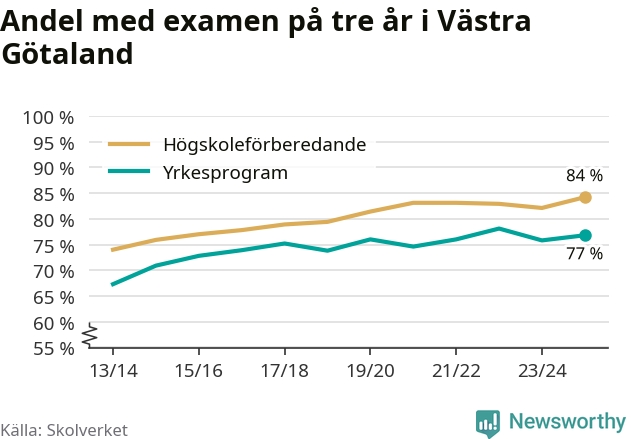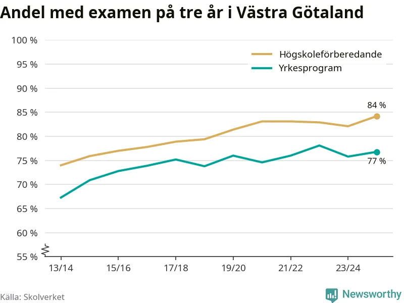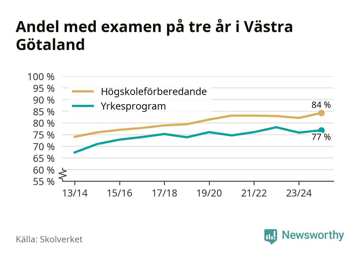 Bland deras kamrater på högskoleförberedande program hade 84 procent klarat examen på tre år – vilket är två procentenheter mer än året innan. Det är den högsta andelen sedan åtminstone läsåret 2013/14.