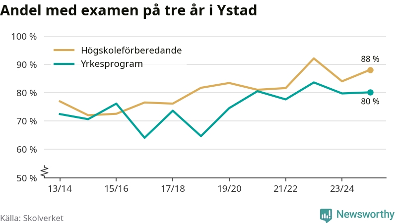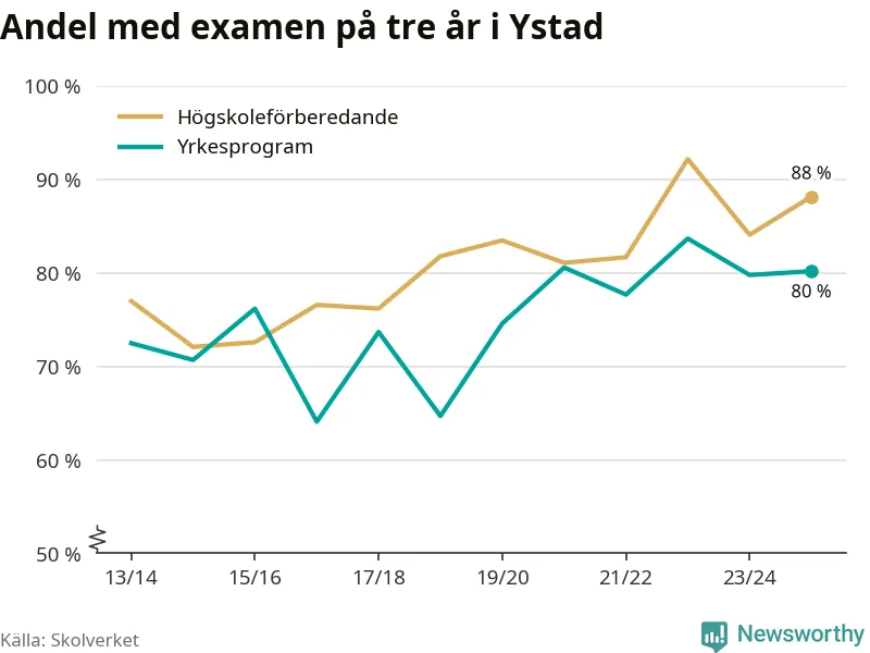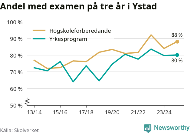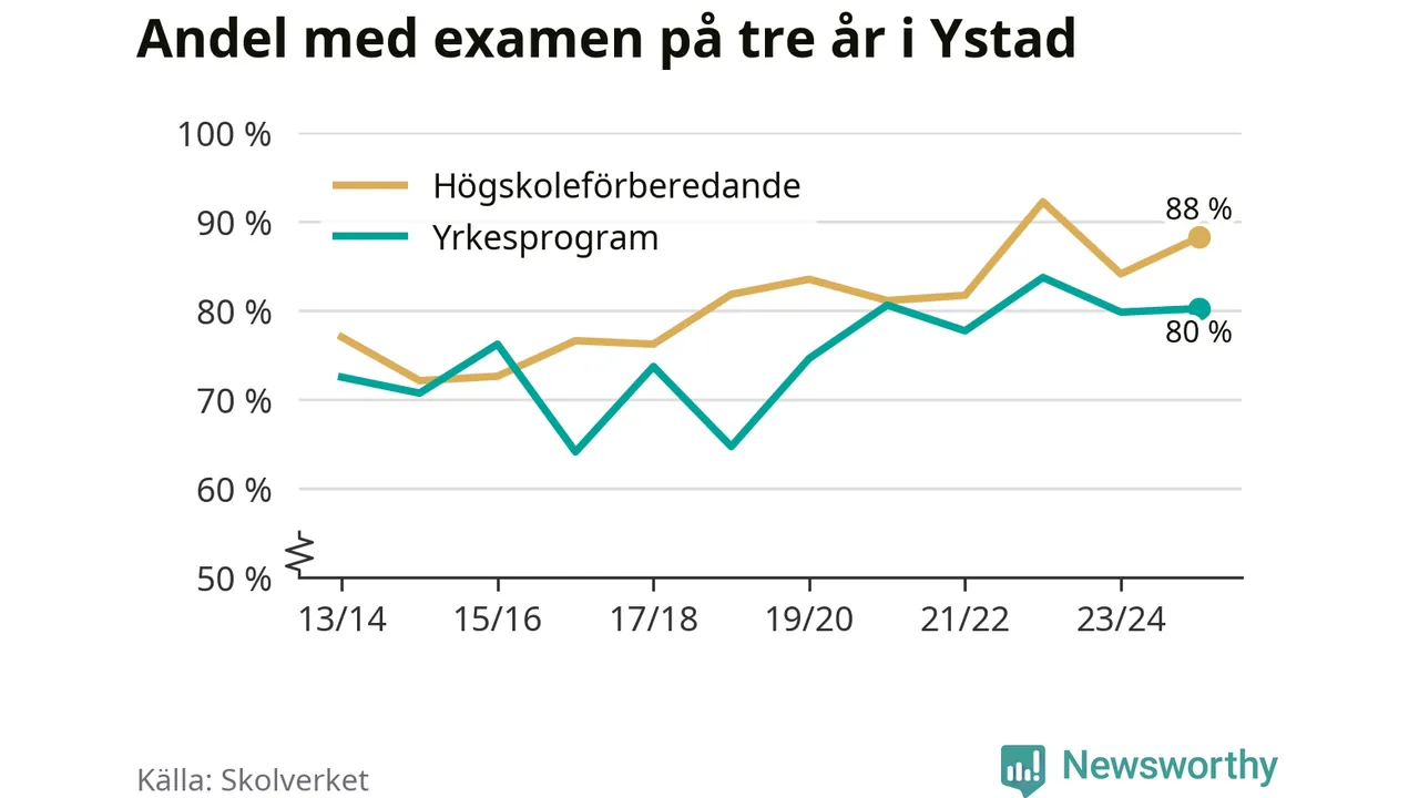 När eleverna på de yrkesförberedande programmen i Ystads kommun sprang ut i våras hade 80 procent klarat gymnasieexamen på tre år. Det är lika stor andel som året innan.
