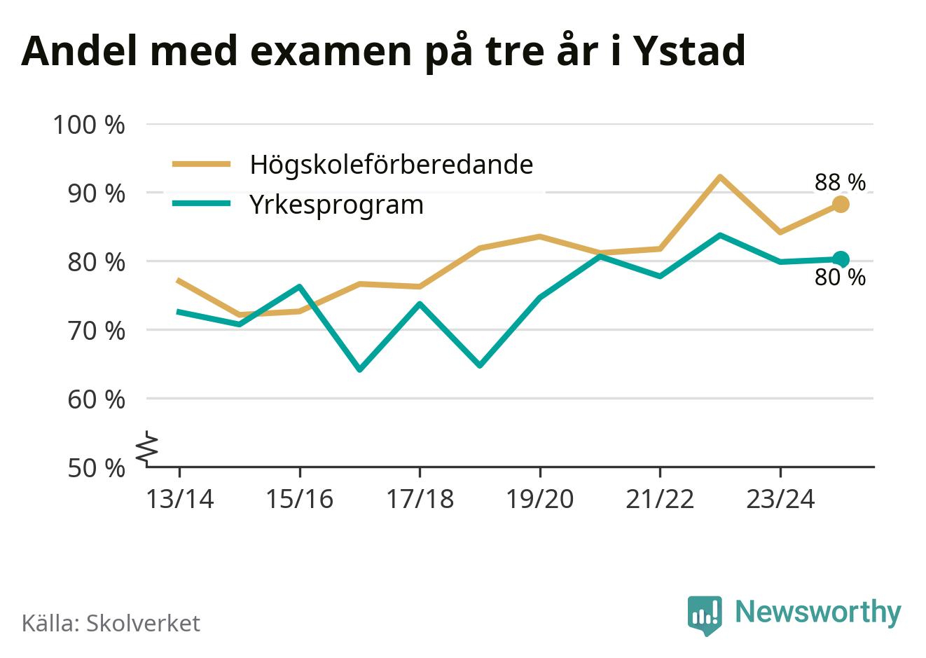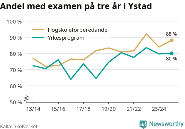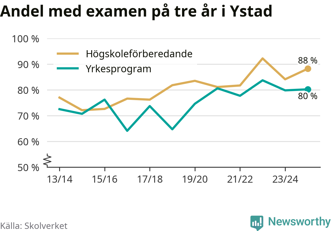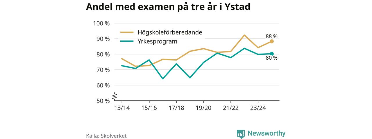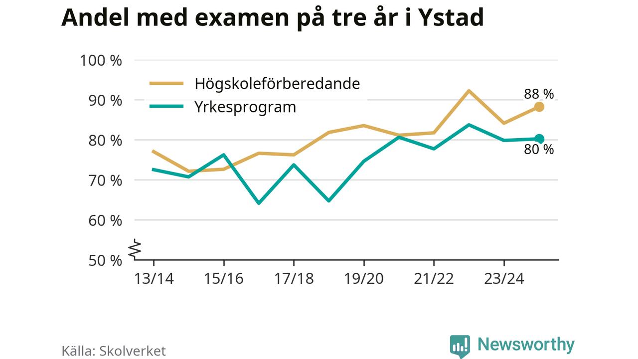 Högst andel som klarade examen i Ystads kommun, de nationella programmen sammantaget, fanns på Ystad Gymnasium, område 6, där eleverna läser på ekonomiprogrammet. Där klarade 98 procent av de 84 elever som började gymnasiet 2022/23 examen i våras. Det är en högre siffra än i riket som helhet.