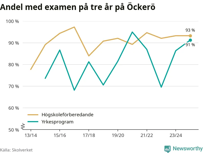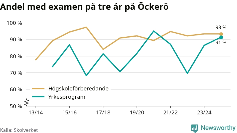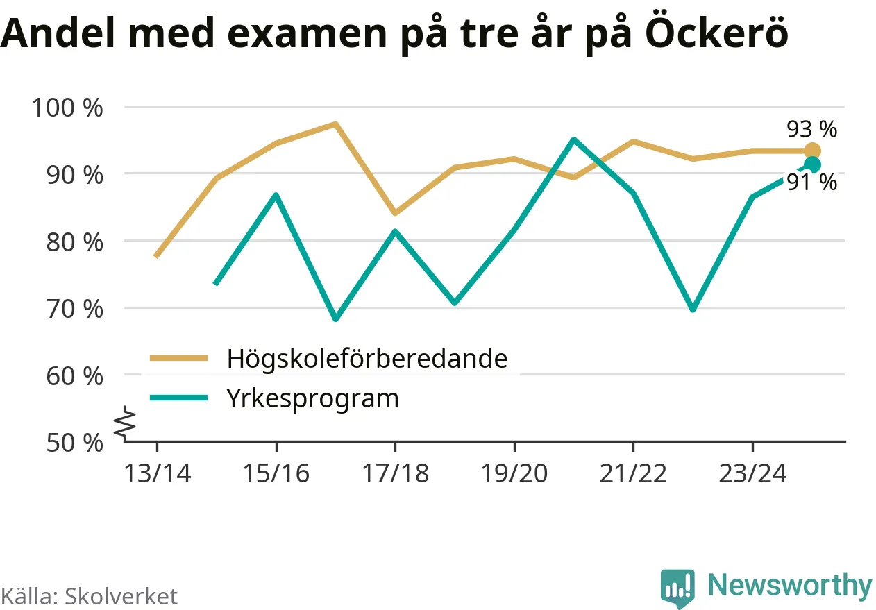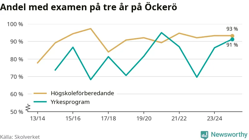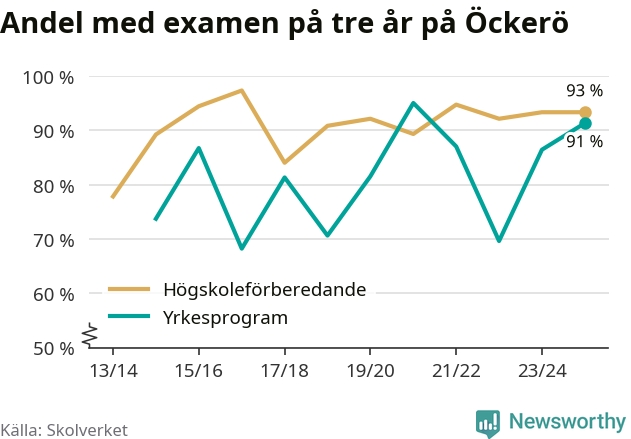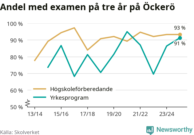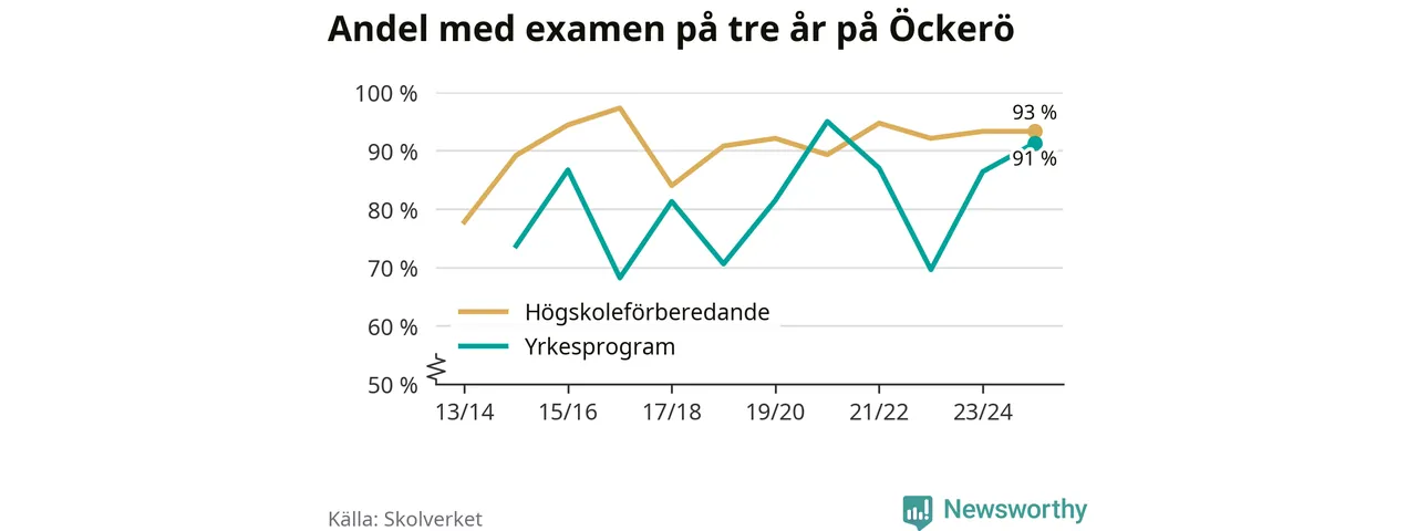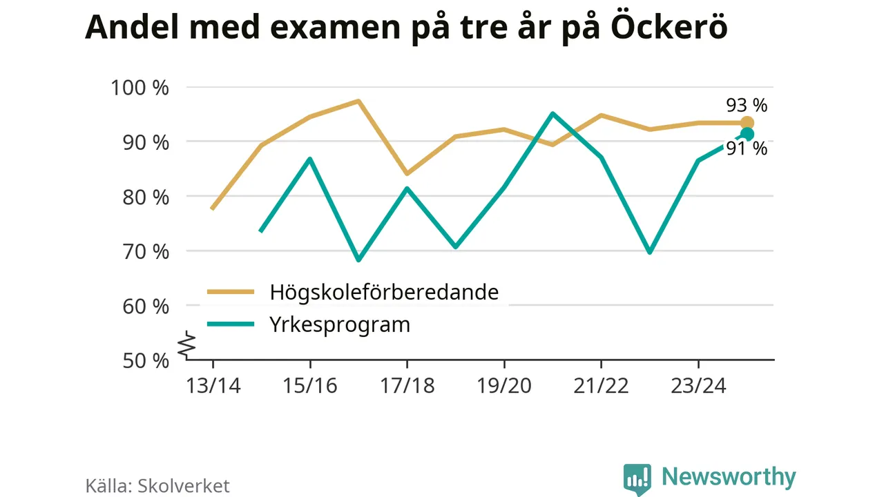 Precis som i riket som helhet ökade andelen som klarade gymnasieexamen från yrkesprogram på tre år på Öckerö.