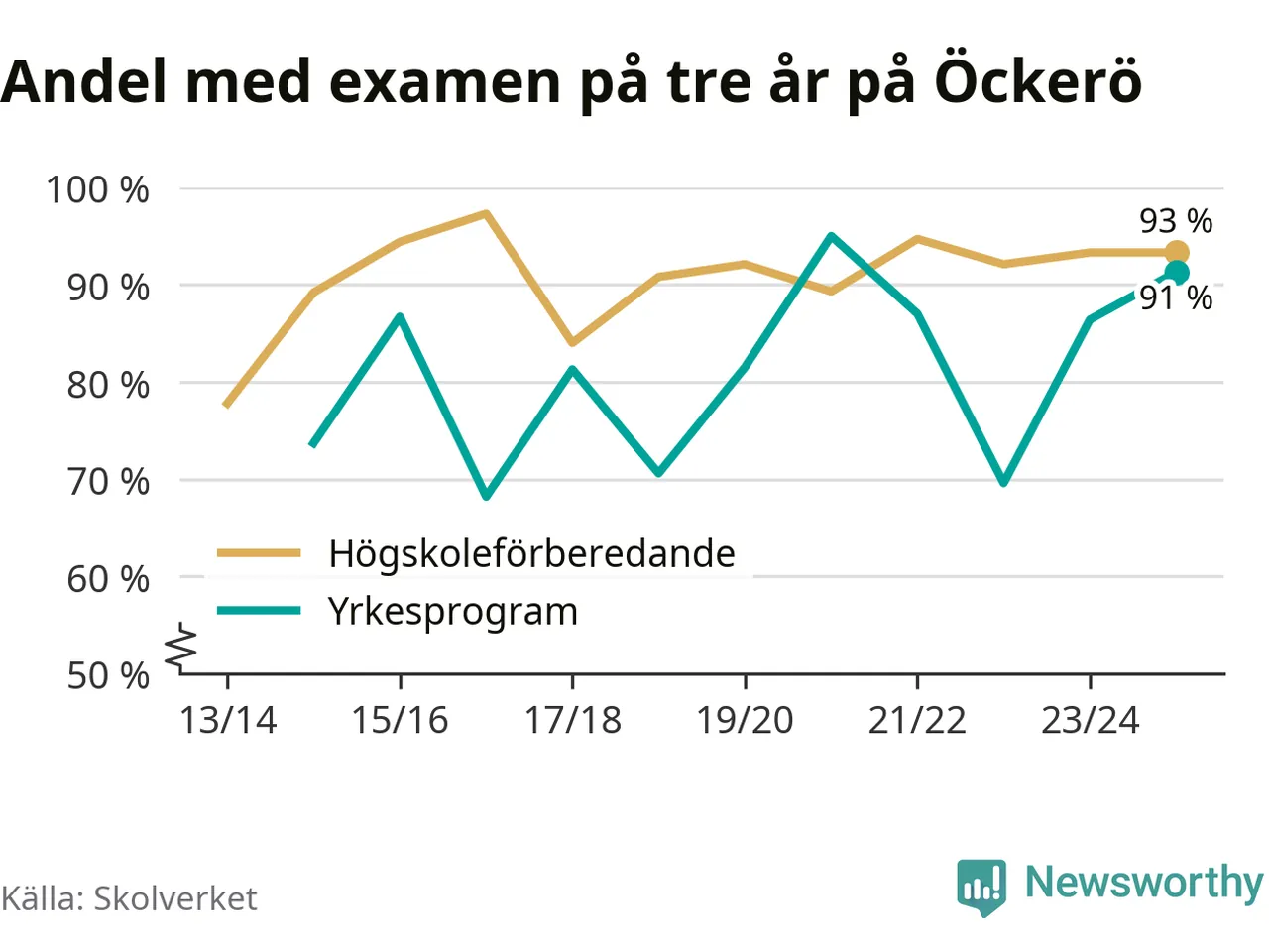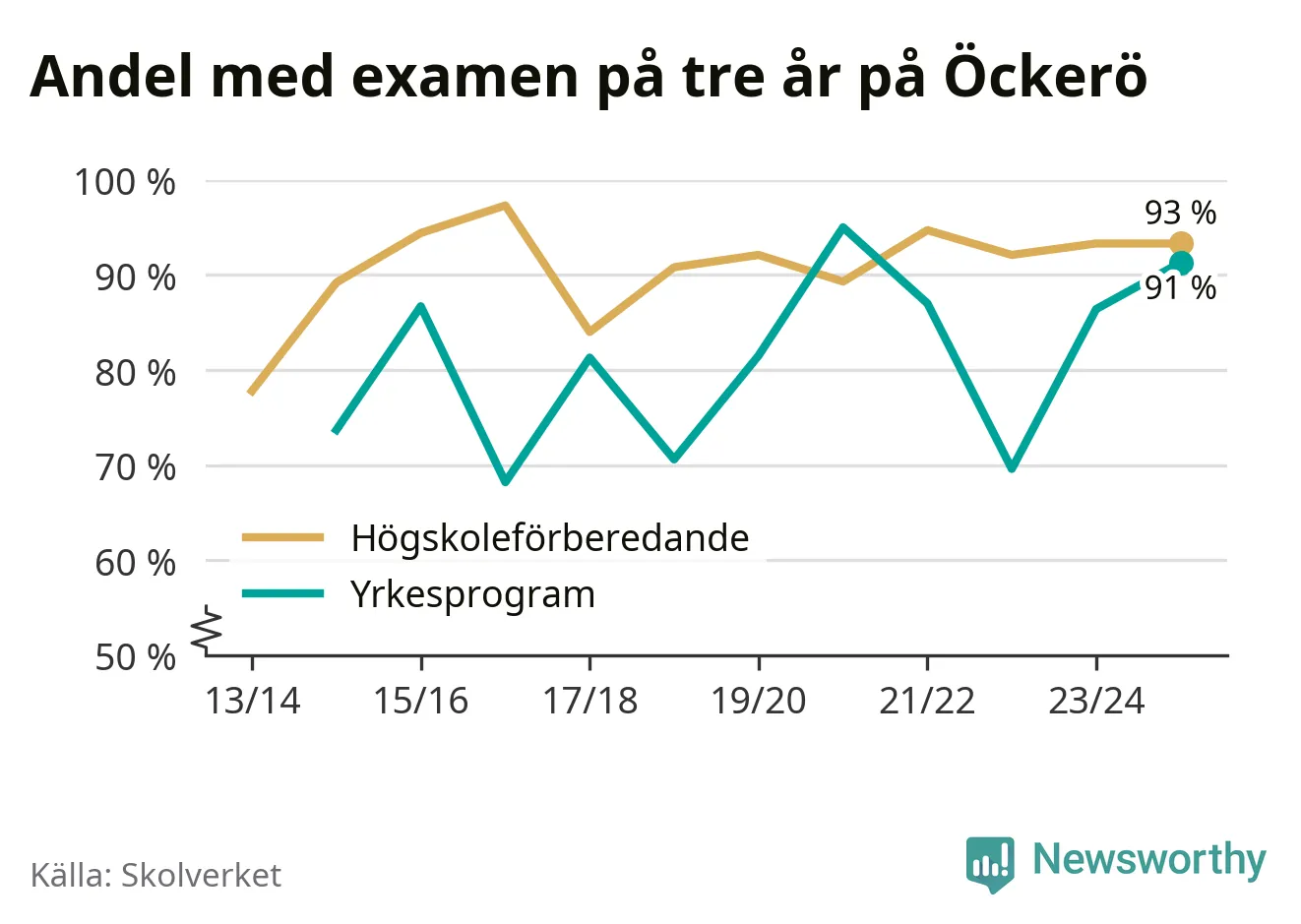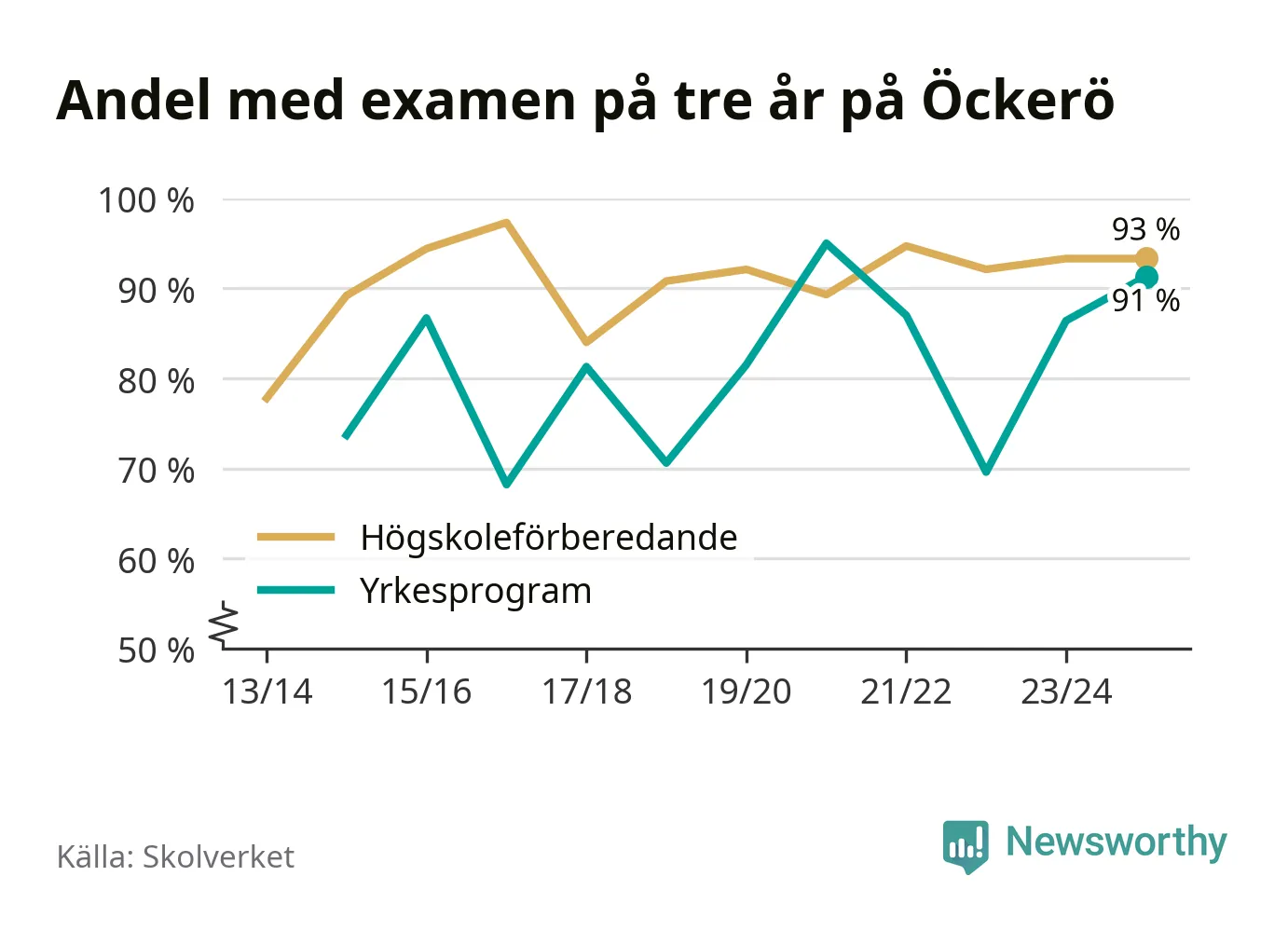 Enligt Skolverket är den främsta anledningen att andelen elever som har avbrutit eller förlängt sina gymnasiestudier minskat. Samtidigt har fler elever på högskoleförberedande program blivit godkända på gymnasiearbetet.