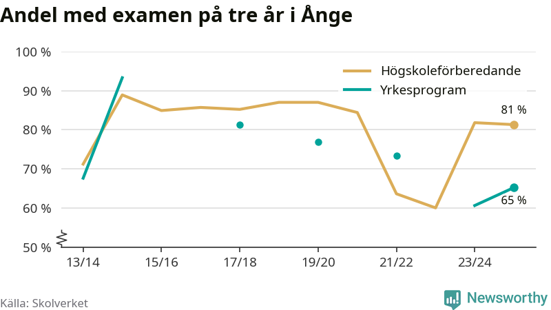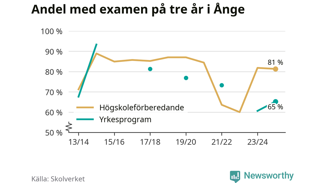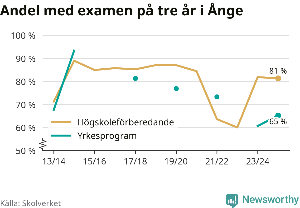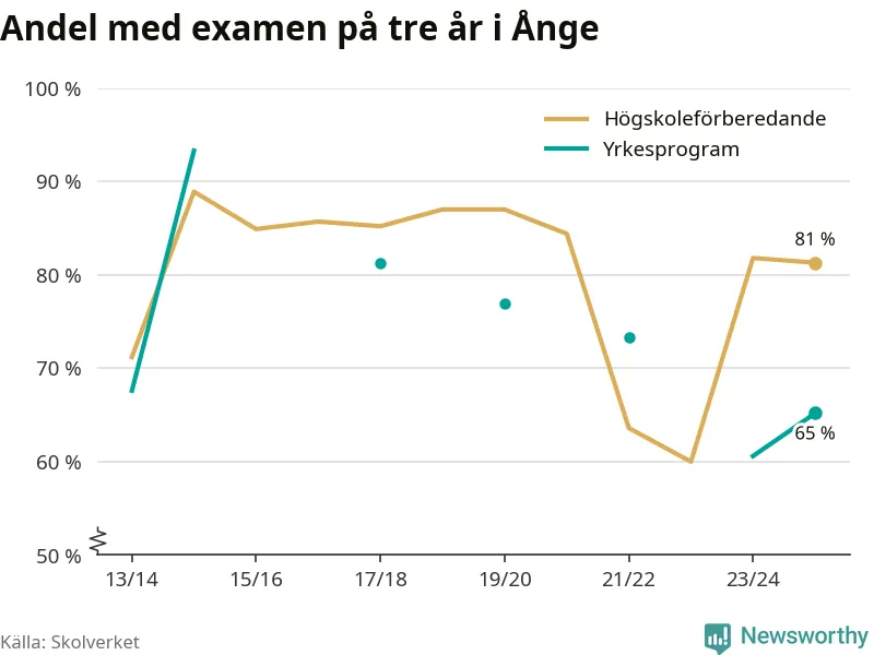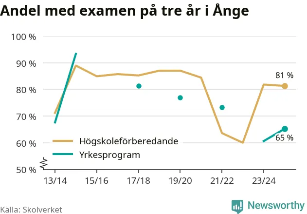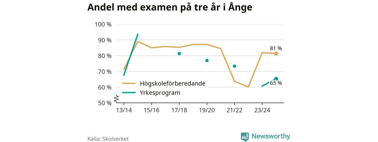 Precis som i riket som helhet ökade andelen som klarade gymnasieexamen från yrkesprogram på tre år i Ånge.