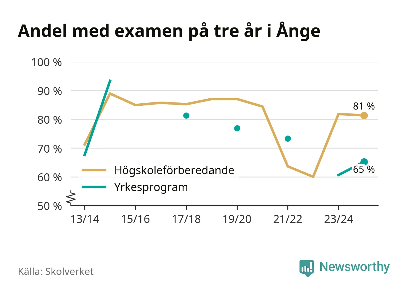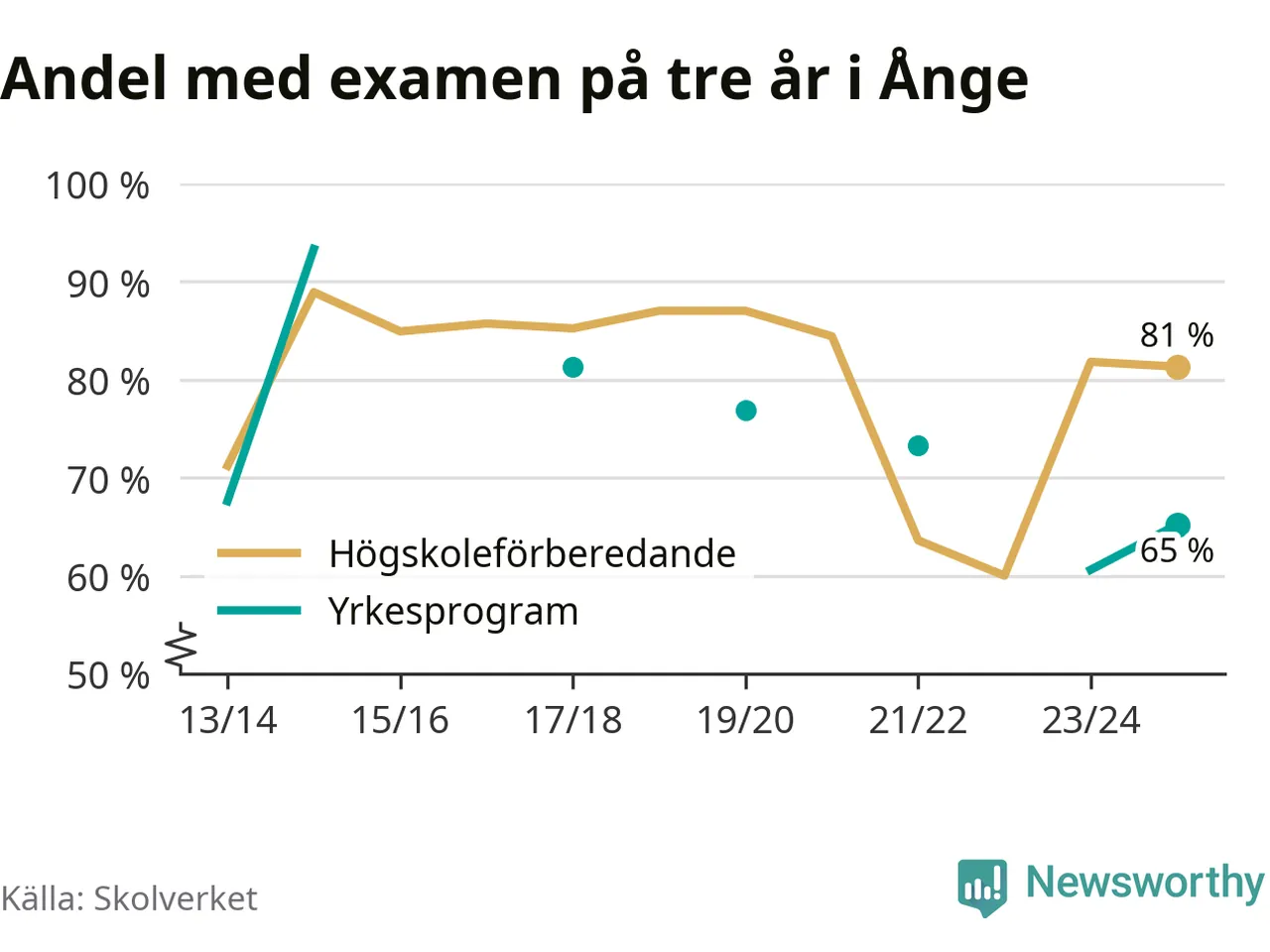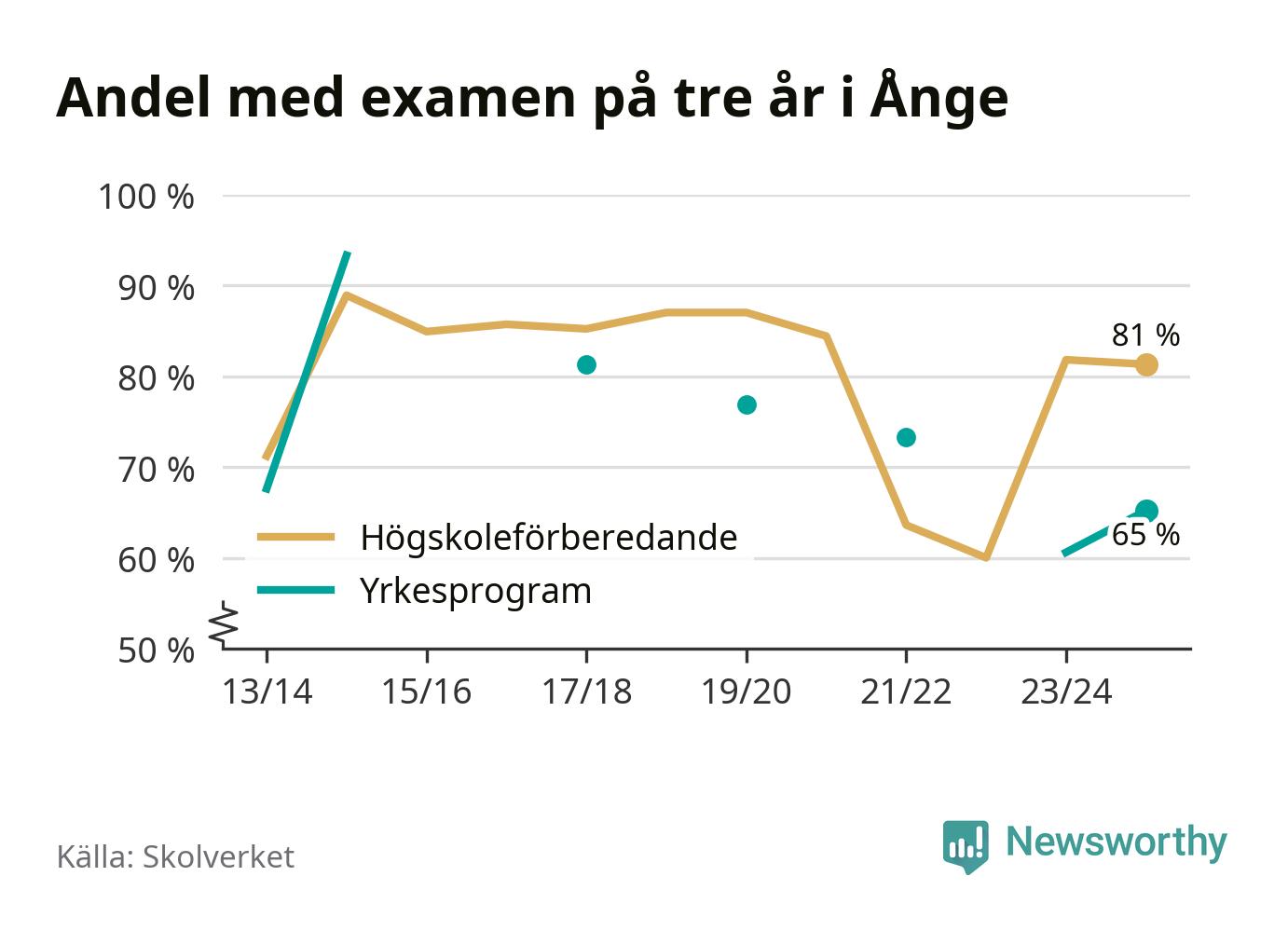 Precis som i riket som helhet ökade andelen som klarade gymnasieexamen från yrkesprogram på tre år i Ånge.