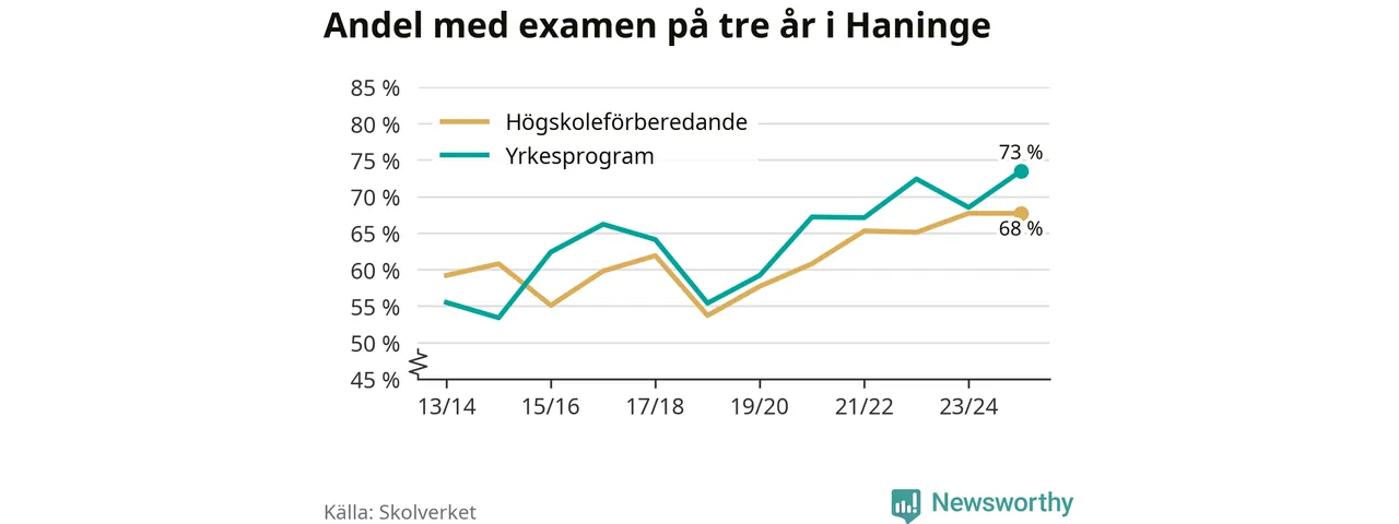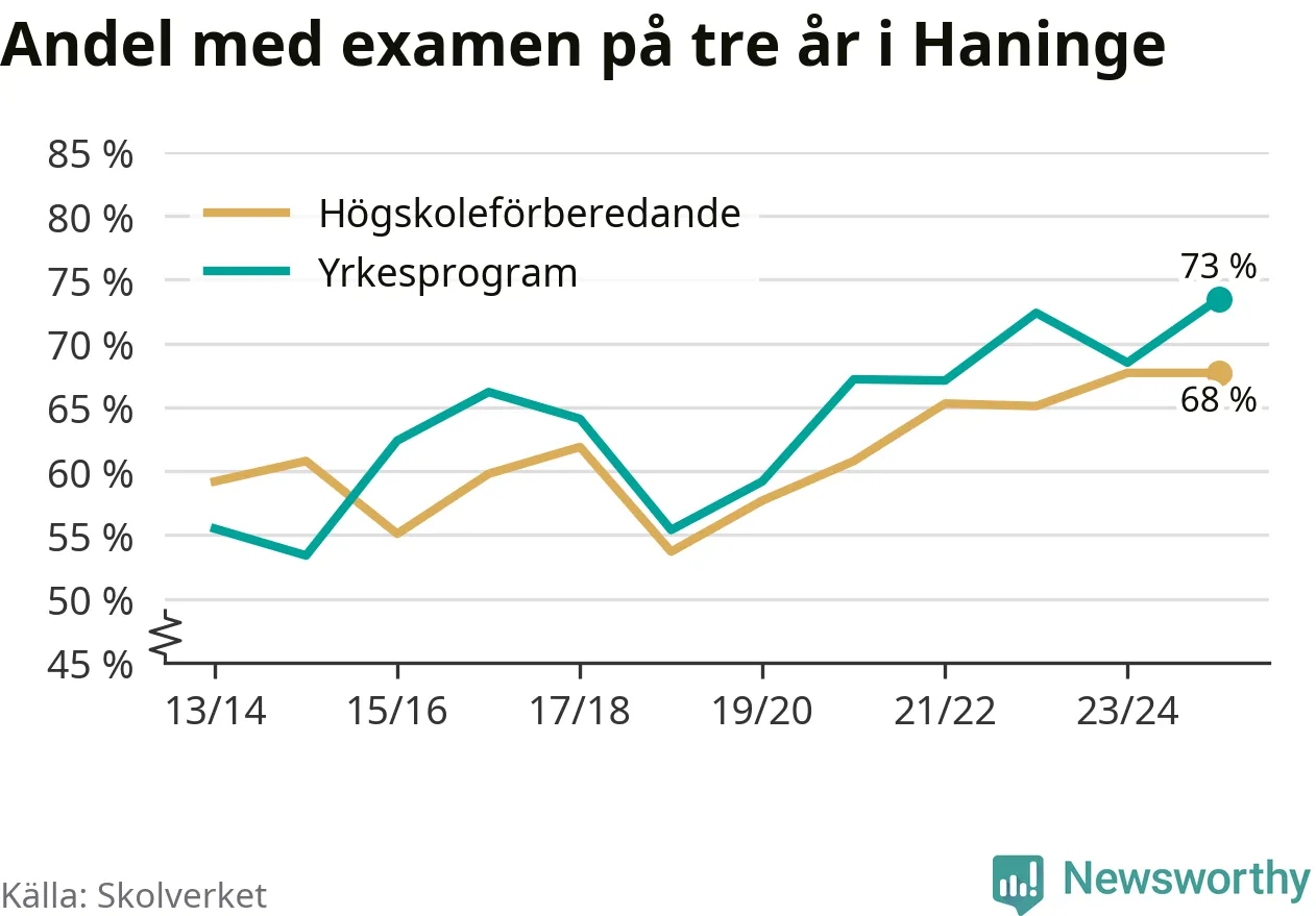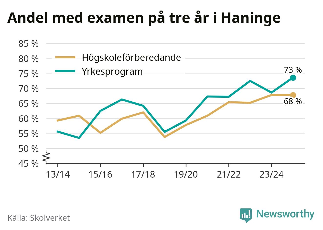 Inte sedan åtminstone läsåret 2013/14 har andelen elever som klarat gymnasieexamen på yrkesprogram varit högre i Haninge. Det visar Skolverkets senaste statistik.
