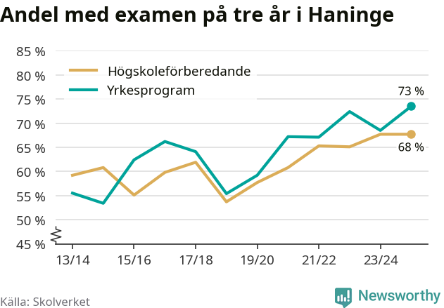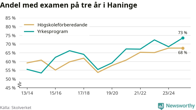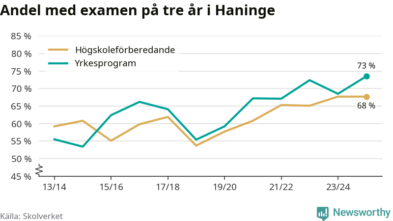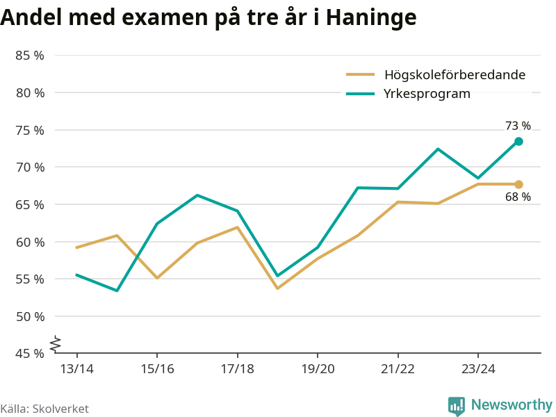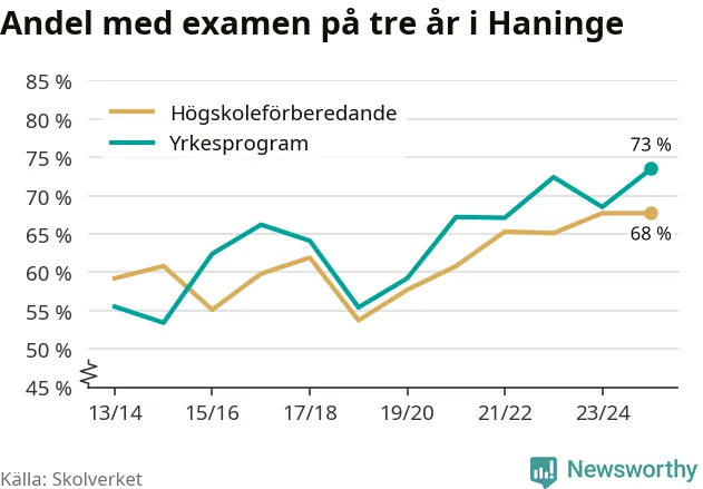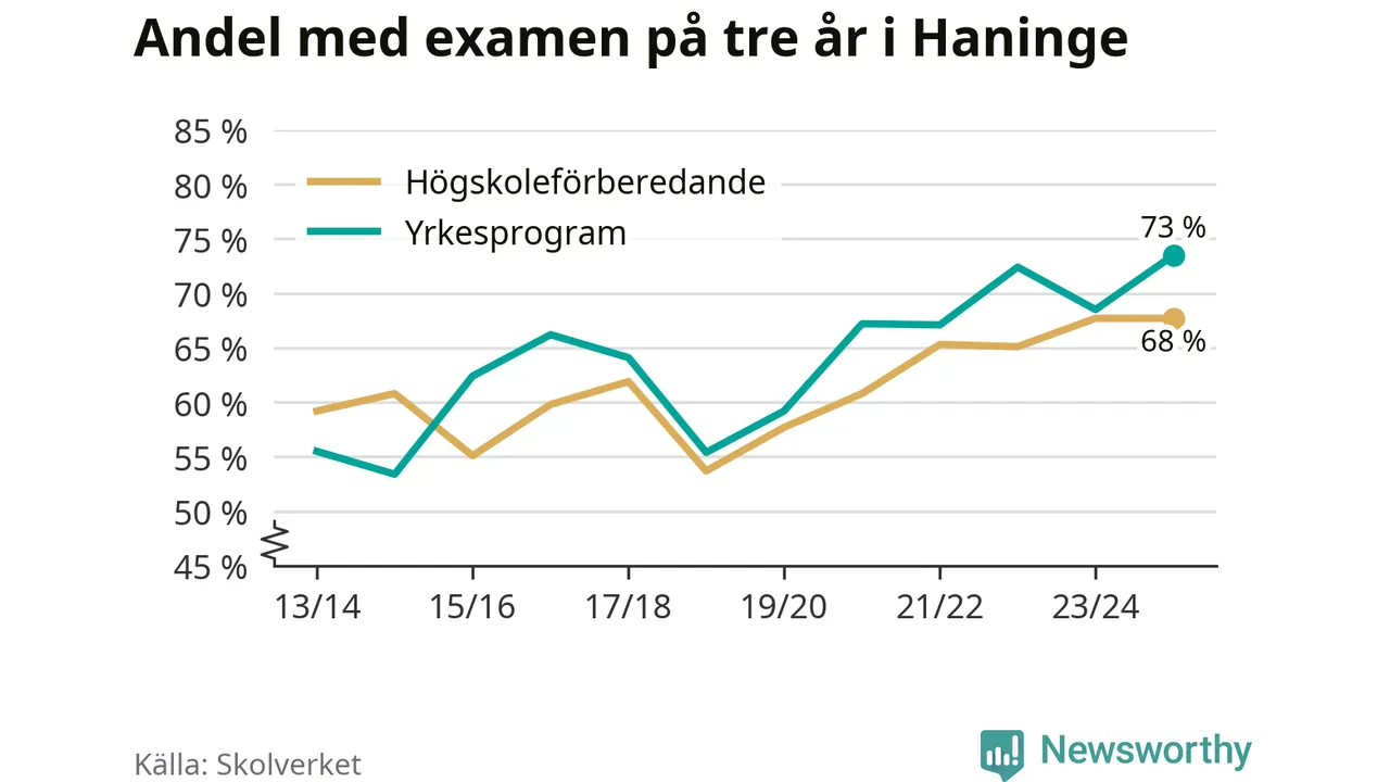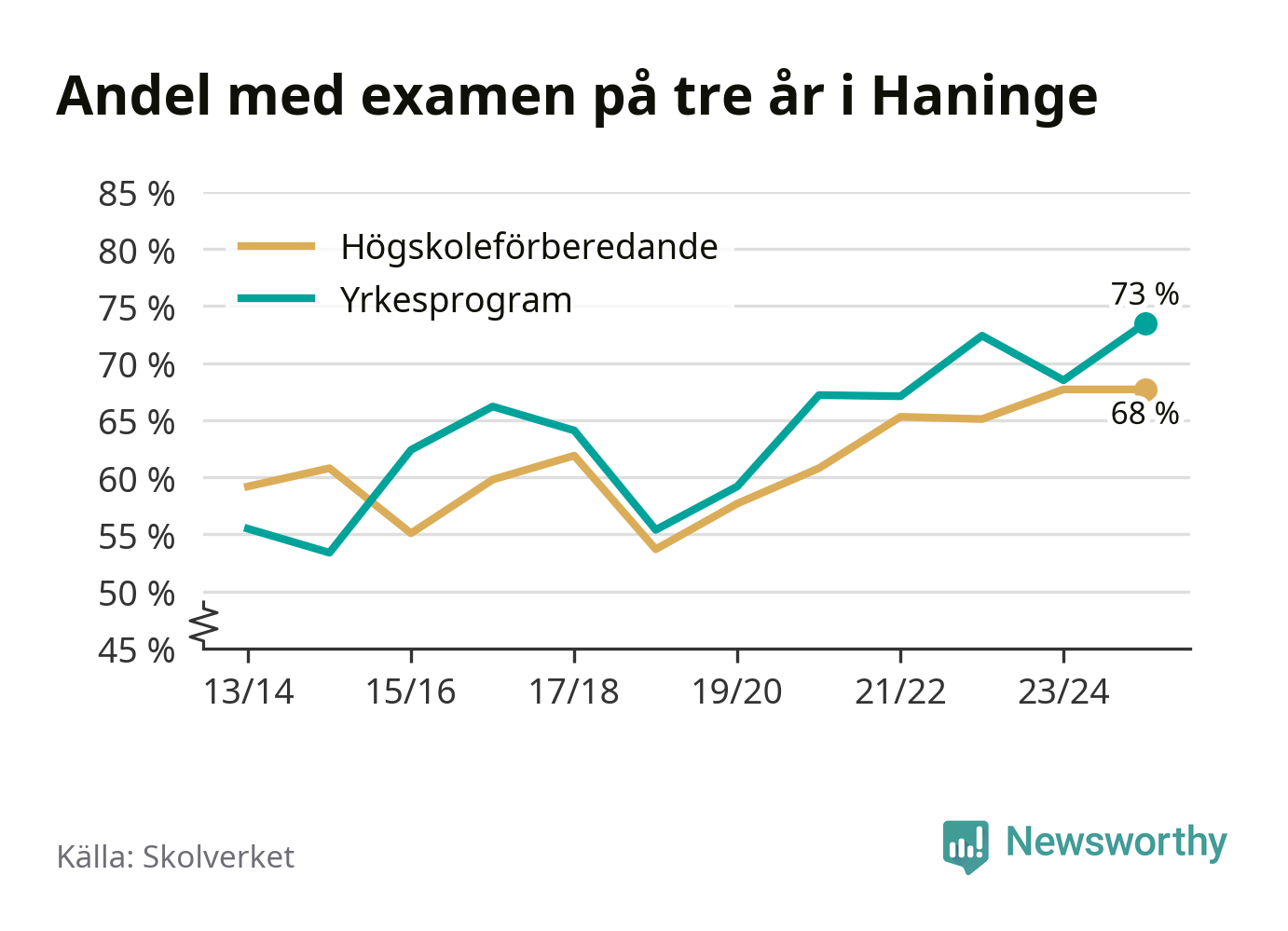 Inte sedan åtminstone läsåret 2013/14 har andelen elever som klarat gymnasieexamen på yrkesprogram varit högre i Haninge. Det visar Skolverkets senaste statistik.