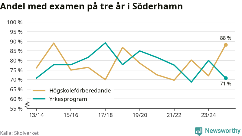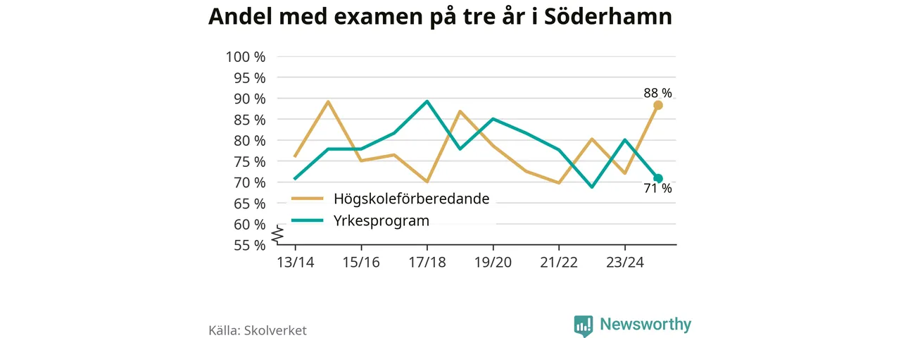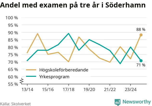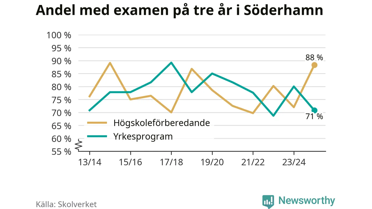 Medan andelen elever som klarade gymnasieexamen på yrkesprogram på tre år ökade i riket som helhet, minskade andelen i Söderhamn. Det visar Skolverkets senaste statistik.