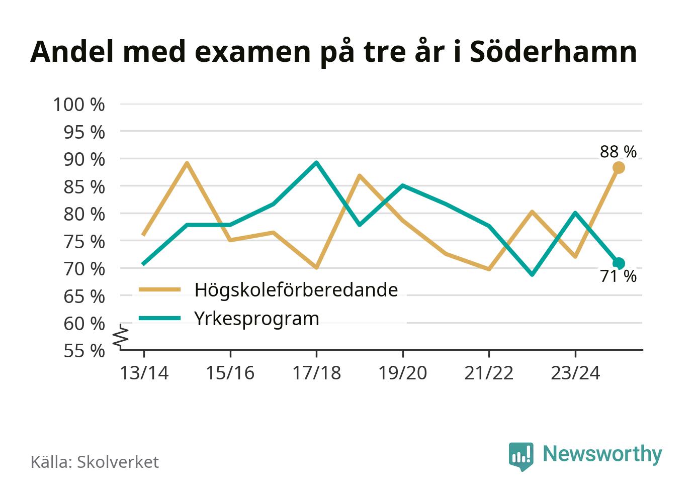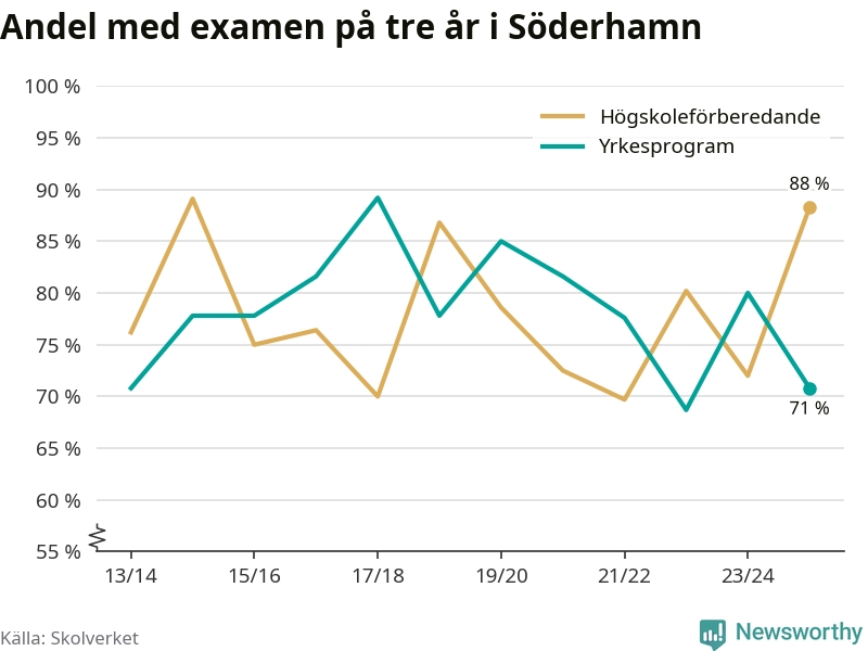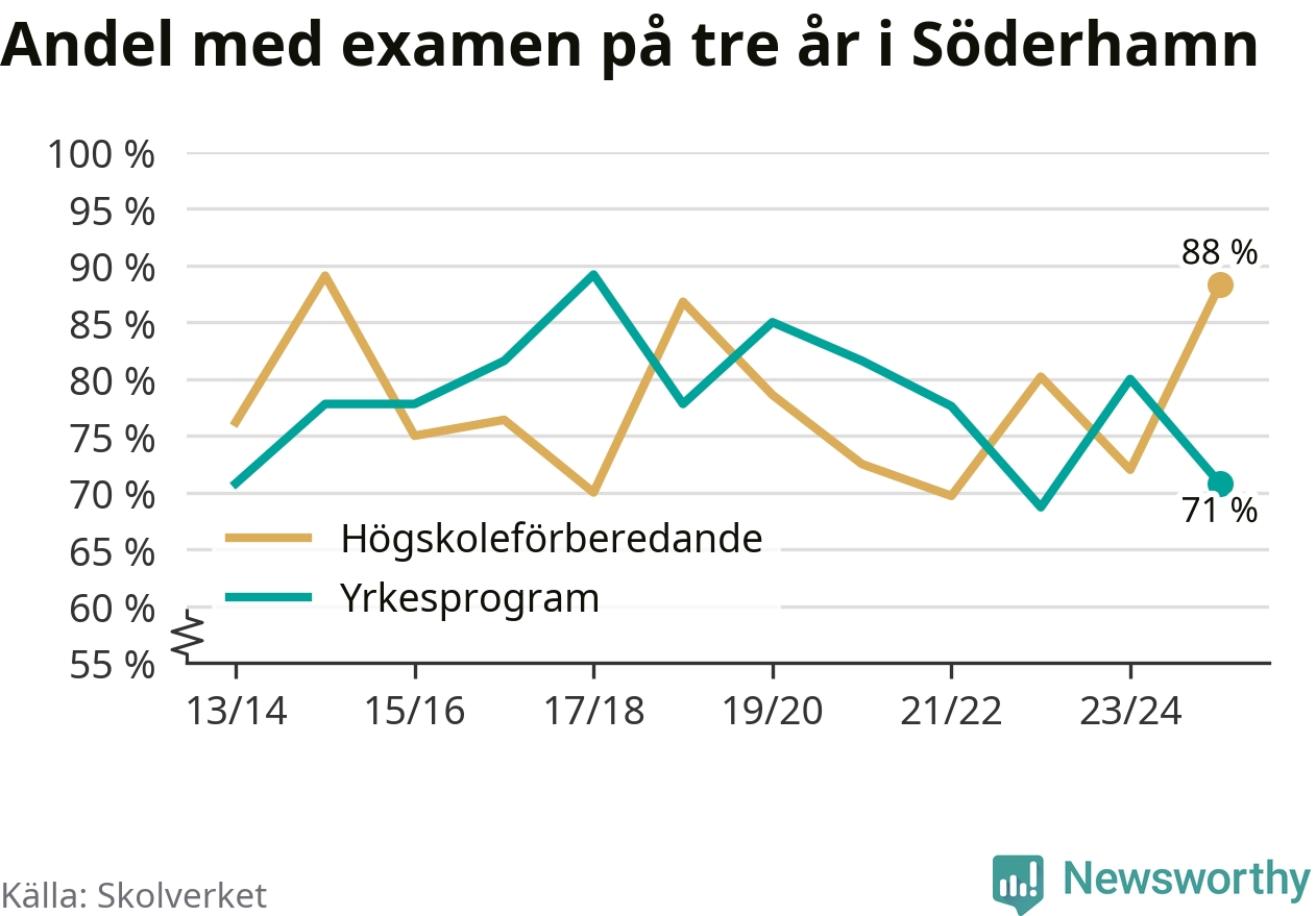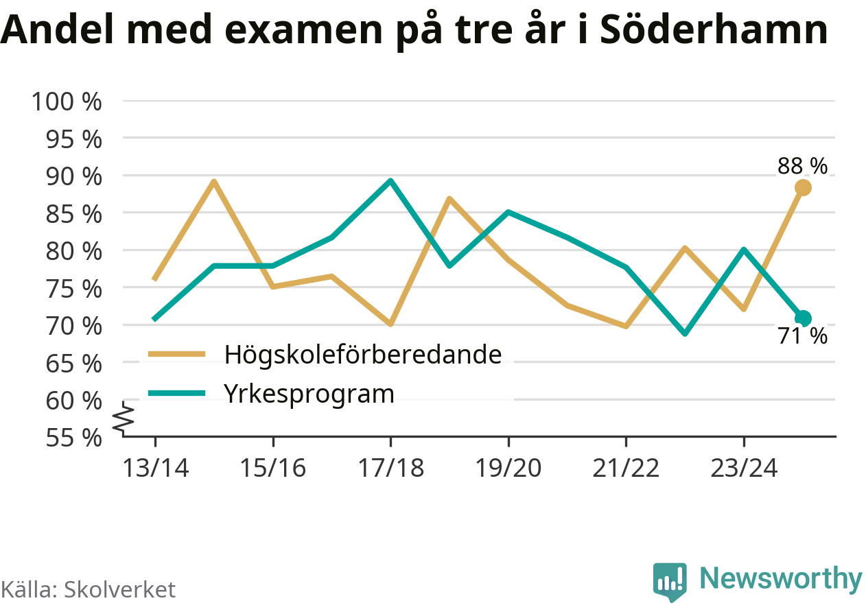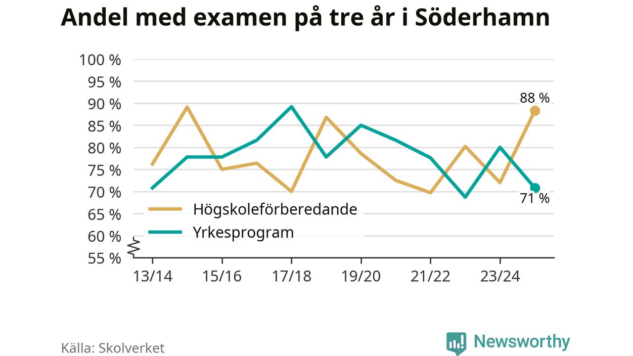 I riket som helhet ökade andelen som tog gymnasieexamen på tre år, både för högskoleförberedande och yrkesprogram. I våras var det 82,6 respektive 75,9 procent som klarade examen på tre år.