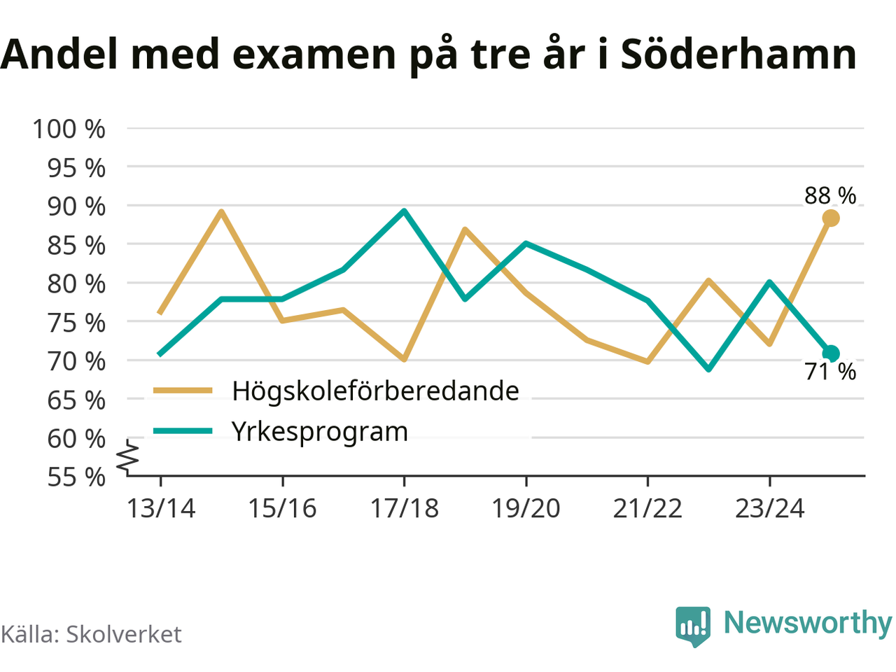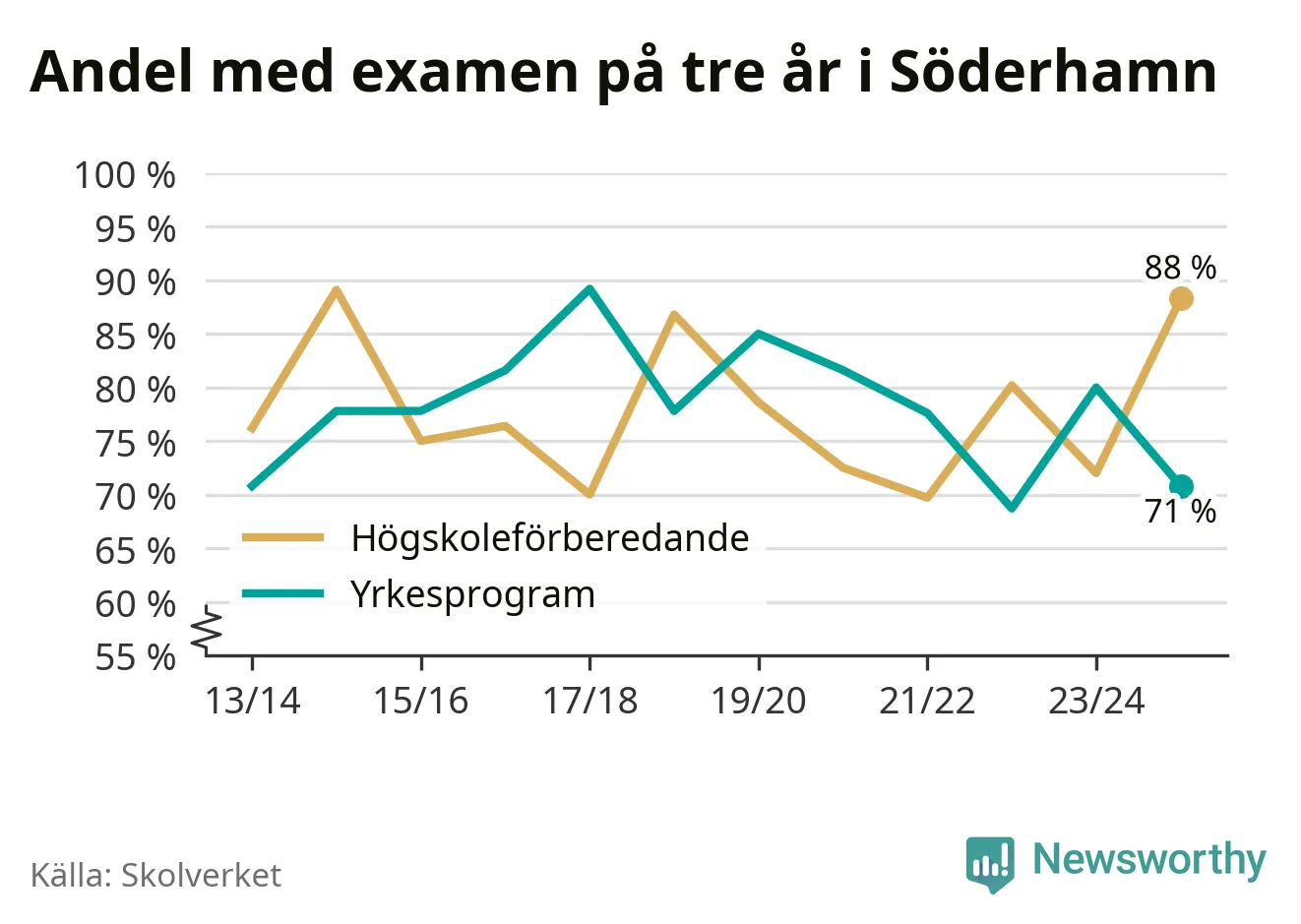 Enligt Skolverket är den främsta anledningen att andelen elever som har avbrutit eller förlängt sina gymnasiestudier minskat. Samtidigt har fler elever på högskoleförberedande program blivit godkända på gymnasiearbetet.