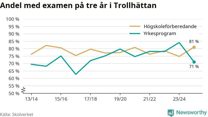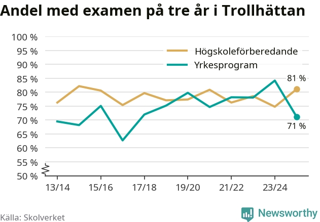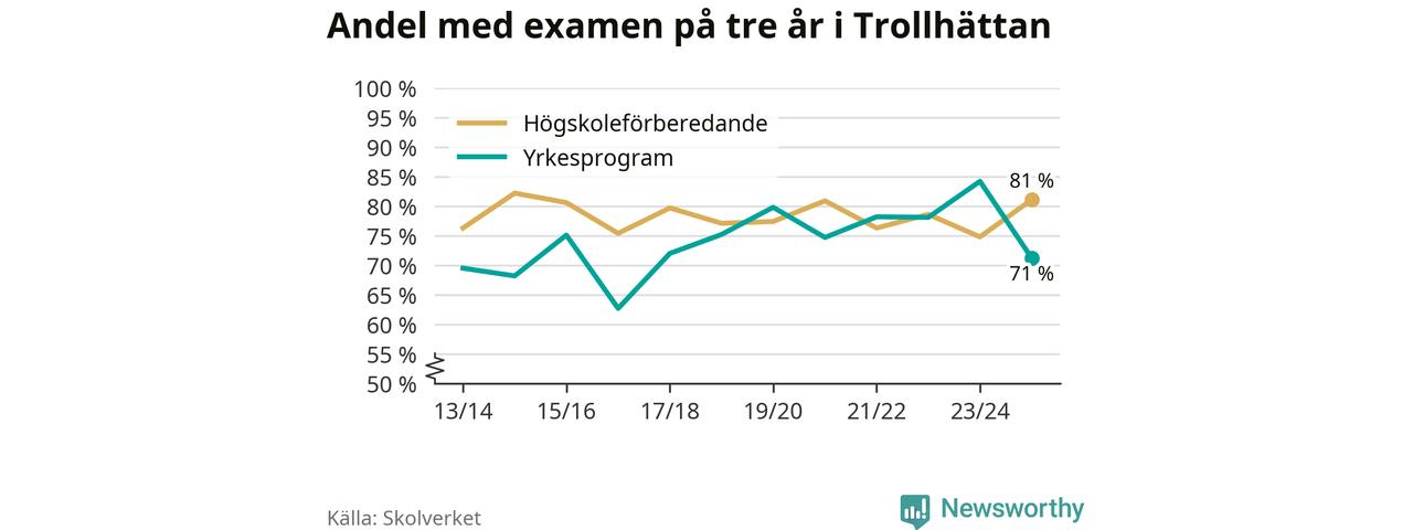 Medan andelen elever som klarade gymnasieexamen på yrkesprogram på tre år ökade i riket som helhet, minskade andelen i Trollhättan. Här är resultaten – skola för skola.