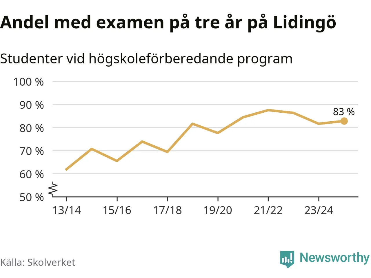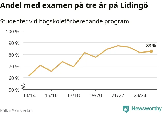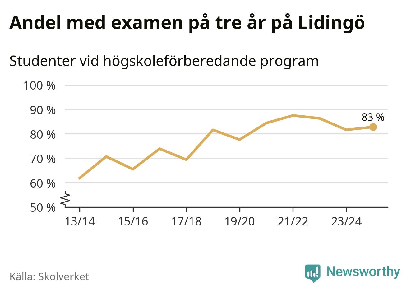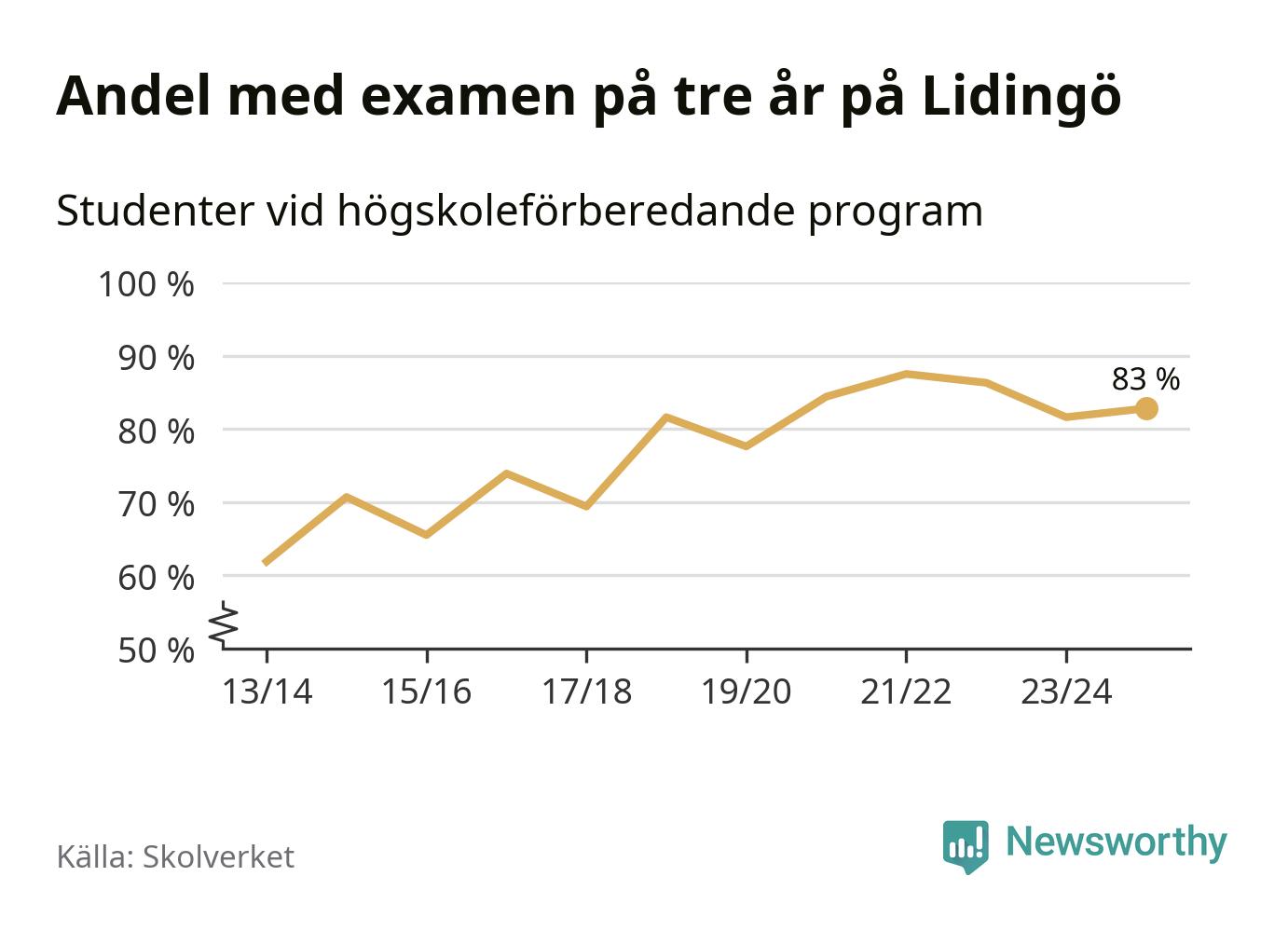 När eleverna på de högskoleförberedande programmen på de högskoleförberedande programmen i Lidingö kommun sprang ut i våras hade 83 procent av dem klarat gymnasieexamen på tre år. Det är en ökning med en procentenhet jämfört med året innan.