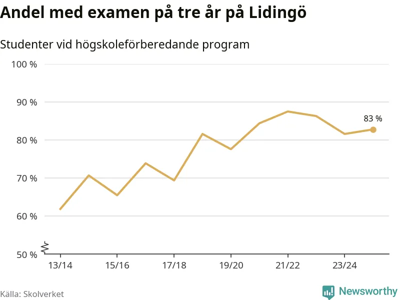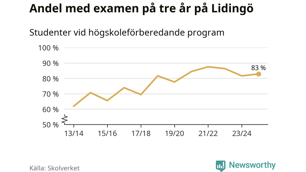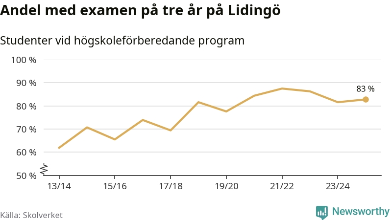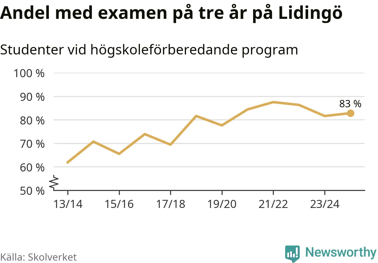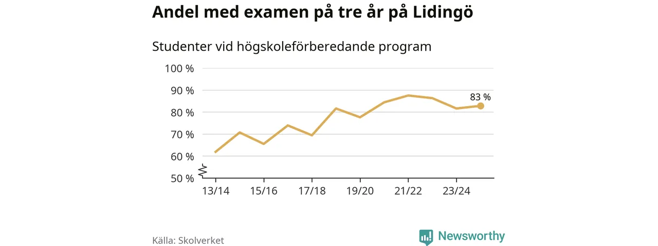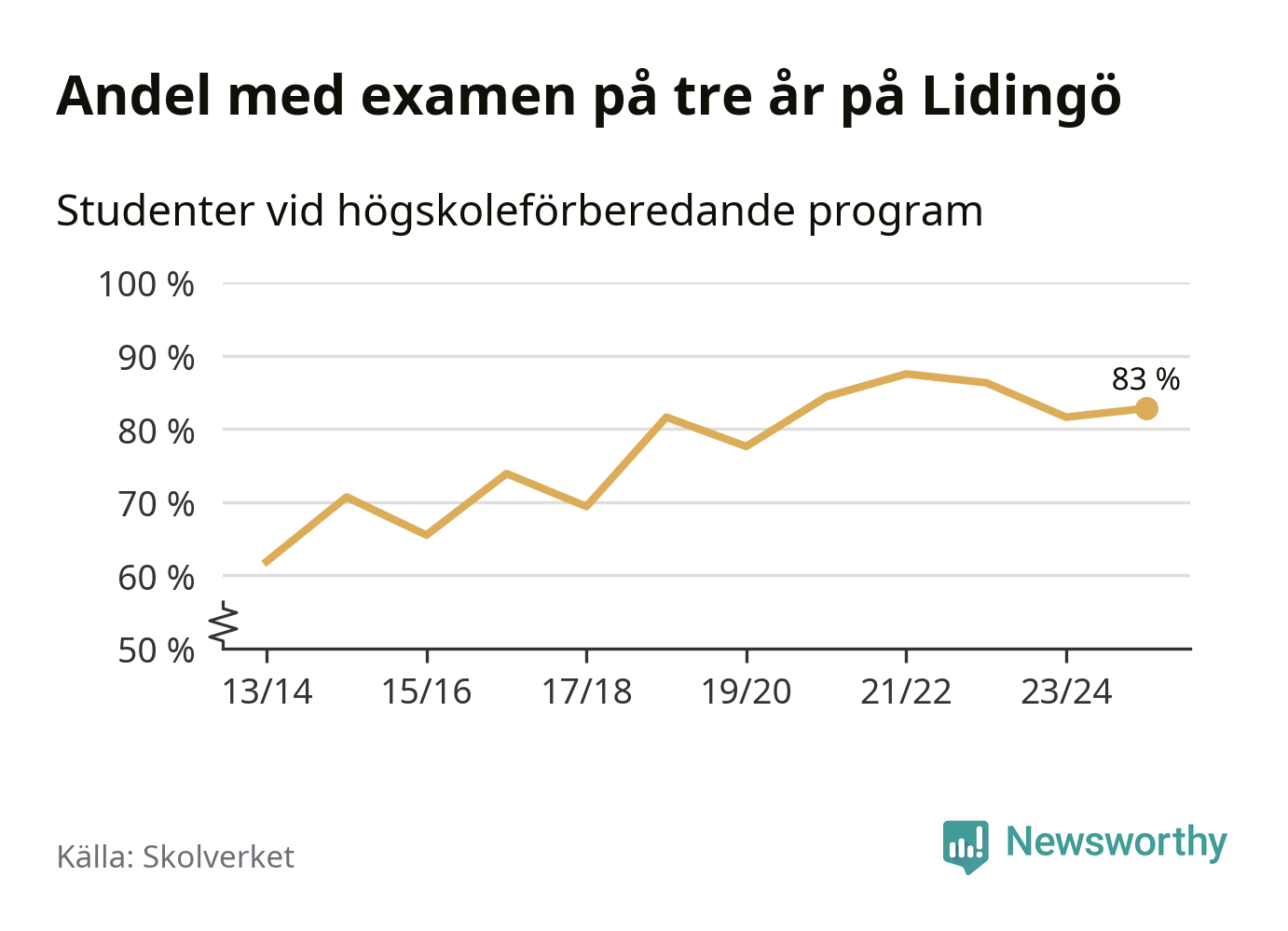 När eleverna på de högskoleförberedande programmen på de högskoleförberedande programmen i Lidingö kommun sprang ut i våras hade 83 procent av dem klarat gymnasieexamen på tre år. Det är en ökning med en procentenhet jämfört med året innan.