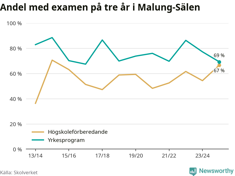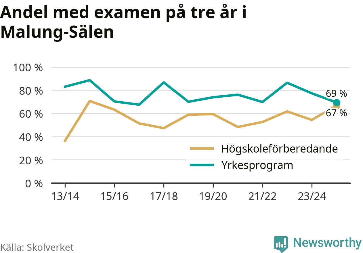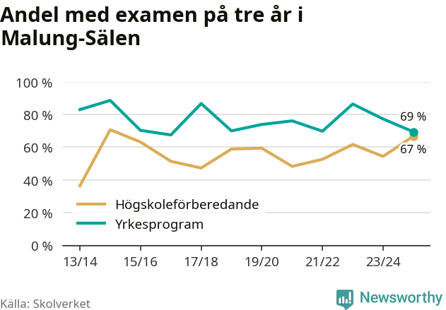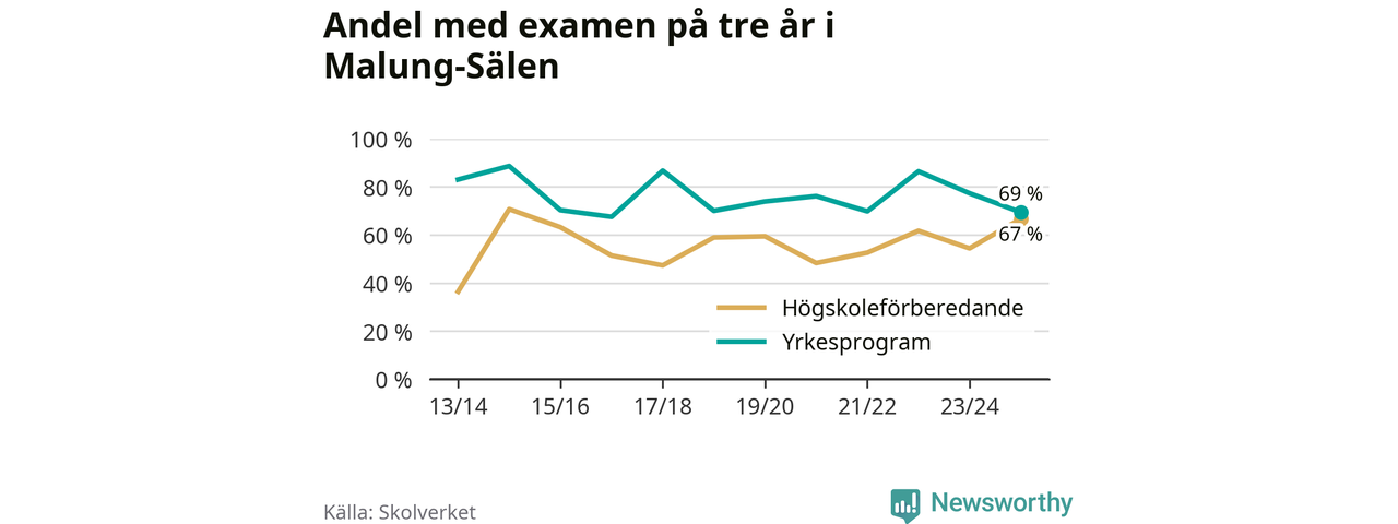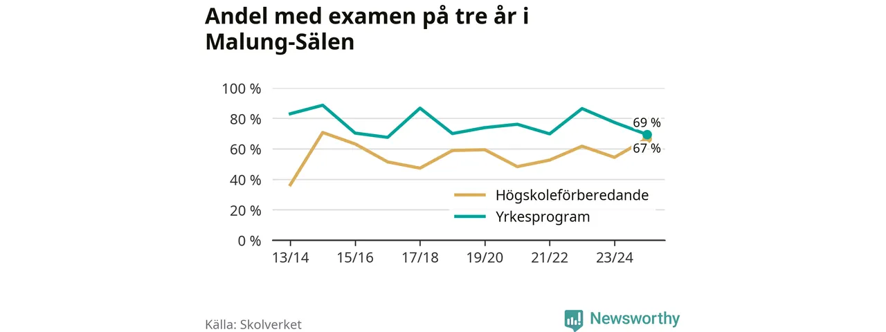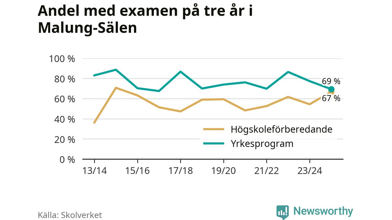 När eleverna på de yrkesförberedande programmen på Malung-Sälens gymnasieskola sprang ut i våras hade 69 procent klarat gymnasieexamen på tre år. Det är åtta procentenheter färre än året innan och inte sedan kullen som tog studenten läsåret 2016/17 har andelen varit lägre.