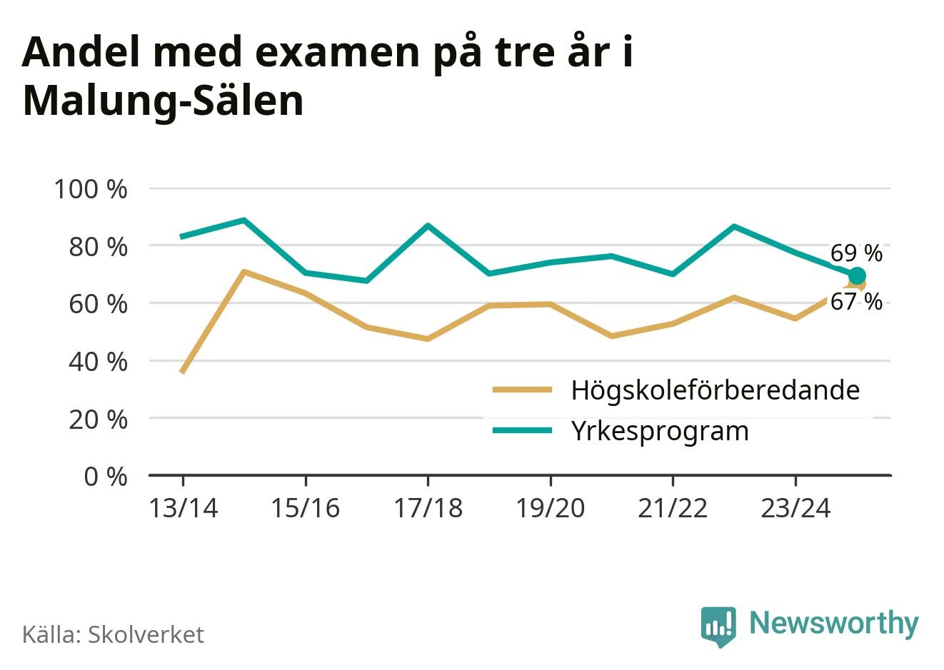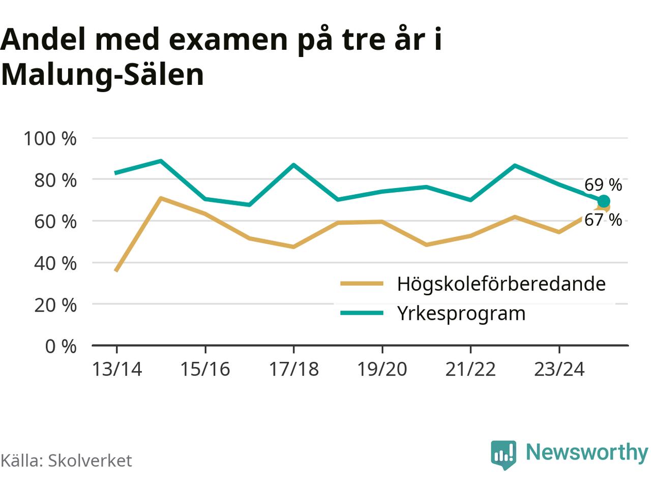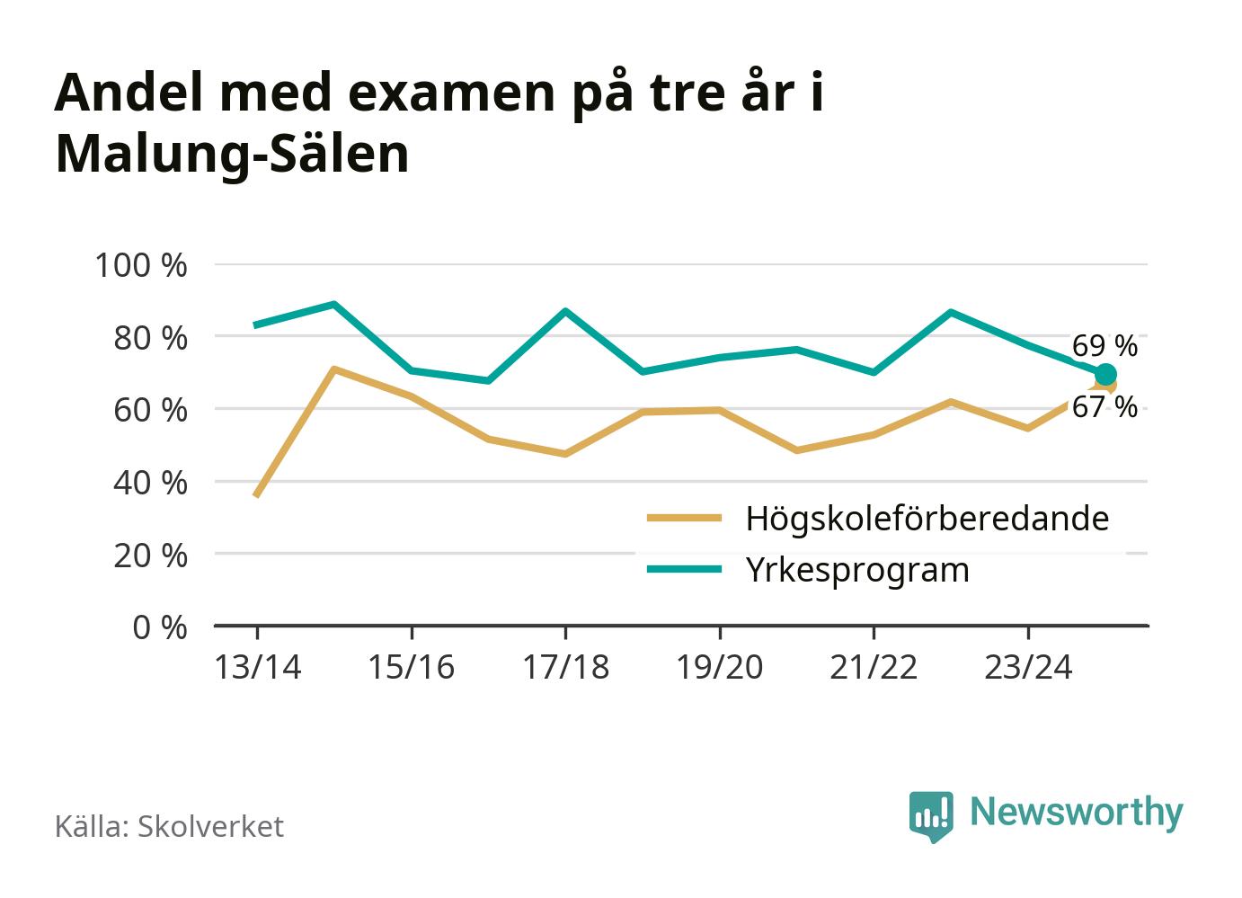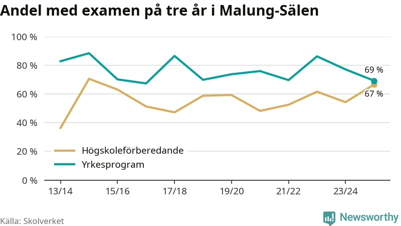 När eleverna på de yrkesförberedande programmen på Malung-Sälens gymnasieskola sprang ut i våras hade 69 procent klarat gymnasieexamen på tre år. Det är åtta procentenheter färre än året innan och inte sedan kullen som tog studenten läsåret 2016/17 har andelen varit lägre.