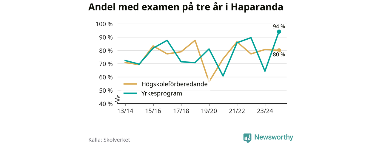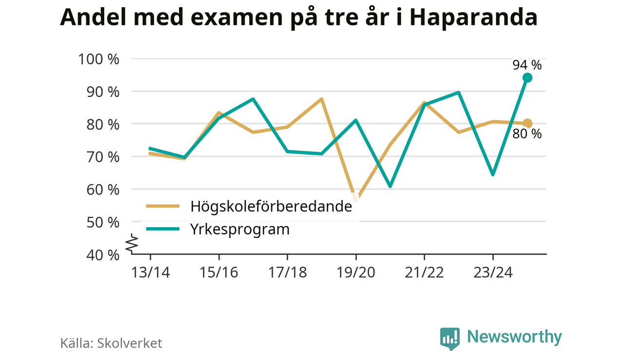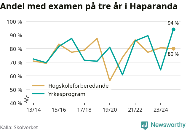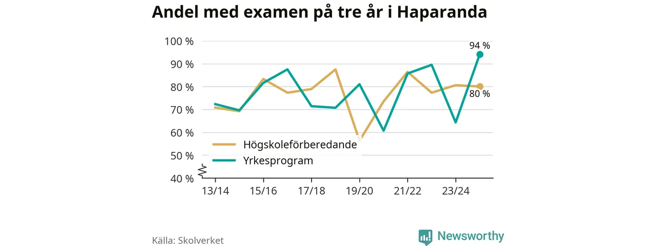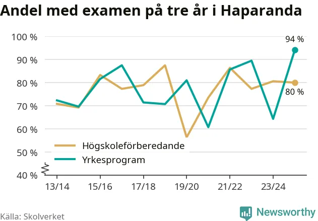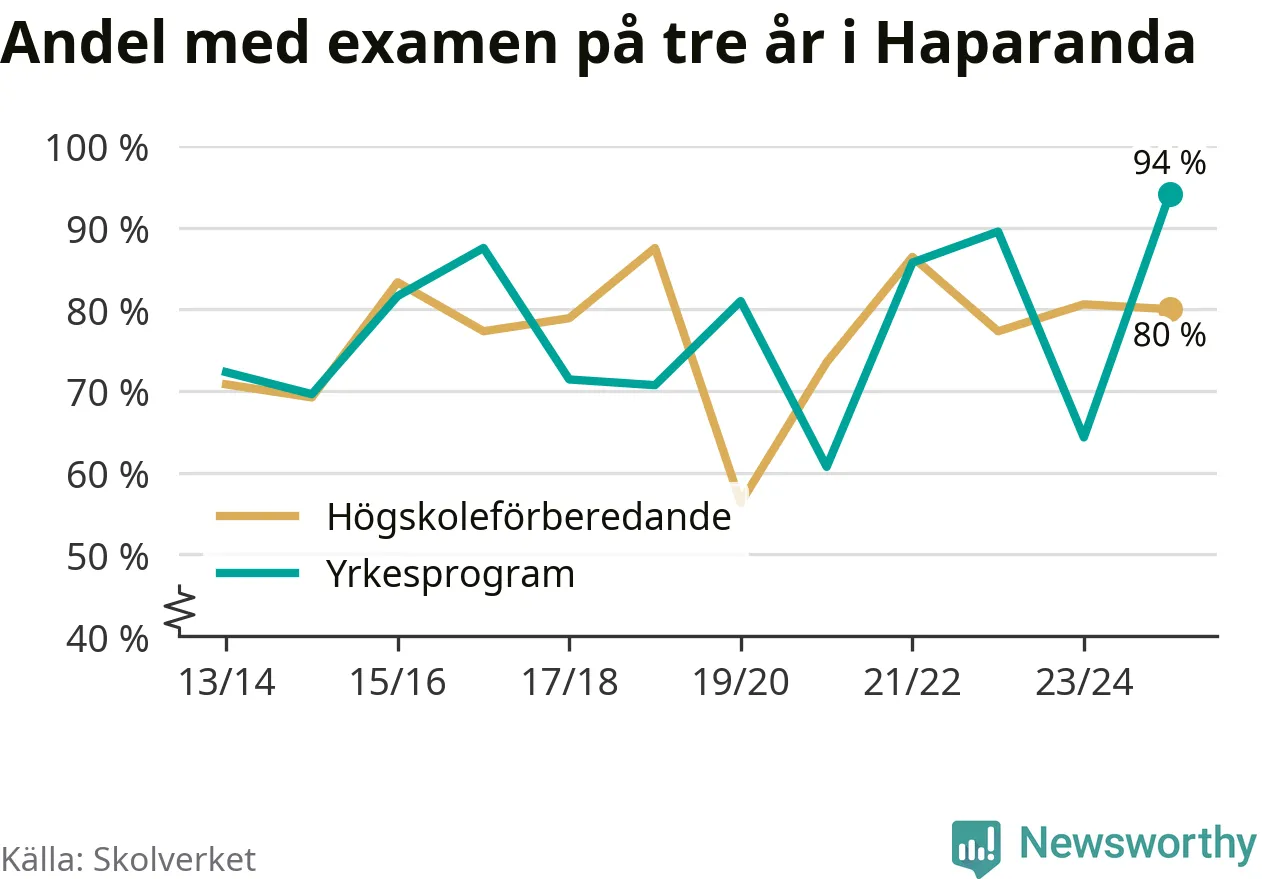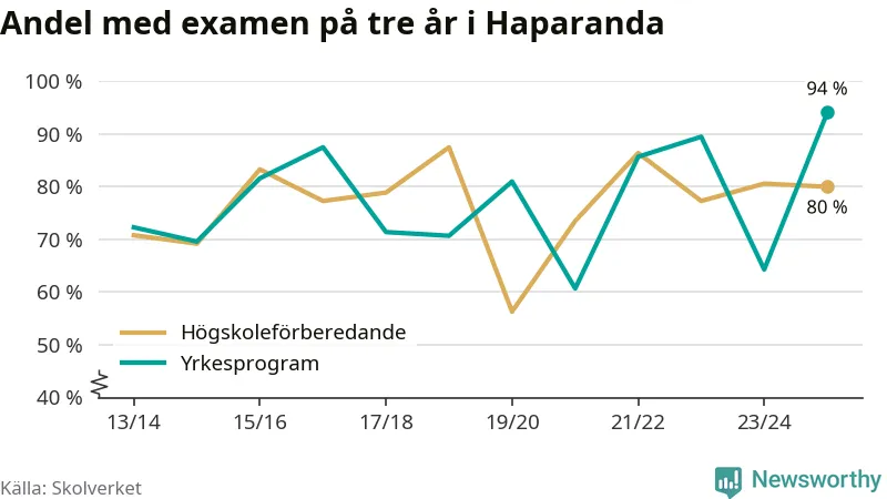 Inte sedan åtminstone läsåret 2013/14 har andelen elever som klarat gymnasieexamen på yrkesprogram varit högre i Haparanda. Det visar Skolverkets senaste statistik.