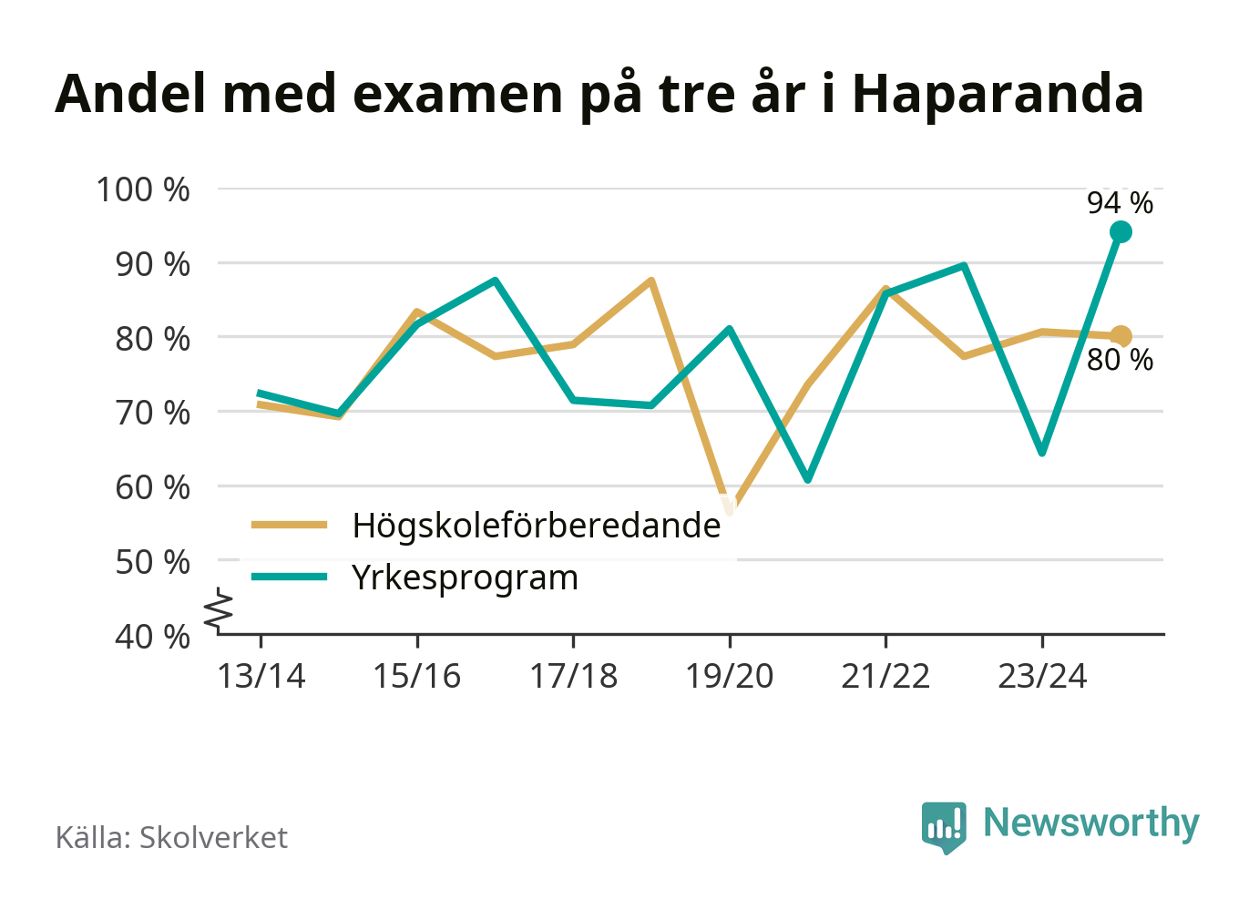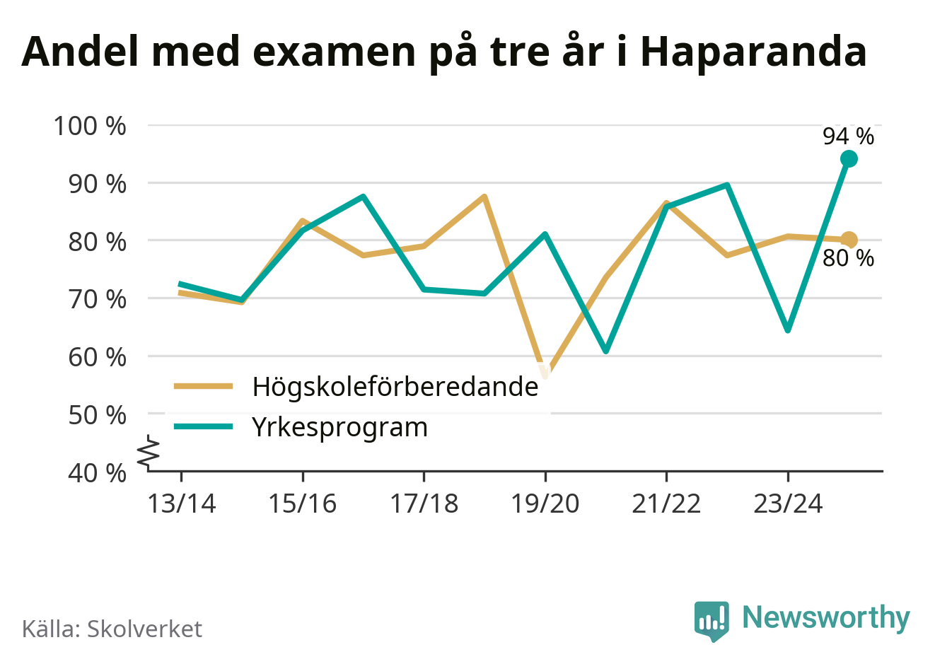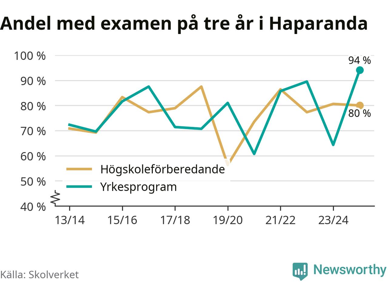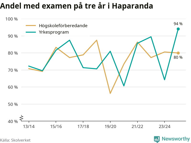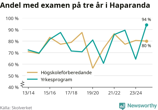 Inte sedan åtminstone läsåret 2013/14 har andelen elever som klarat gymnasieexamen på yrkesprogram varit högre i Haparanda. Det visar Skolverkets senaste statistik.