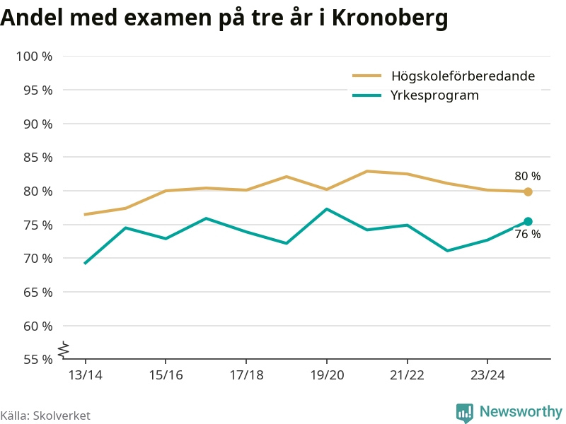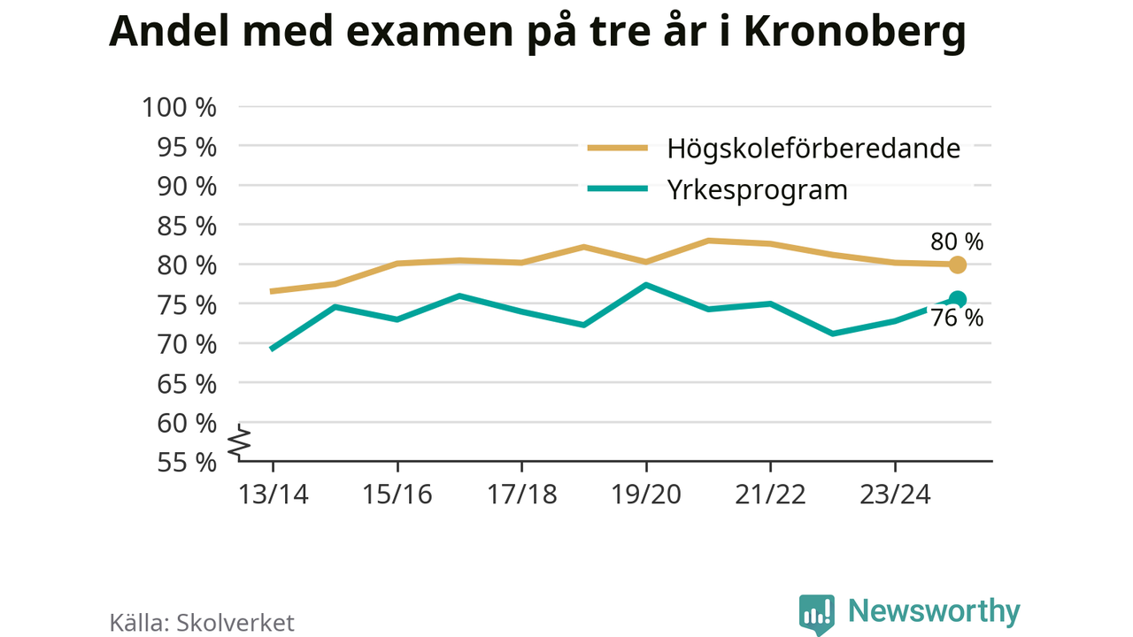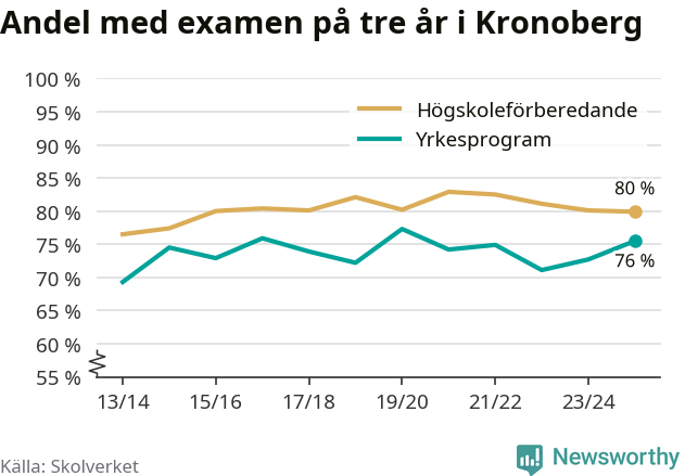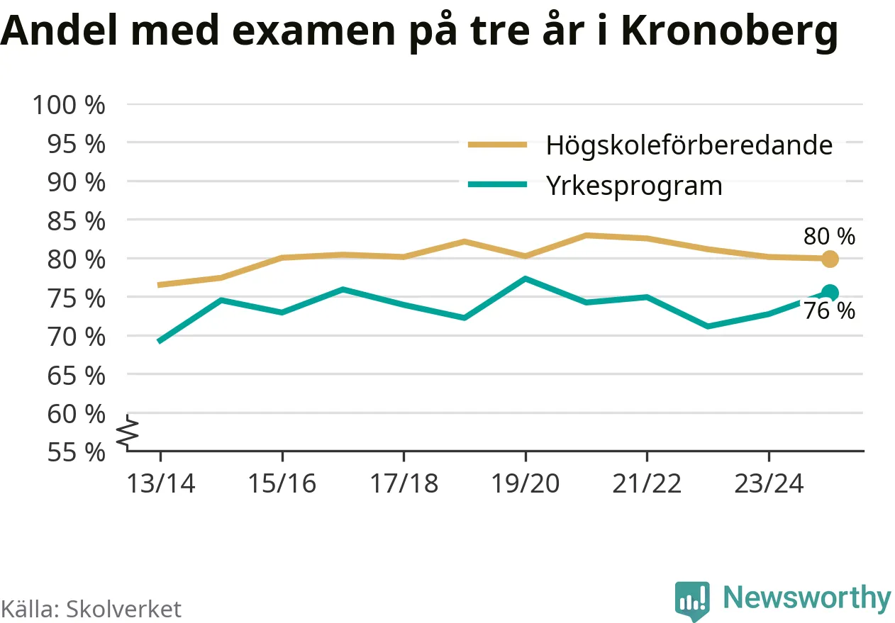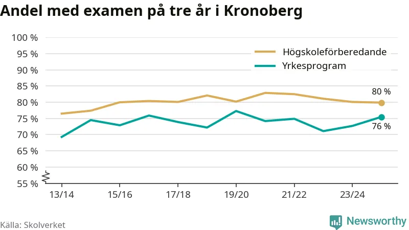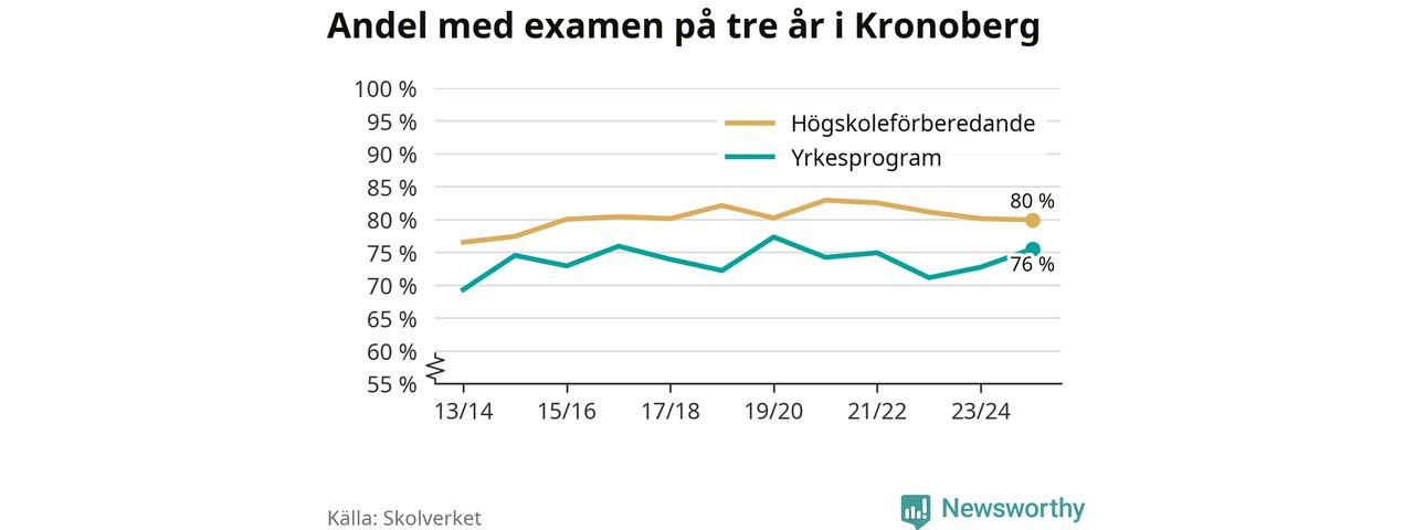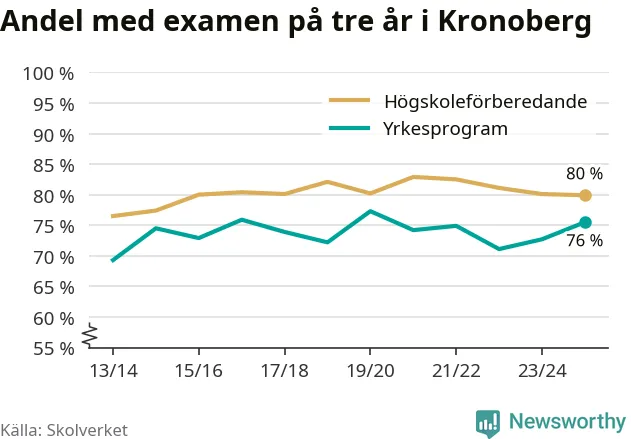 När eleverna på de yrkesförberedande programmen i Kronobergs län sprang ut i våras hade 76 procent klarat gymnasieexamen på tre år. Det är tre procentenheter fler än året innan och inte sedan kullen som tog studenten läsåret 2019/20 har andelen varit högre.