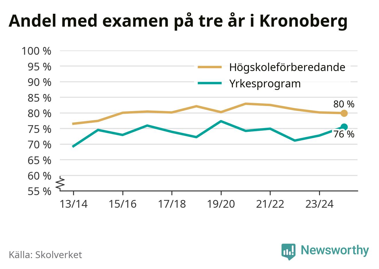 Bland deras kamrater på högskoleförberedande program hade 80 procent klarat examen på tre år – vilket är ungefär lika många som året innan. Det är för övrigt den lägsta andelen sedan kullen som tog studenten läsåret 2014/15.