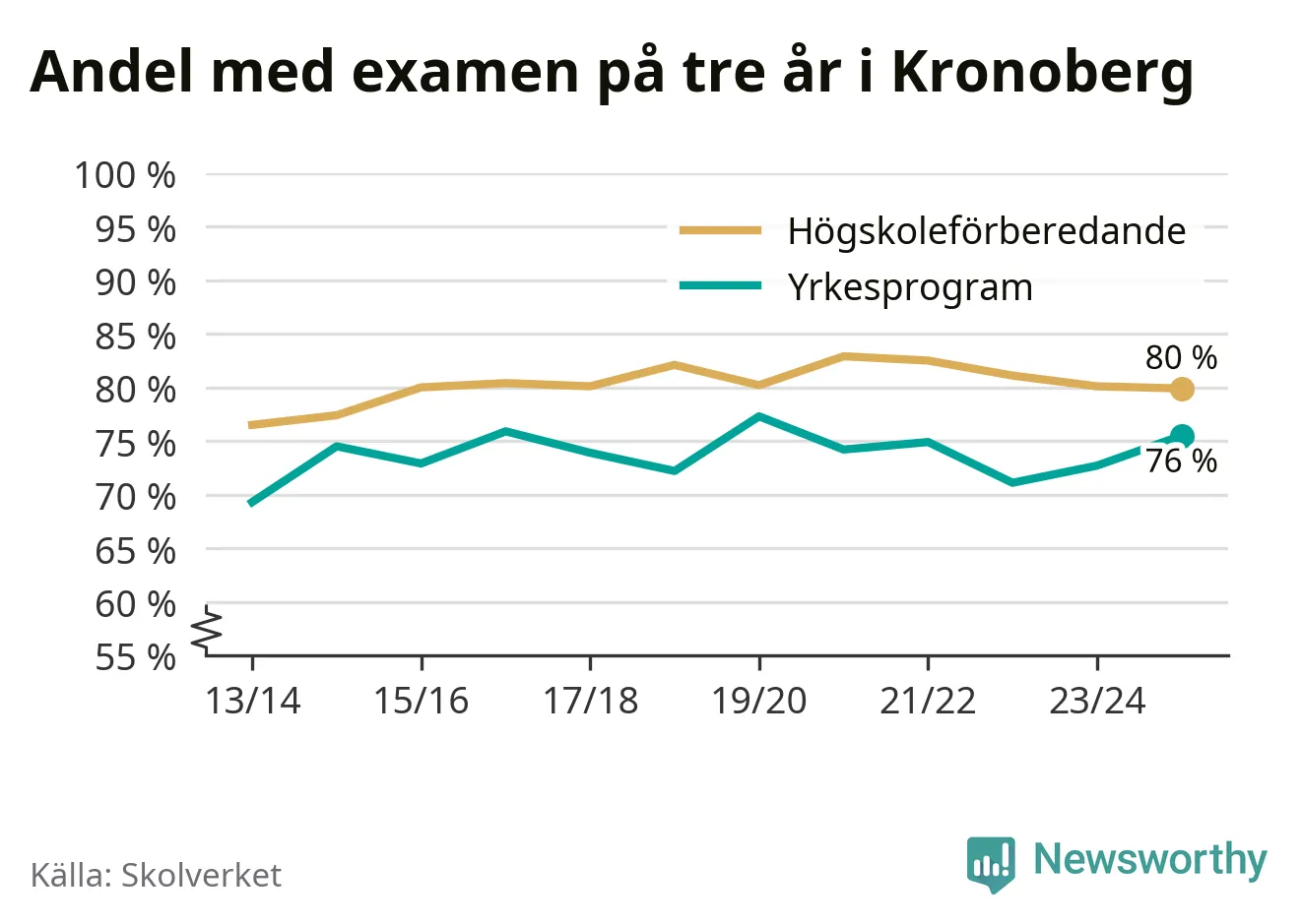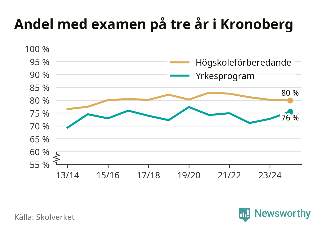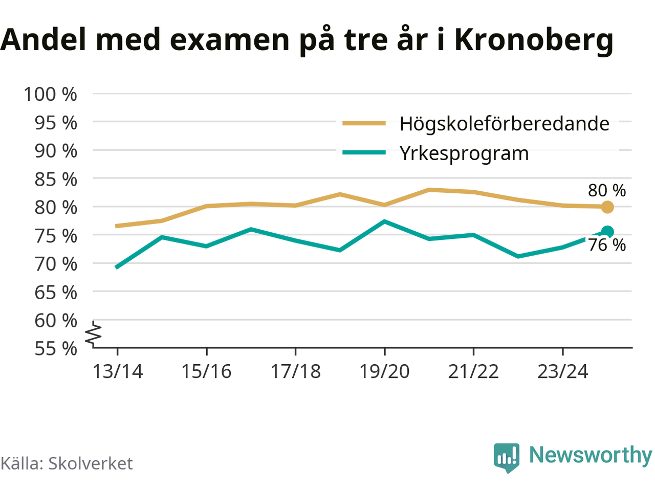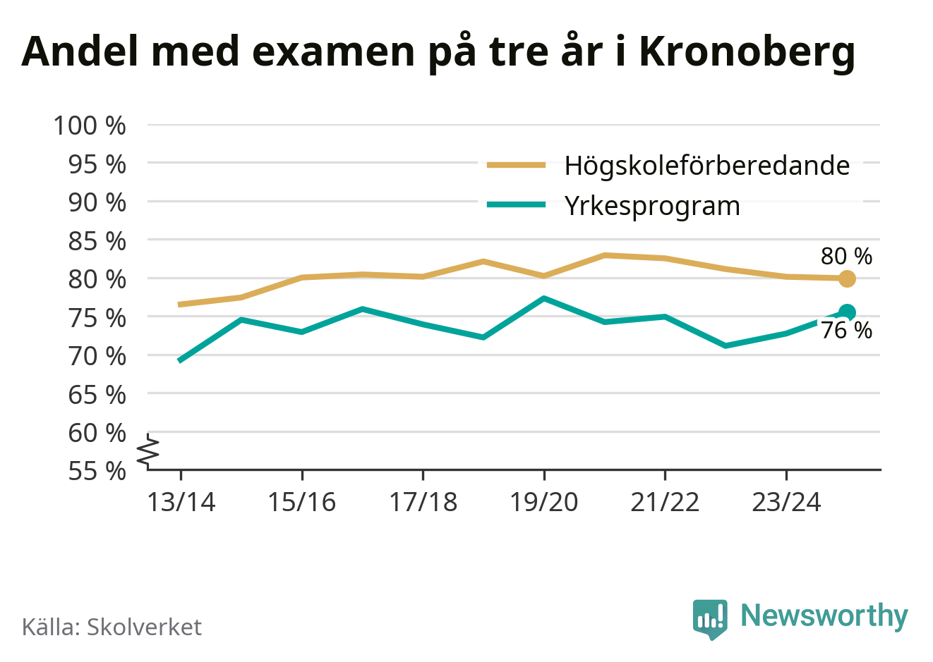 Enligt Skolverket är den främsta anledningen att andelen elever som har avbrutit eller förlängt sina gymnasiestudier minskat. Samtidigt har fler elever på högskoleförberedande program blivit godkända på gymnasiearbetet.