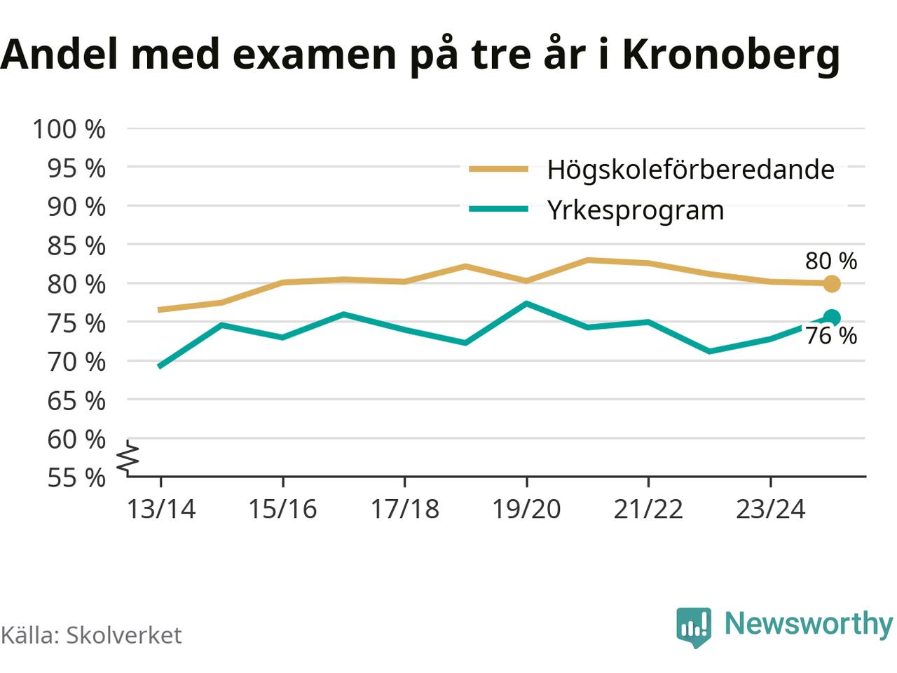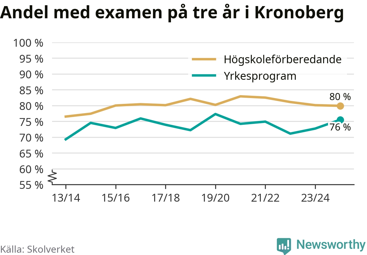 I riket som helhet ökade andelen som tog gymnasieexamen på tre år, både för högskoleförberedande och yrkesprogram. I våras var det 82,6 respektive 75,9 procent som klarade examen på tre år.