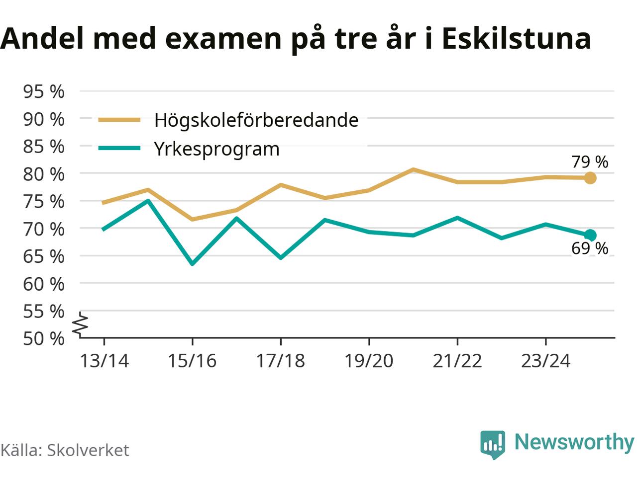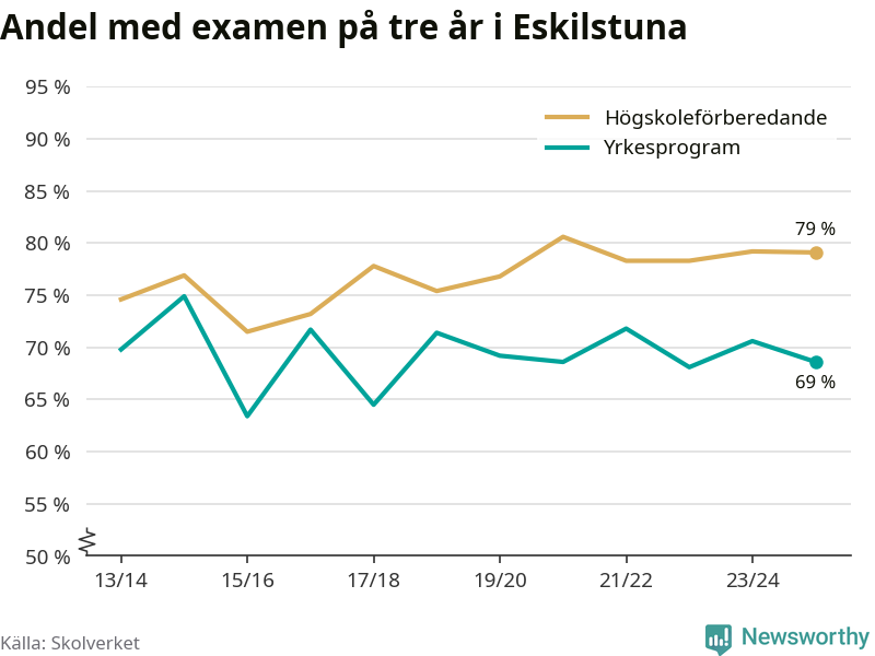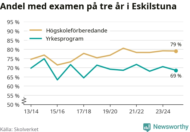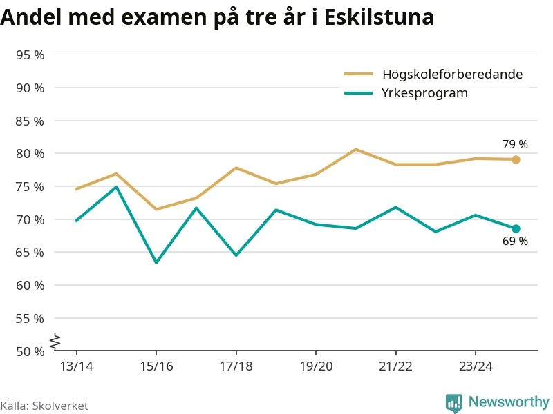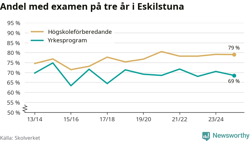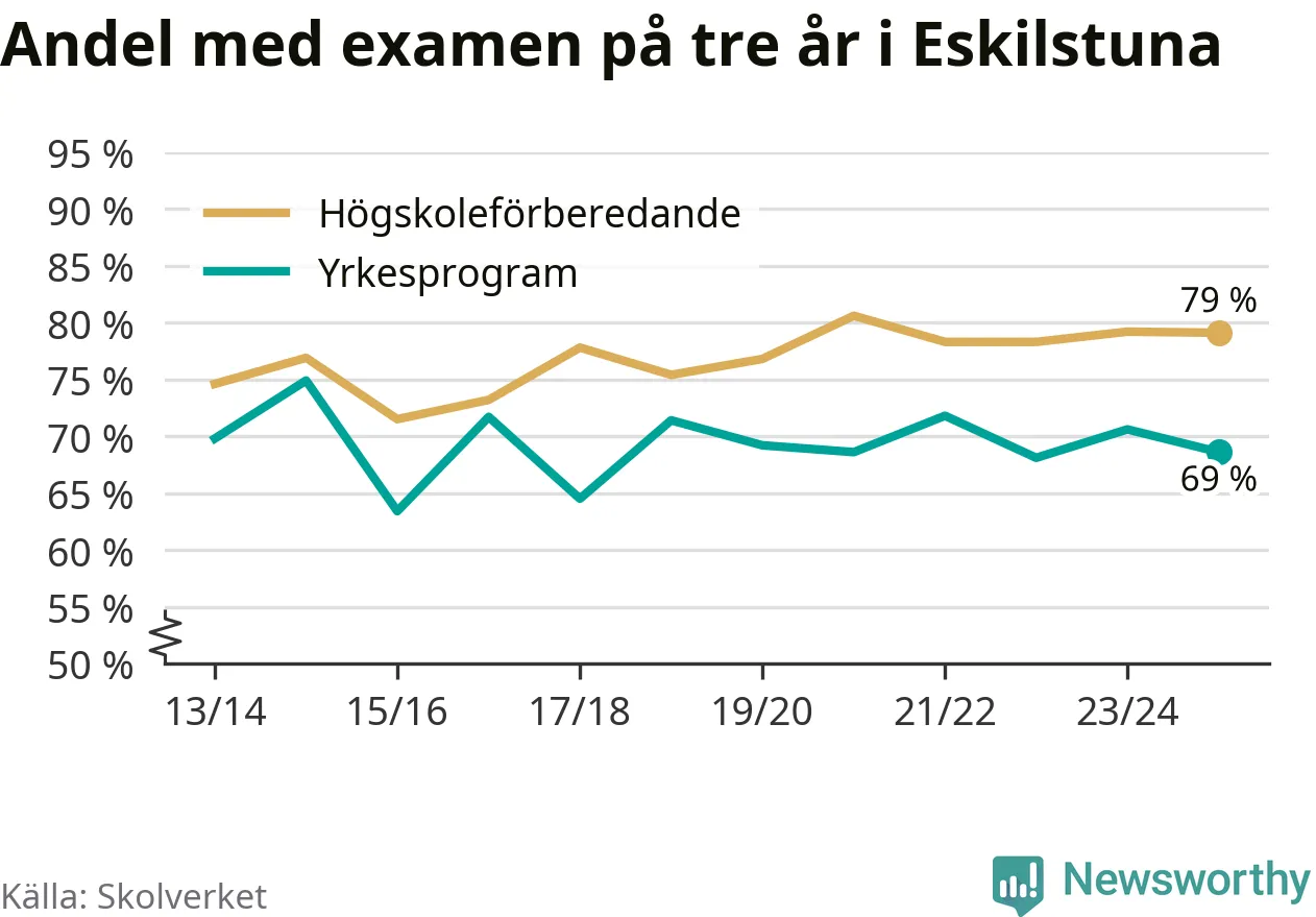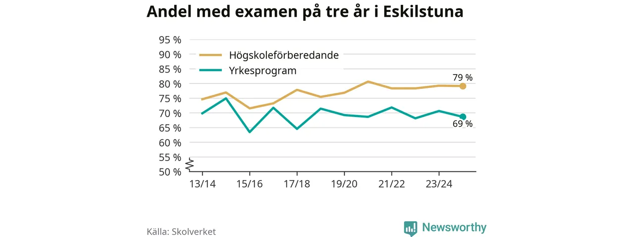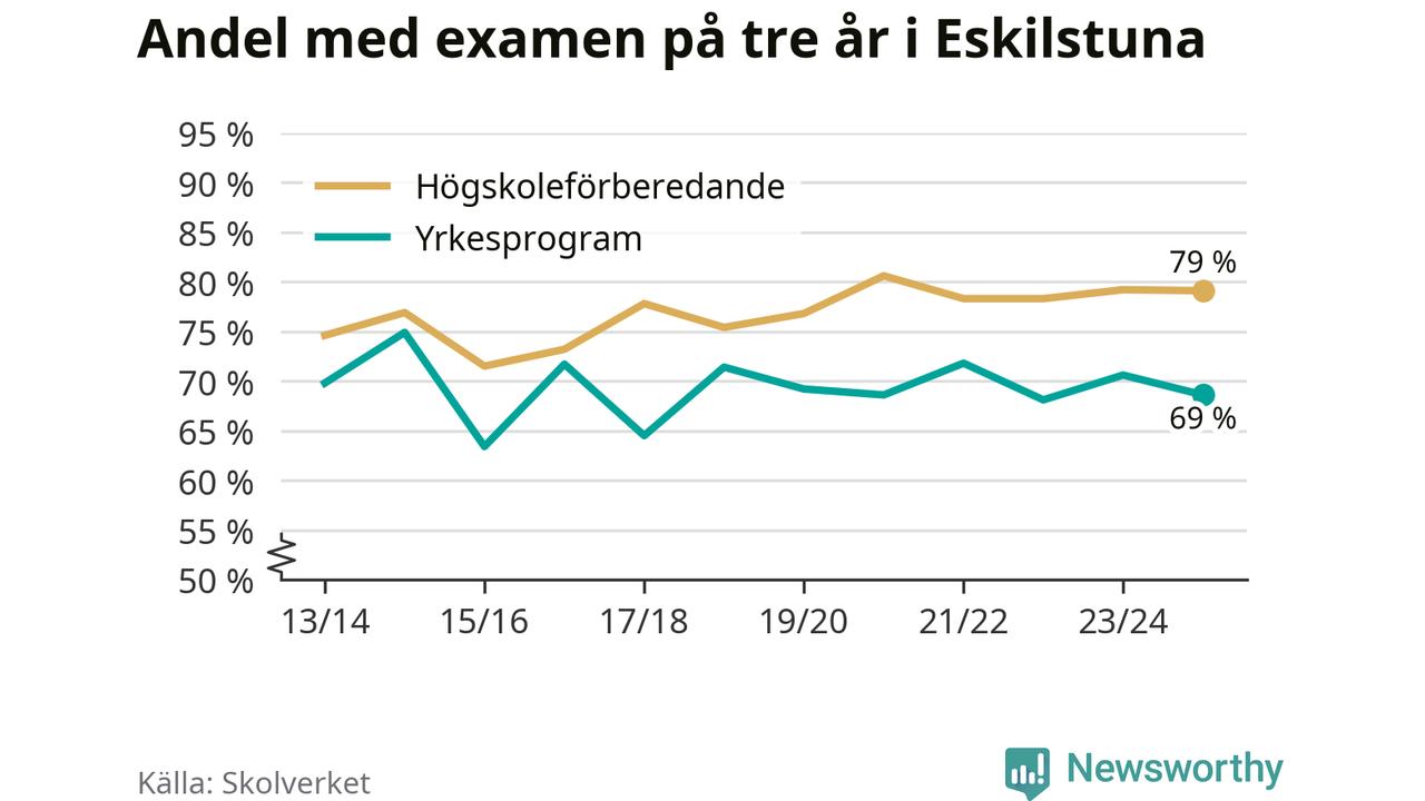 Medan andelen elever som klarade gymnasieexamen på yrkesprogram på tre år ökade i riket som helhet, minskade andelen i Eskilstuna något. Här är resultaten – skola för skola.