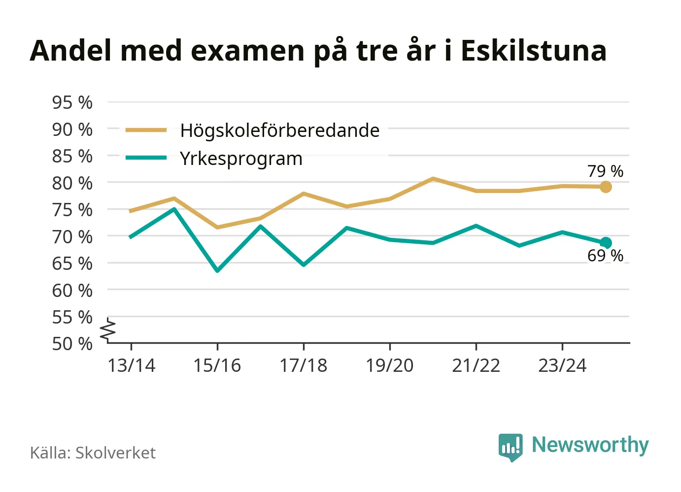 Enligt Skolverket är den främsta anledningen att andelen elever som har avbrutit eller förlängt sina gymnasiestudier minskat. Samtidigt har fler elever på högskoleförberedande program blivit godkända på gymnasiearbetet.