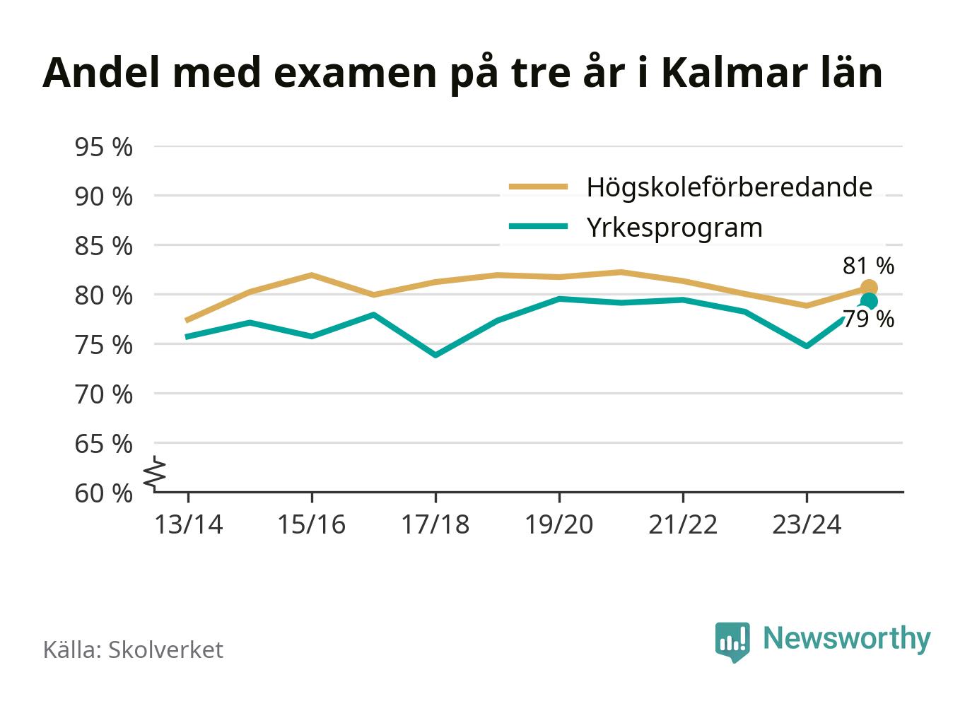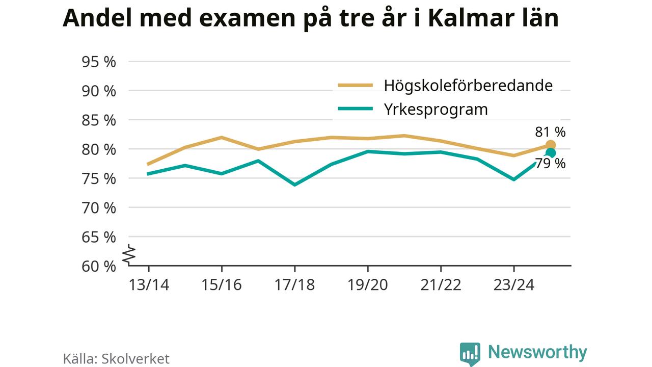 När eleverna på de yrkesförberedande programmen i Kalmar län sprang ut i våras hade 79 procent klarat gymnasieexamen på tre år. Det är fyra procentenheter fler än året innan.