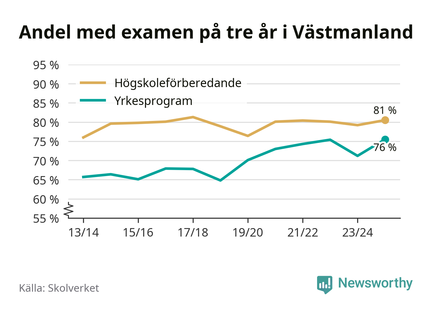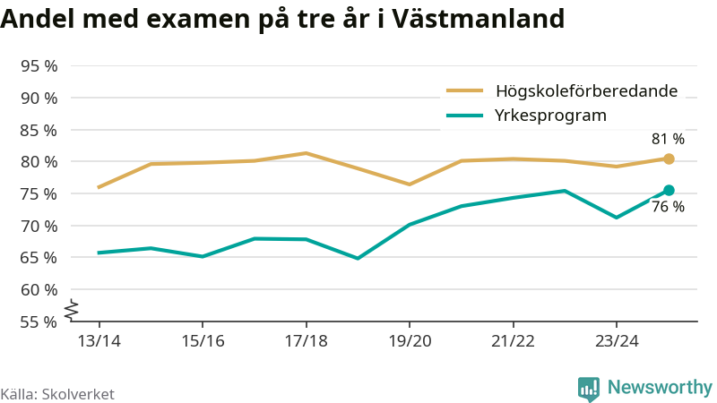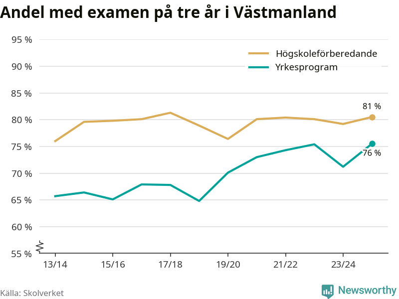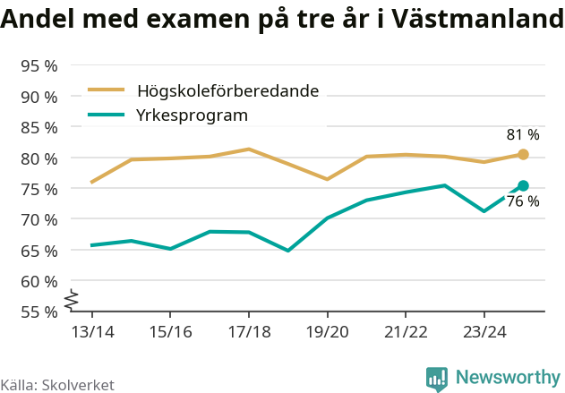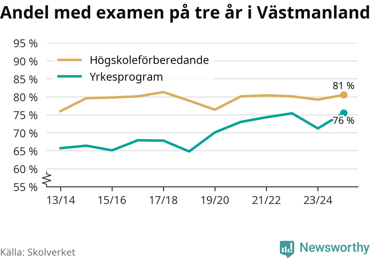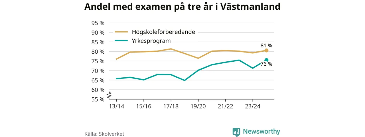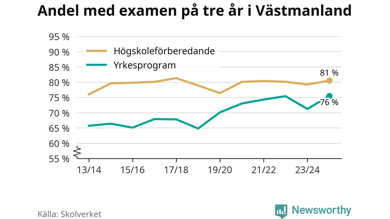 Inte sedan åtminstone läsåret 2013/14 har andelen elever som klarat gymnasieexamen på yrkesprogram varit högre i Västmanland. Det visar Skolverkets senaste statistik.