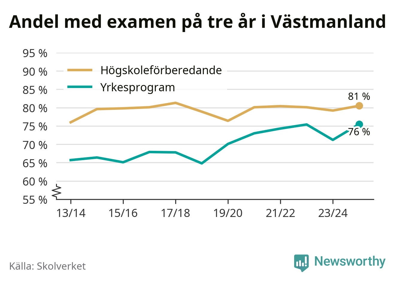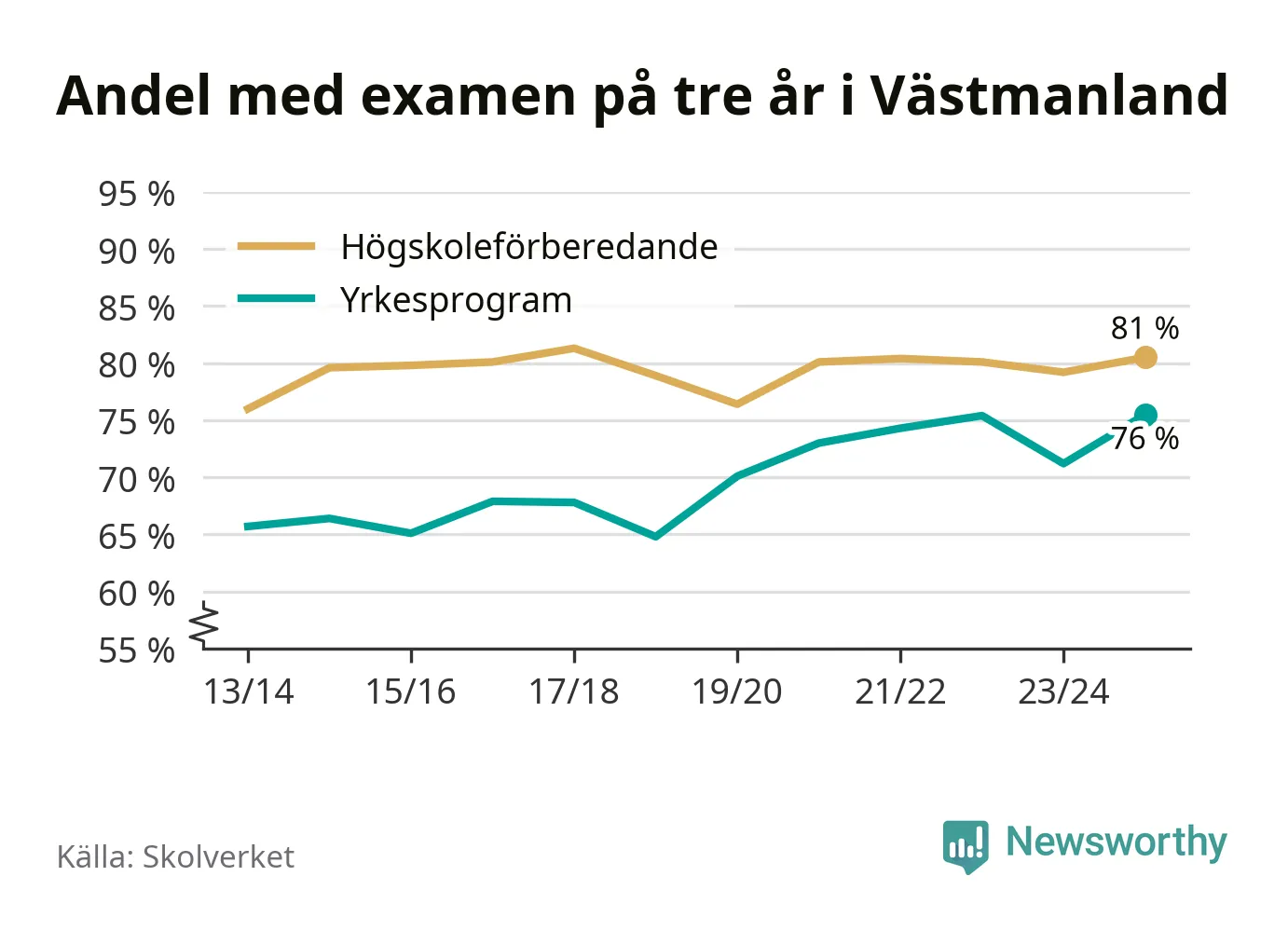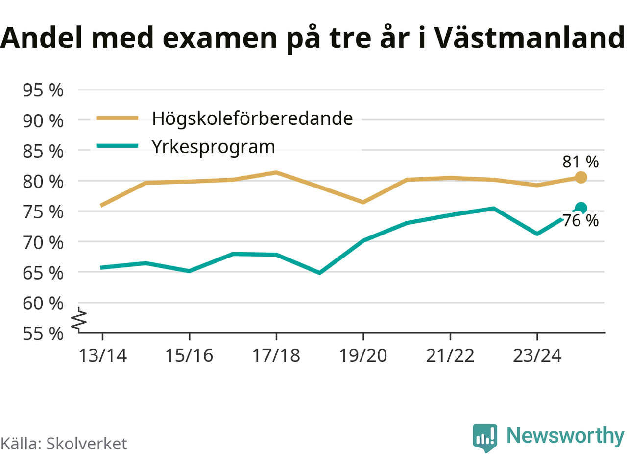 Enligt Skolverket är den främsta anledningen att andelen elever som har avbrutit eller förlängt sina gymnasiestudier minskat. Samtidigt har fler elever på högskoleförberedande program blivit godkända på gymnasiearbetet.