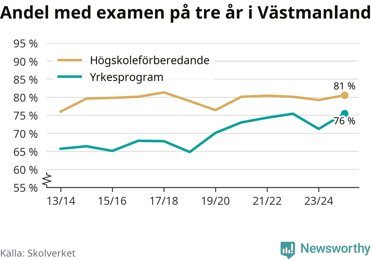I riket som helhet ökade andelen som tog gymnasieexamen på tre år, både för högskoleförberedande och yrkesprogram. I våras var det 82,6 respektive 75,9 procent som klarade examen på tre år.
