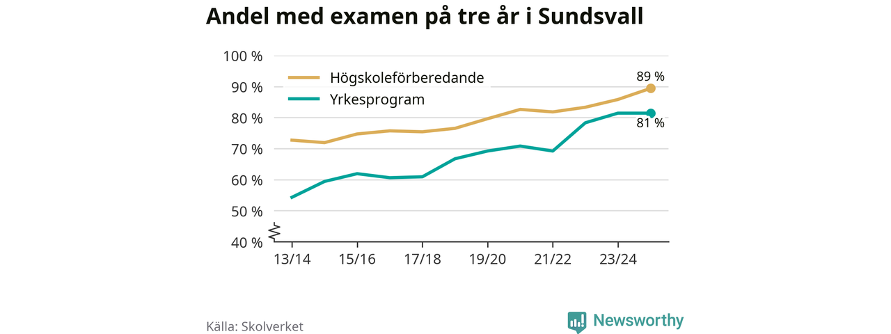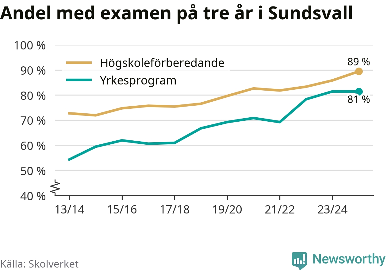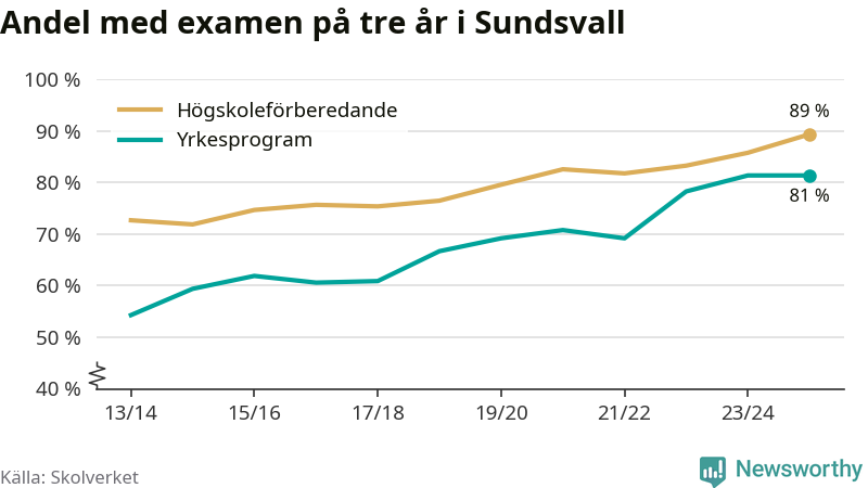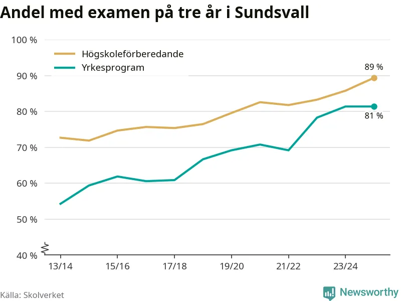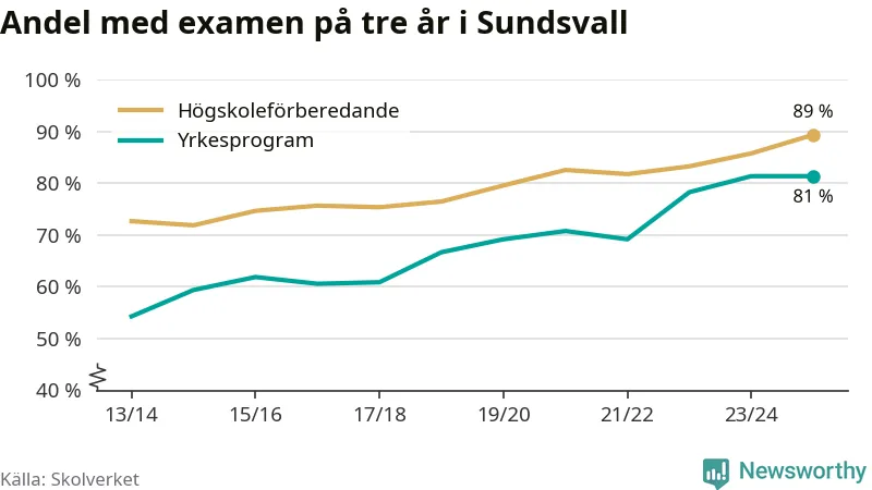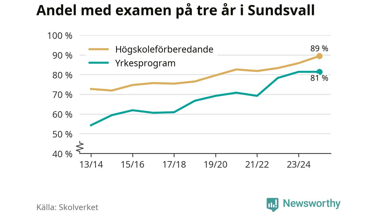Inte sedan åtminstone läsåret 2013/14 har andelen elever som klarat gymnasieexamen på högskoleförberedande program varit högre i Sundsvall. Det visar Skolverkets senaste statistik.