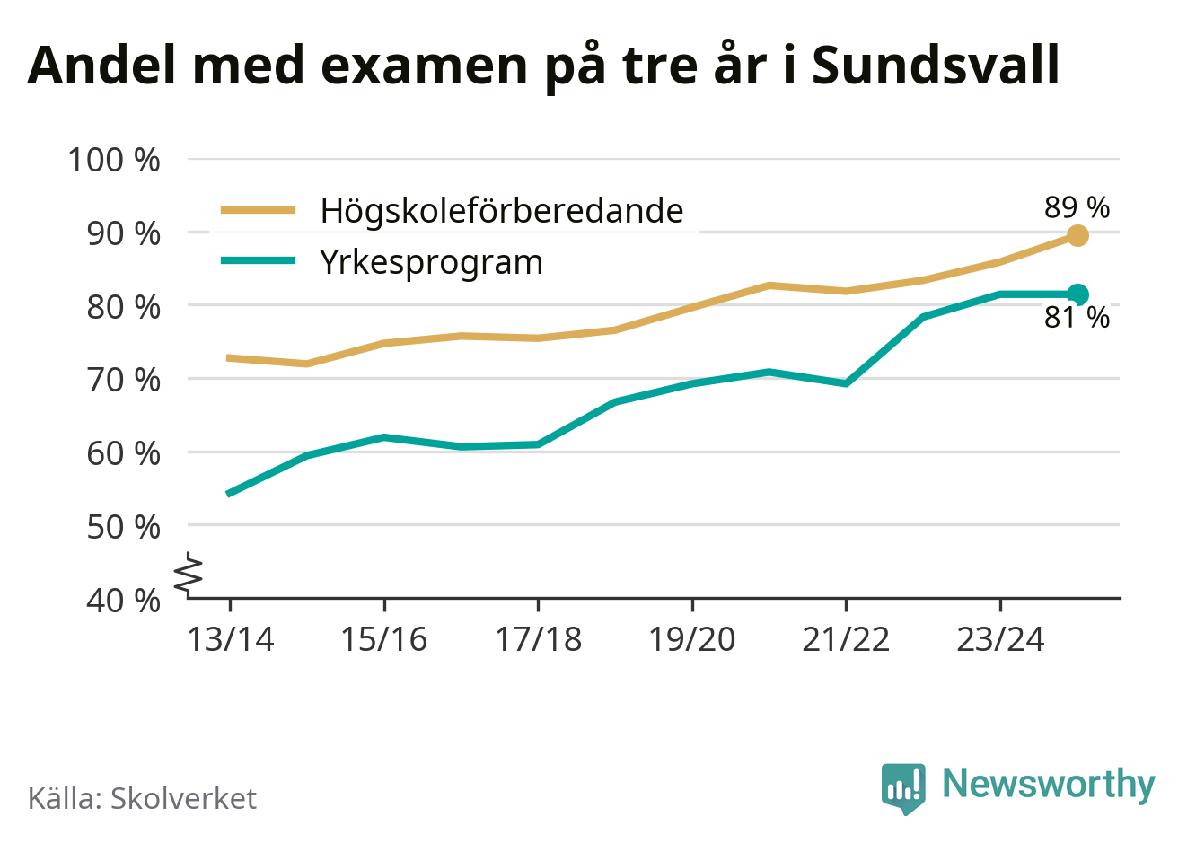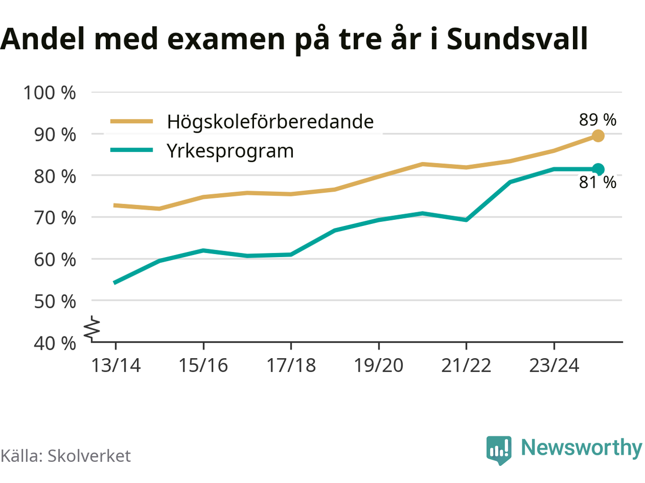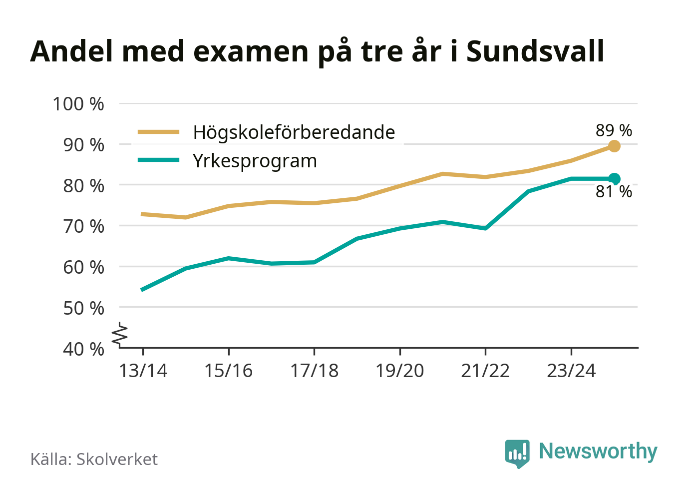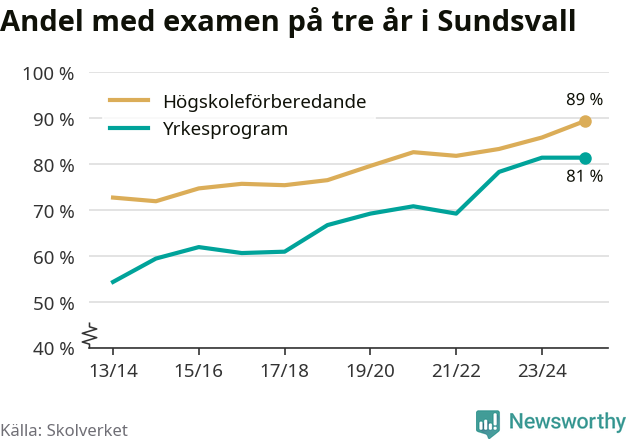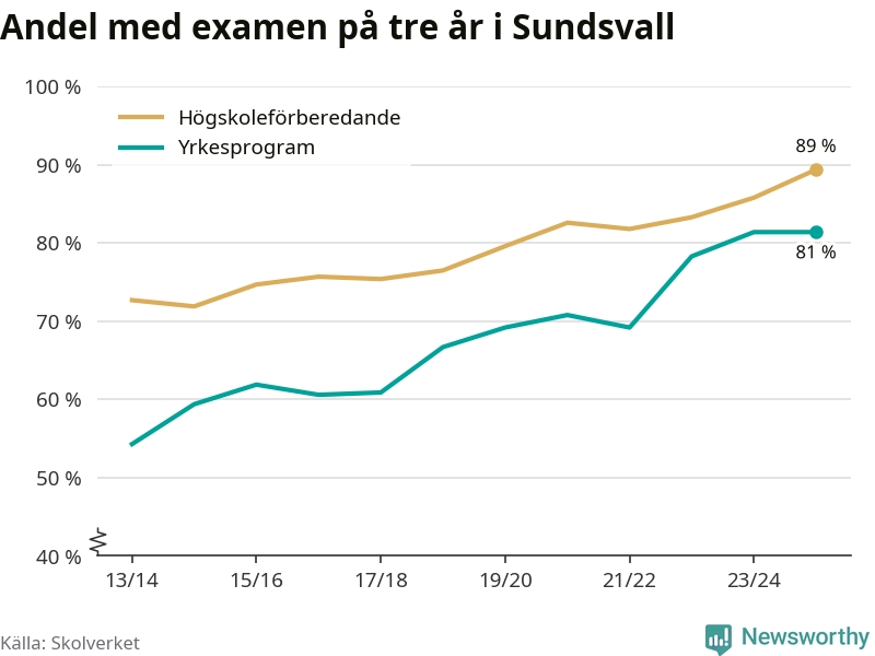 Inte sedan åtminstone läsåret 2013/14 har andelen elever som klarat gymnasieexamen på högskoleförberedande program varit högre i Sundsvall. Det visar Skolverkets senaste statistik.