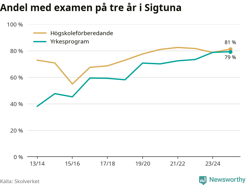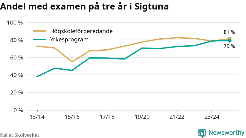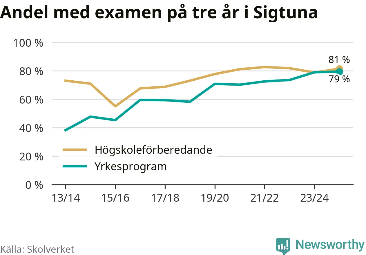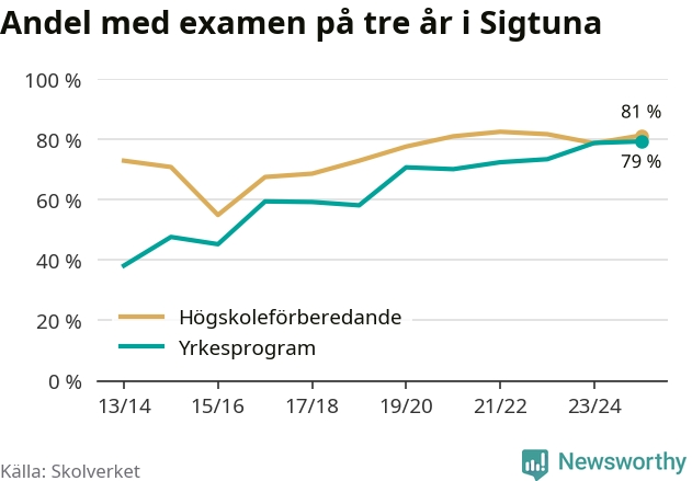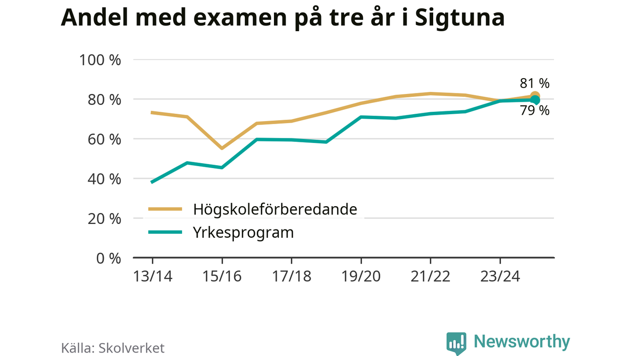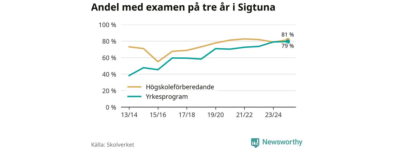 Inte sedan åtminstone läsåret 2013/14 har andelen elever som klarat gymnasieexamen på yrkesprogram varit högre i Sigtuna. Det visar Skolverkets senaste statistik.