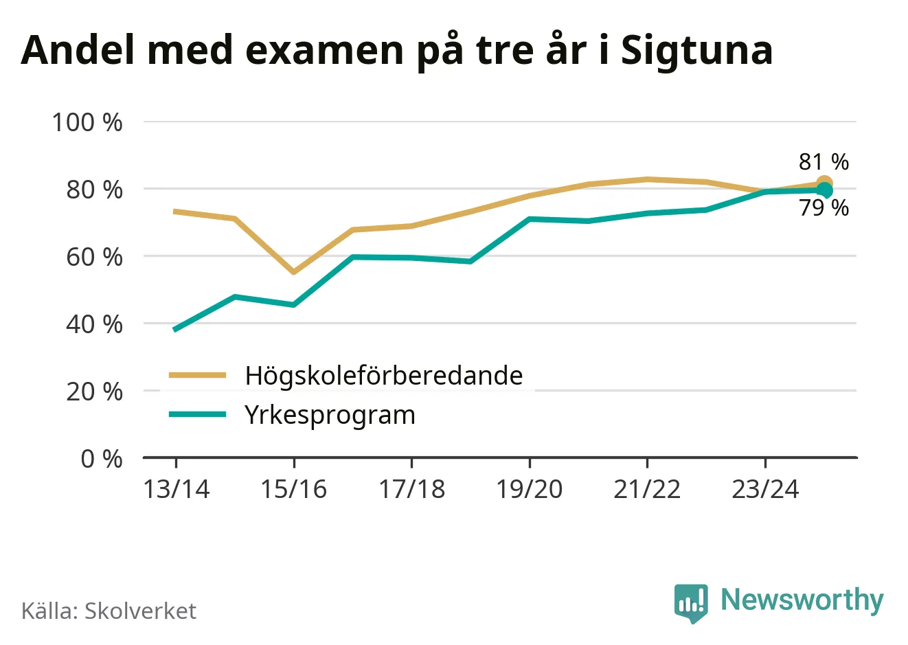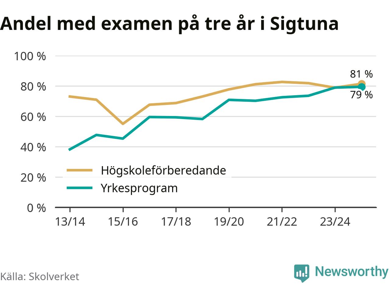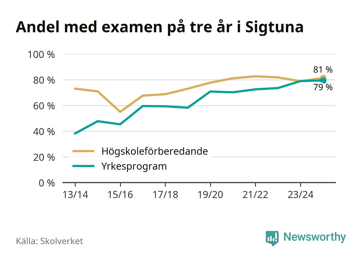 Inte sedan åtminstone läsåret 2013/14 har andelen elever som klarat gymnasieexamen på yrkesprogram varit högre i Sigtuna. Det visar Skolverkets senaste statistik.