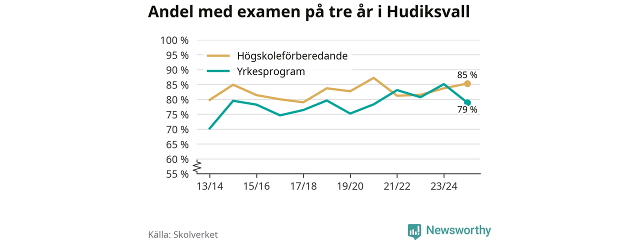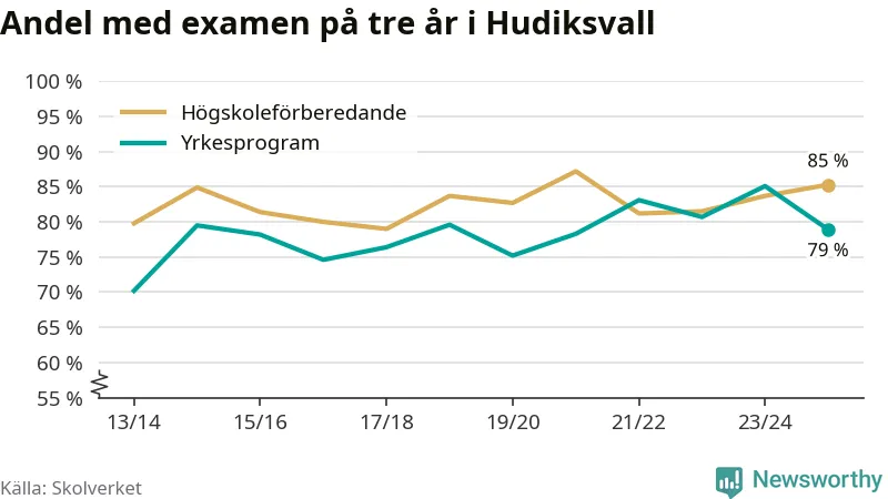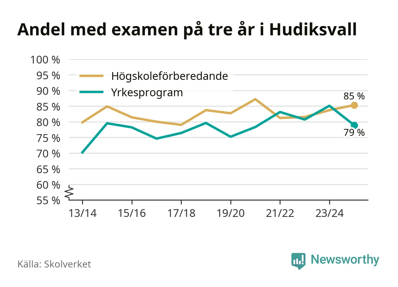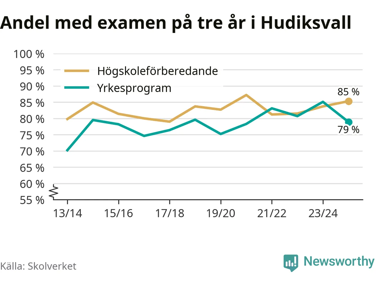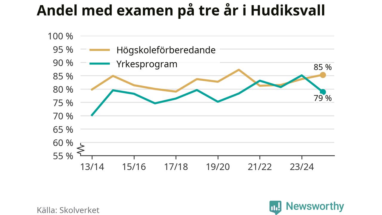 Medan andelen elever som klarade gymnasieexamen på yrkesprogram på tre år ökade i riket som helhet, minskade andelen i Hudiksvall något. Här är resultaten – skola för skola.