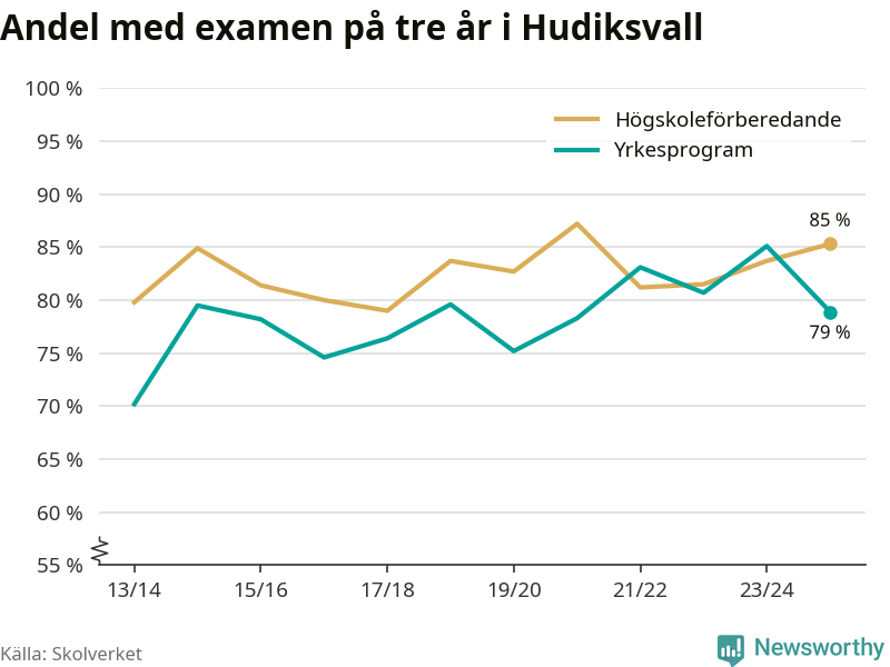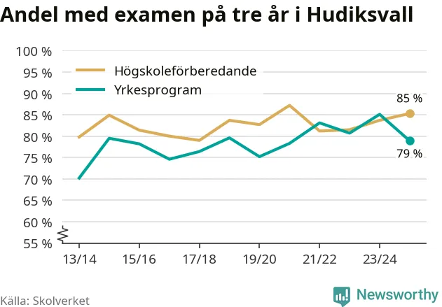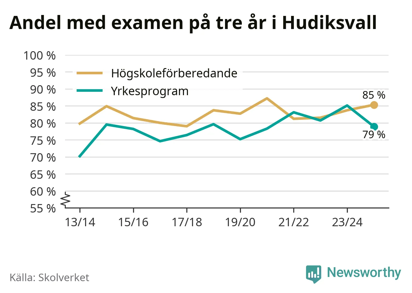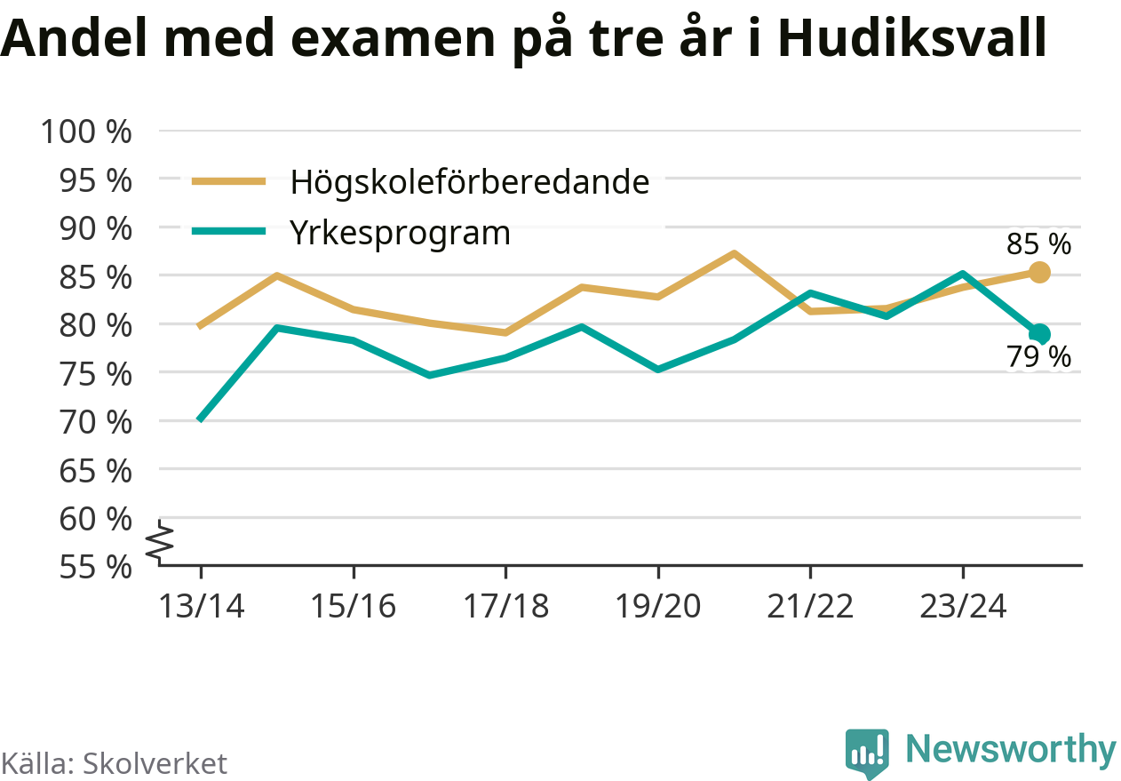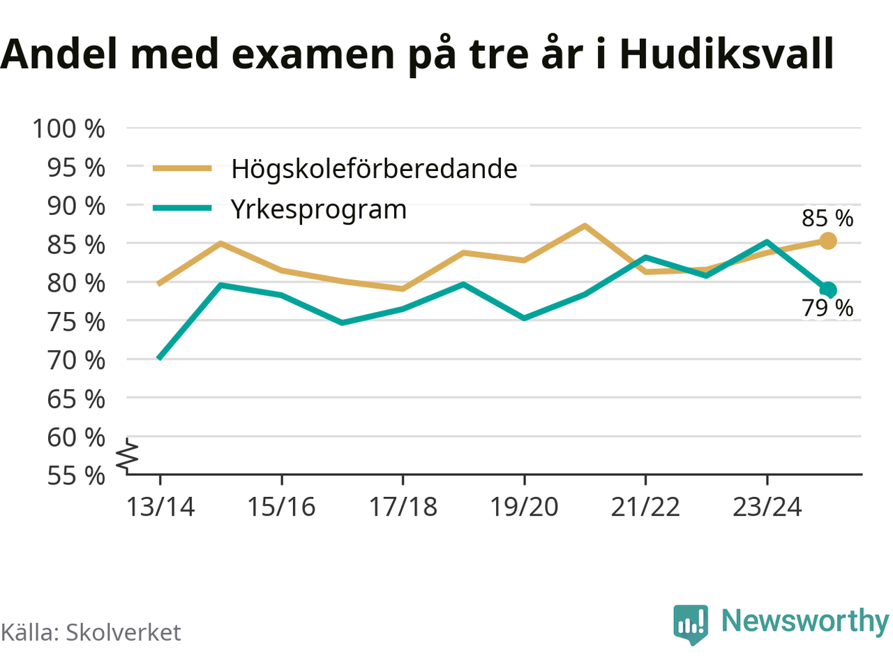 Medan andelen elever som klarade gymnasieexamen på yrkesprogram på tre år ökade i riket som helhet, minskade andelen i Hudiksvall något. Här är resultaten – skola för skola.