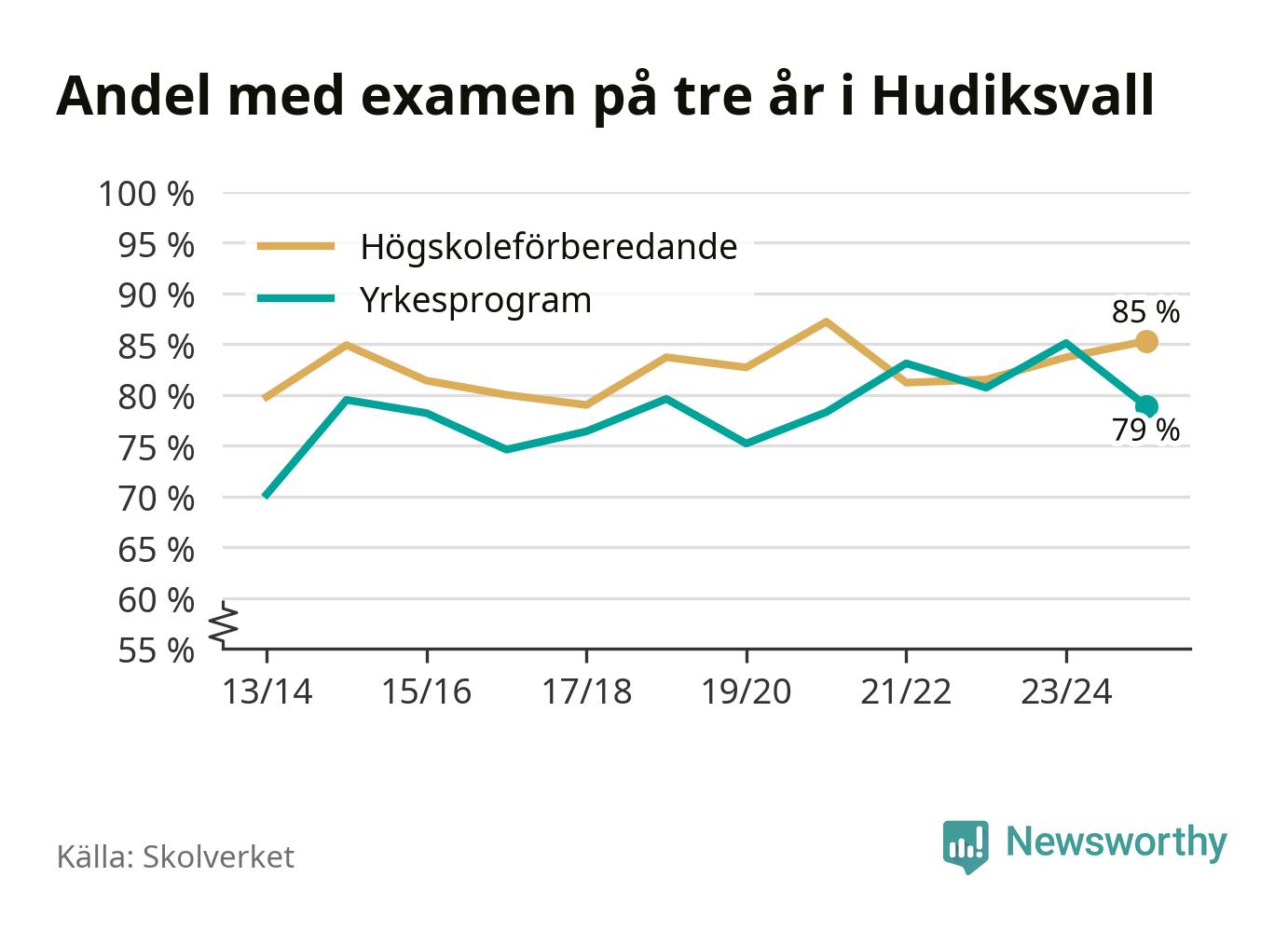 Högst andel som klarade examen i Hudiksvalls kommun, de nationella programmen sammantaget, fanns på Hudikgymnasiet, där eleverna läser på ekonomiprogrammet, estetiska programmet eller samhällsvetenskapsprogrammet. Där klarade 93 procent av de 27 elever som började gymnasiet 2022/23 examen i våras. Det är en högre siffra än i riket som helhet.
