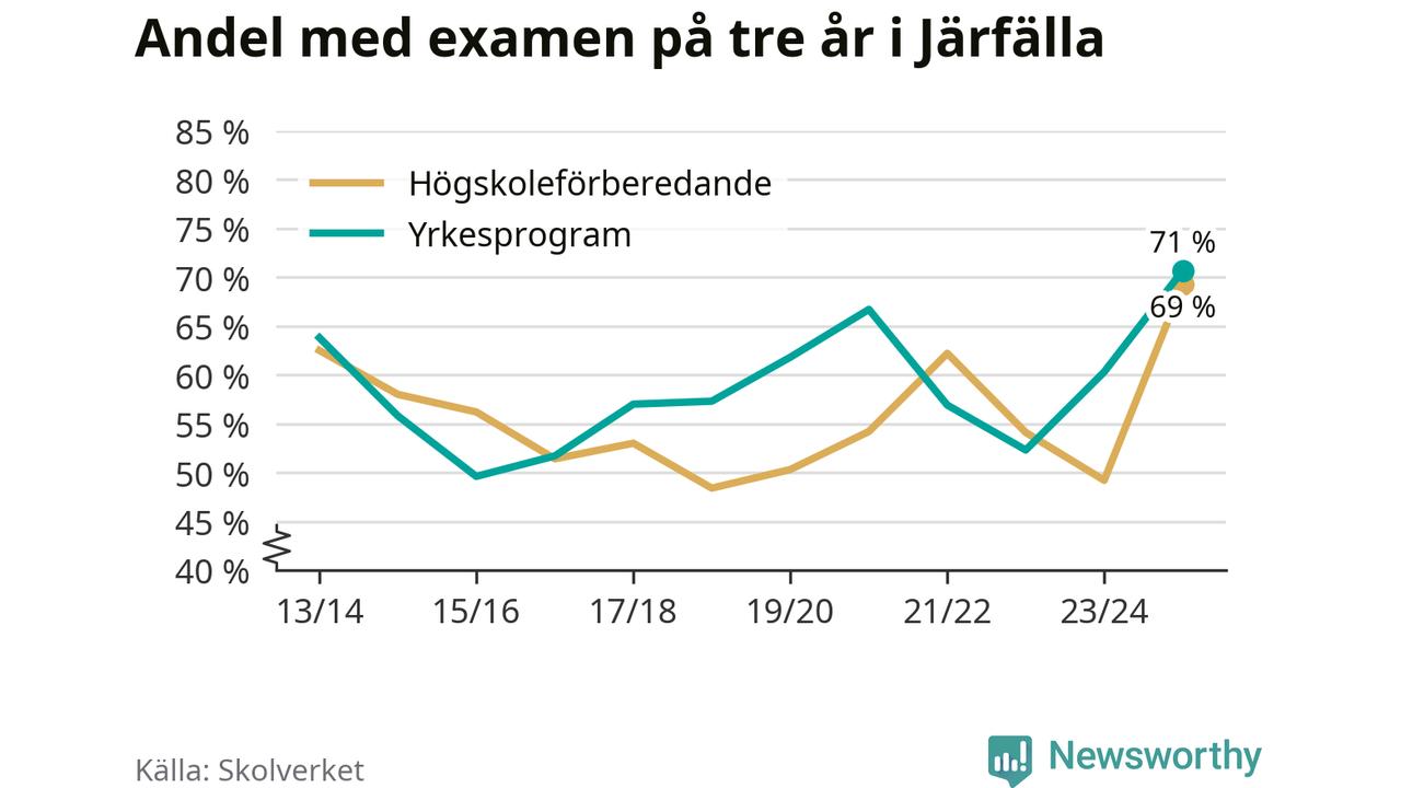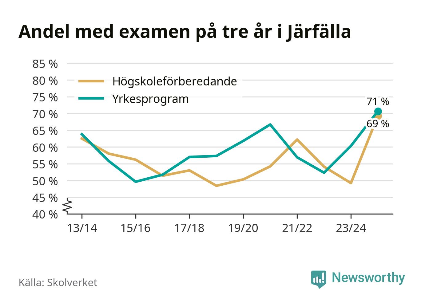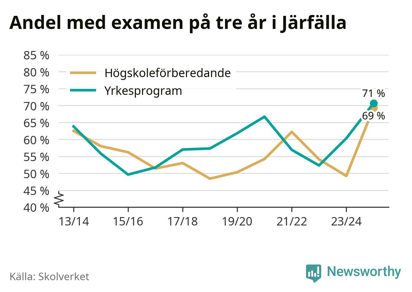 Bland deras kamrater på högskoleförberedande program hade 69 procent klarat examen på tre år – vilket är 20 procentenheter mer än året innan. Det är även det den högsta andelen sedan åtminstone läsåret 2013/14.