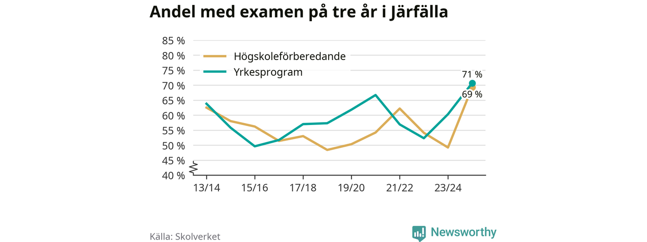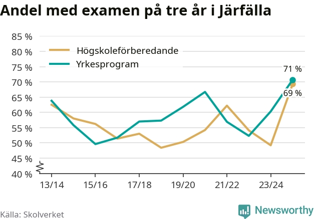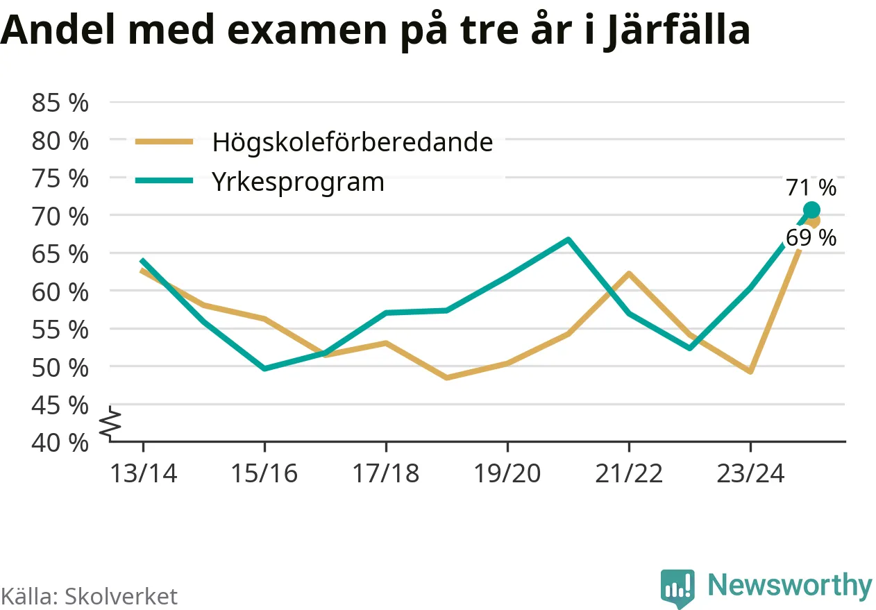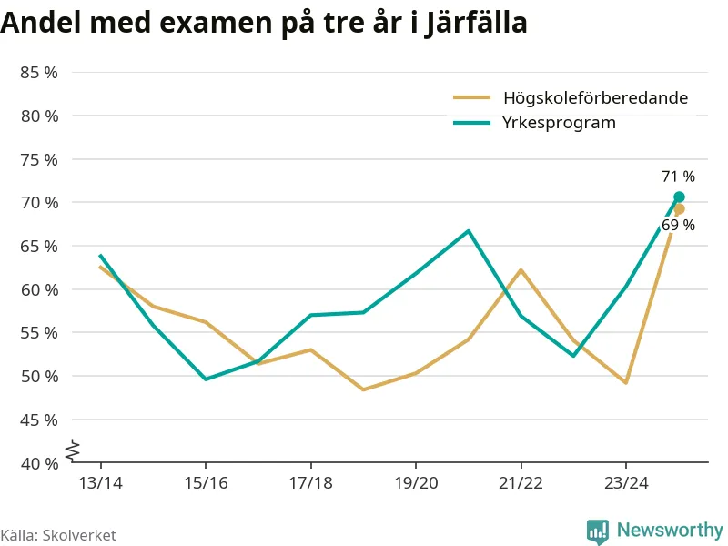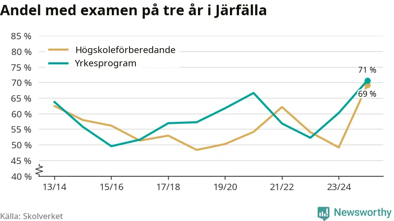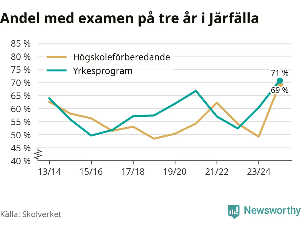 Bland deras kamrater på högskoleförberedande program hade 69 procent klarat examen på tre år – vilket är 20 procentenheter mer än året innan. Det är även det den högsta andelen sedan åtminstone läsåret 2013/14.