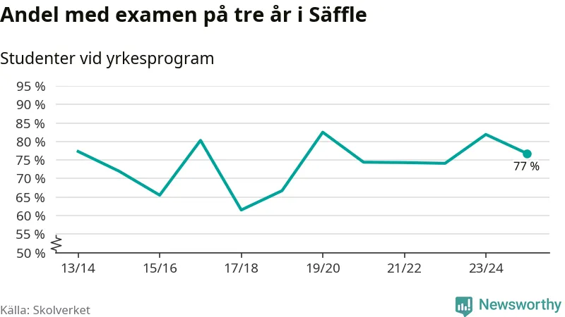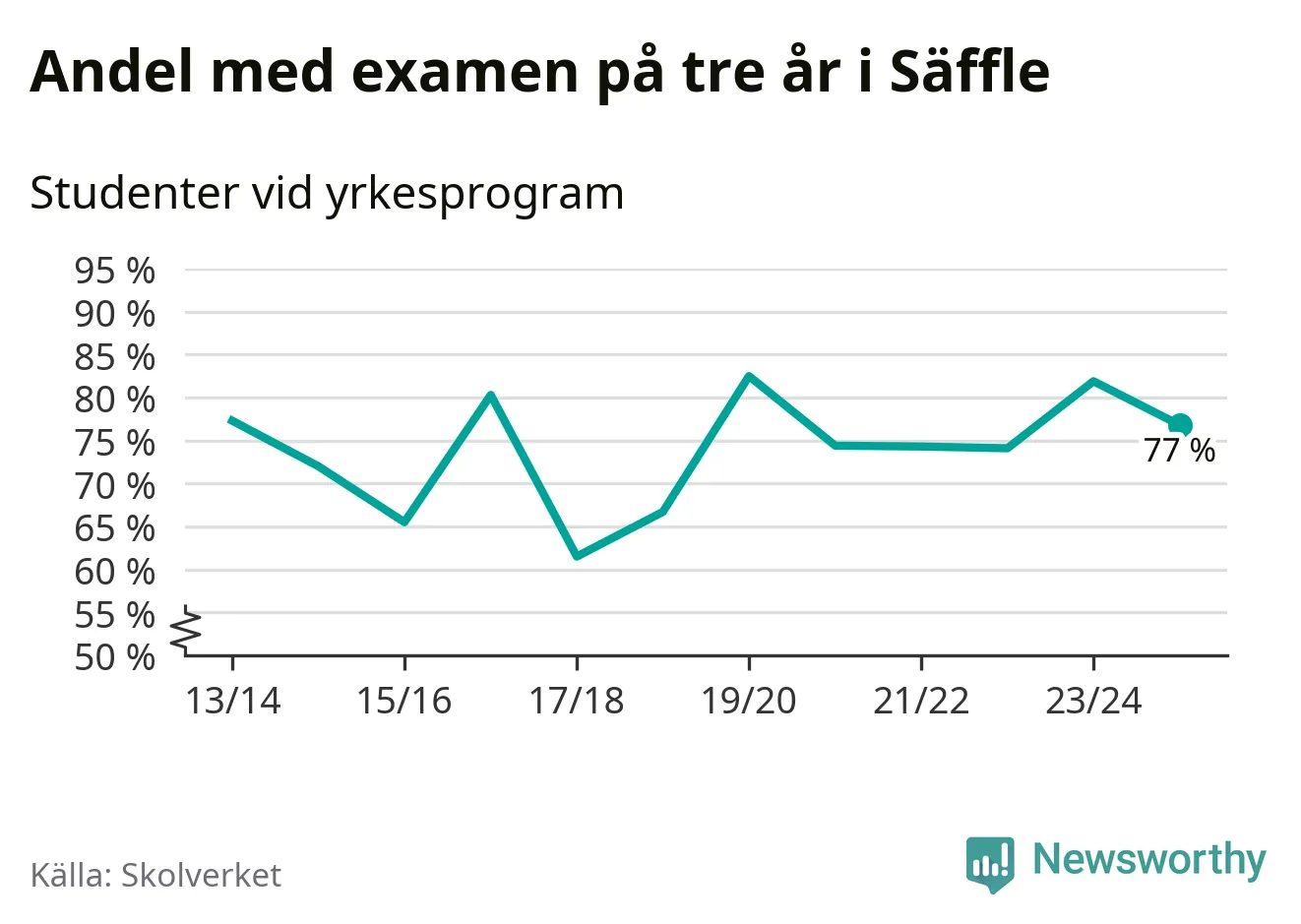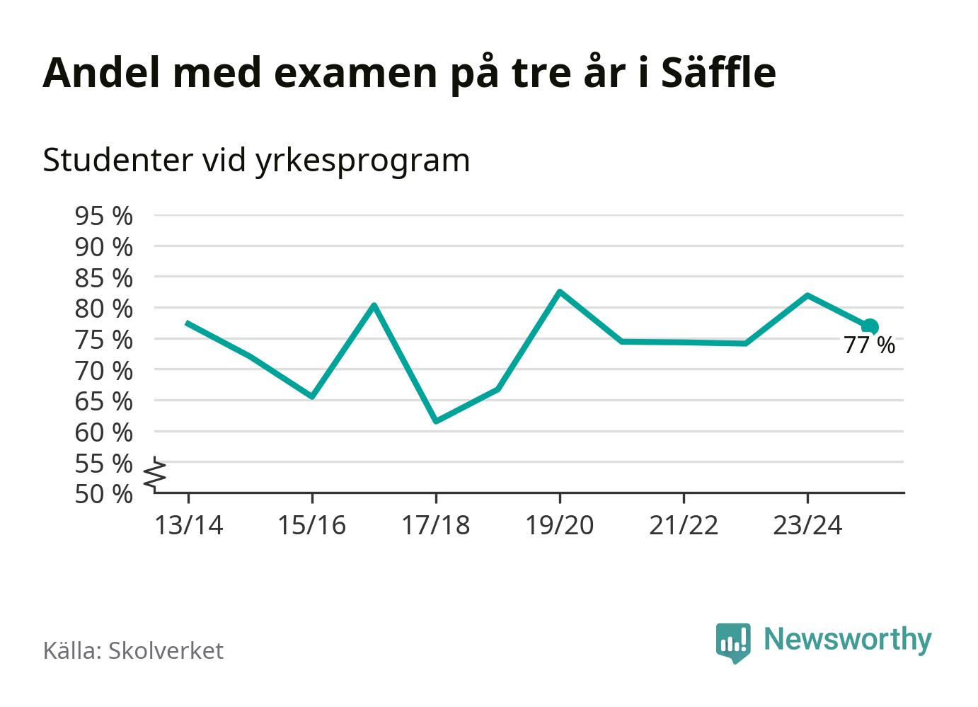 Medan andelen elever som klarade gymnasieexamen på tre år ökade i riket som helhet, minskade andelen i Säffle något. Det visar Skolverkets senaste statistik.